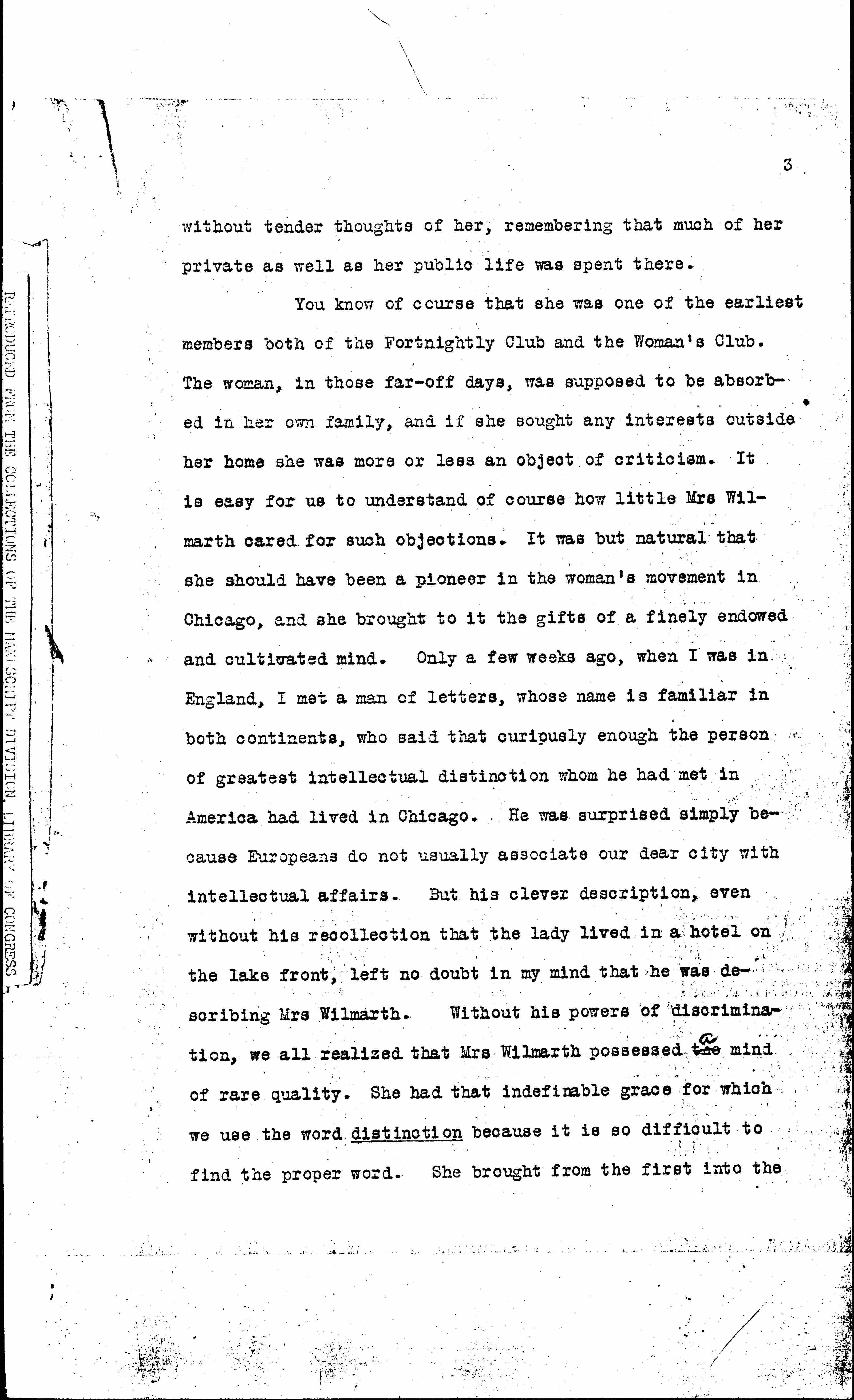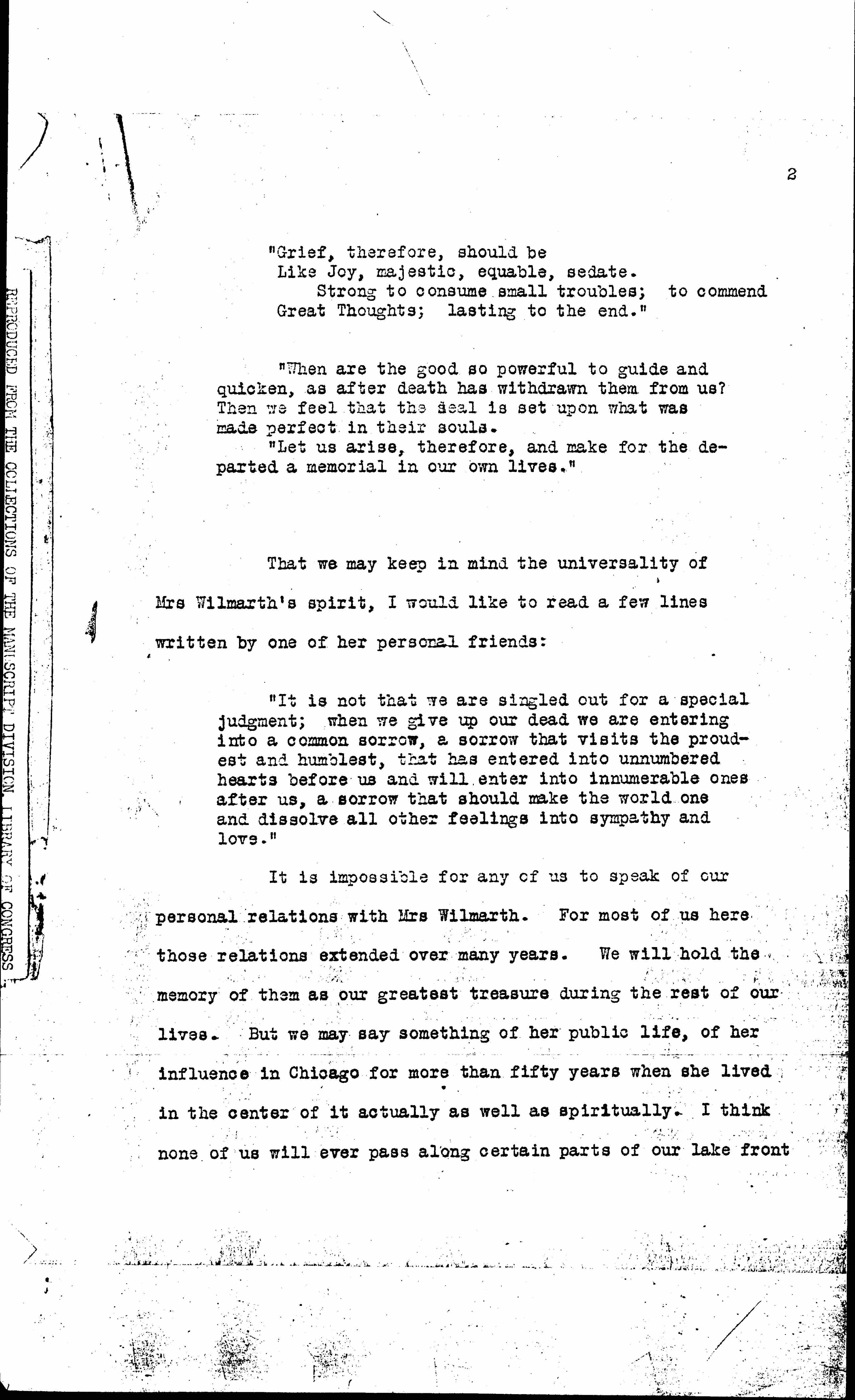 It is impossible for any of us to speak of our personal relations with Mrs Wilmarth. For most of us here those relations extended over many years. We will hold the memory of them as our greatest treasure during the rest of our lives. But we may say something of her public life, of her influence in Chicago for more than fifty years when she lived in the center of it actually as well as spiritually. I think none of us will ever pass along certain parts of our lake front [page 3] without tender thoughts of her, remembering that much of her private as well as her public life was spent there.
