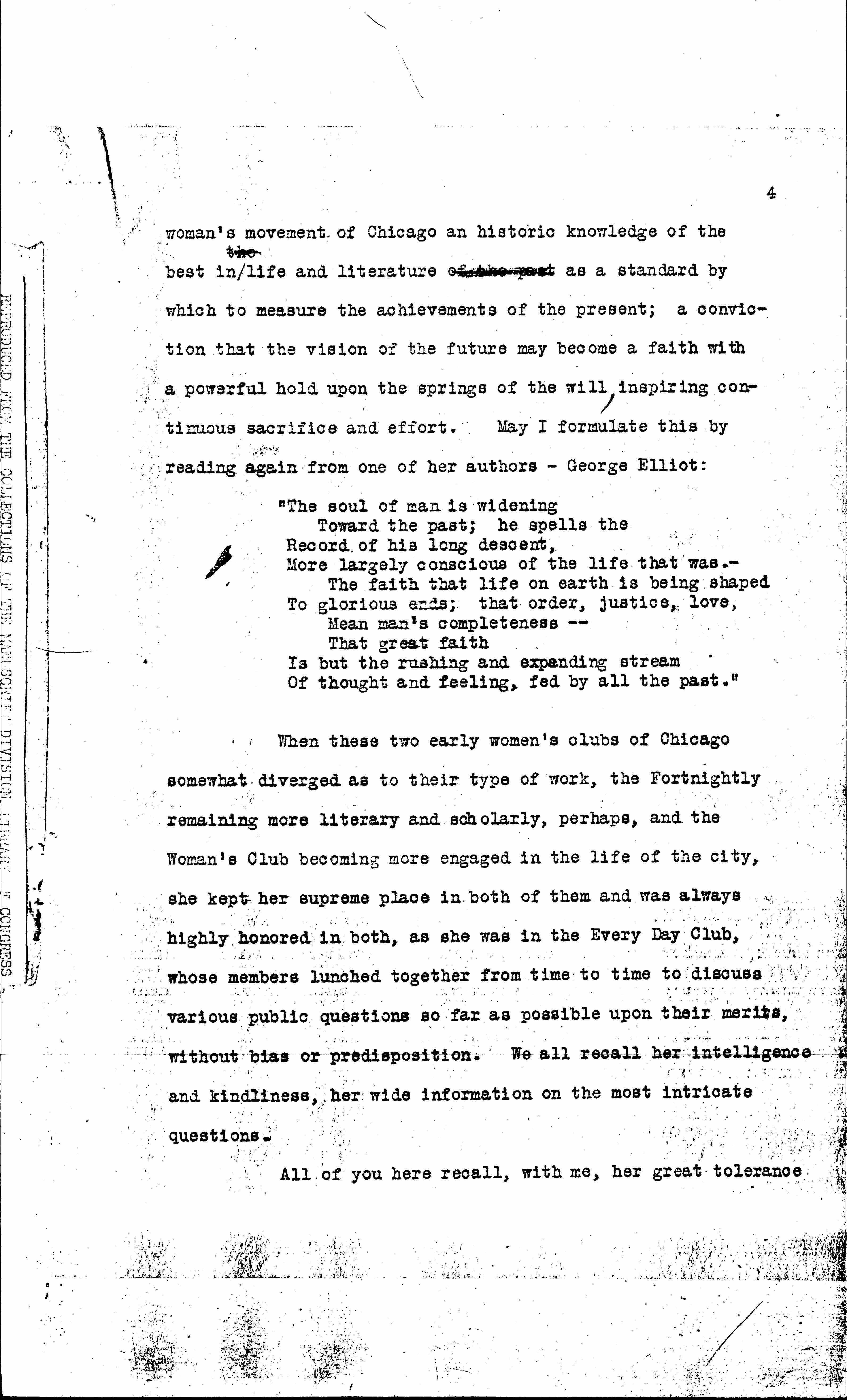 You know of course that she was one of the earliest members both of the Fortnightly Club and the Woman’s Club. The woman, in those far-off days, was supposed to be absorbed in her own family, and if she sought any interests outside her home she was more or less an object of criticism. It is easy for us to understand of course how little Mrs Wilmarth cared for such objections. It was but natural that she should have been a pioneer in the woman’s movement in Chicago, and she brought to it the gifts of a finely endowed and cultivated mind. Only a few weeks ago, when I was in England, I met a man of letters, whose name is familiar in both continents, who said that curiously enough the person of greatest intellectual distinction whom he had met in America had lived in Chicago. He was surprised simply because Europeans do not usually associate our dear city with intellectual affairs. But his clever description, even without his recollection that the lady lived in a hotel on the lake front, left no doubt in my mind that he was describing Mrs Wilmarth. Without his powers of discrimination, we all realized that Mrs Wilmarth possessed the ↑a↓ mind of rare quality. She had that indefinable grace for which we use the word distinction because it is so difficult to find the proper word. She brought from the first into the [page 4] woman’s movement of Chicago an historic knowledge of the best in ↑the↓ life and literature of the past as a standard by which to measure the achievements of the present; a conviction that the vision of the future may become a faith with a powerful hold upon the springs of the will, inspiring continuous sacrifice and effort. May I formulate this by reading again from one of her authors -- George Elliot: