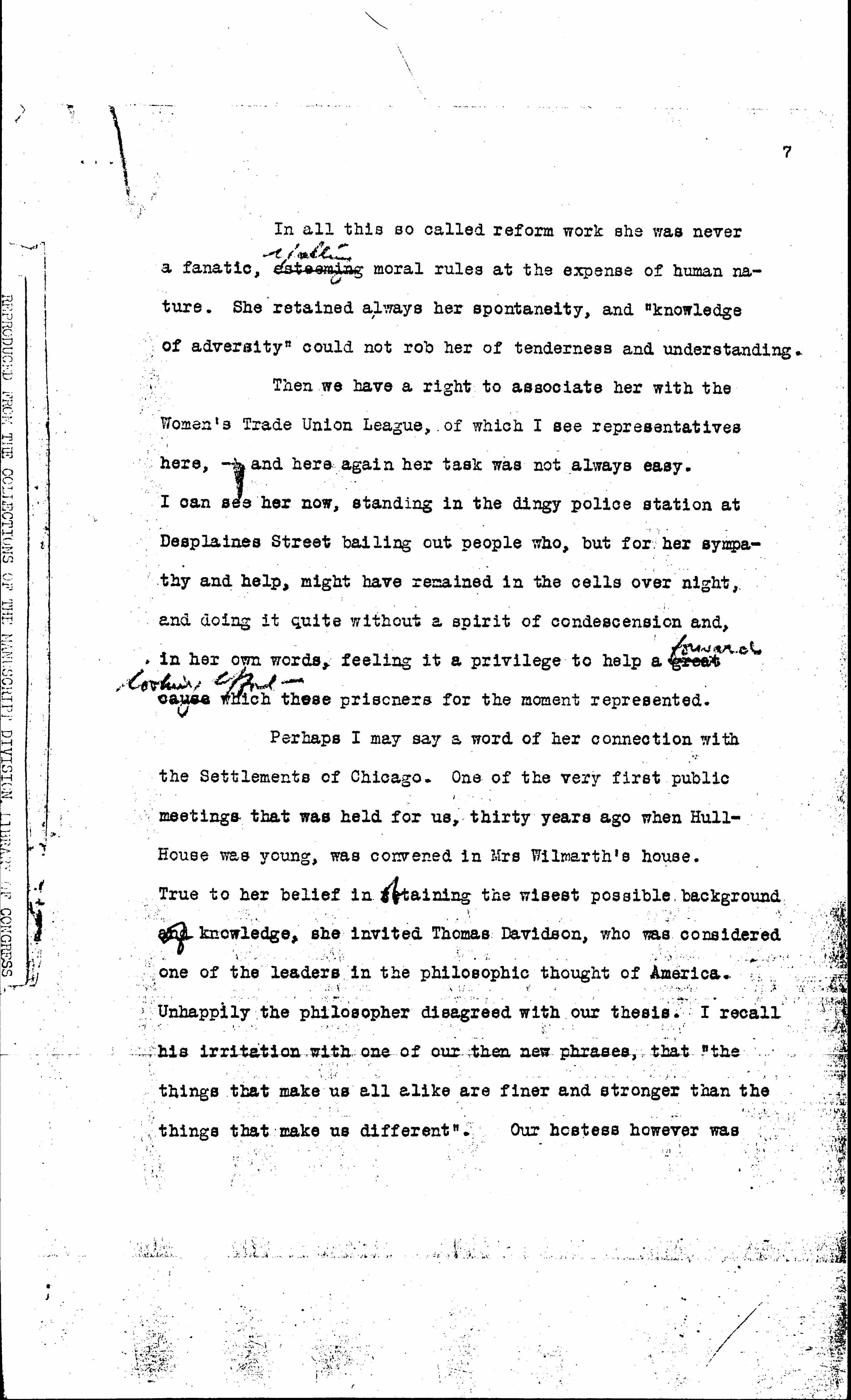 Then we have a right to associate her with the Women’s Trade Union League, of which I see representatives here, -- and here again her task was not always easy. I can see her now, standing in the dingy police station at Desplaines Street bailing out people who, but for her sympathy and help, might have remained in the cells over night, and doing it quite without a spirit of condescension and, in her own words, feeling it a privilege to help a great cause ↑forward looking effort↓ which these prisoners for the moment represented.