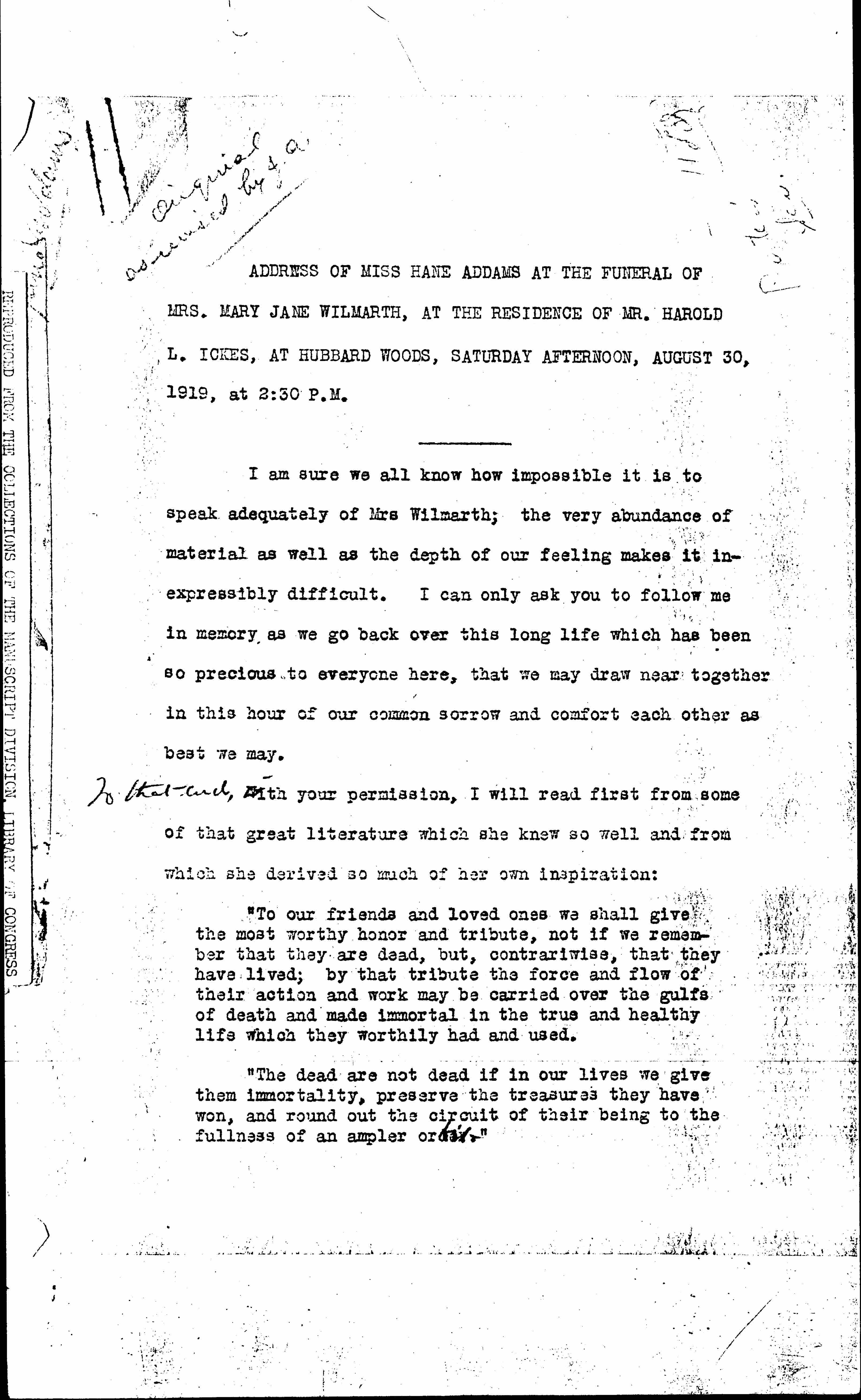 ADDRESS OF MISS JANE ADDAMS AT THE FUNERAL OF MRS. MARY JANE WILMARTH, AT THE RESIDENCE OF MR. HAROLD L. ICKES AT HUBBARD WOODS, SATURDAY AFTERNOON, AUGUST 30, 1919, at 2:30 P.M.