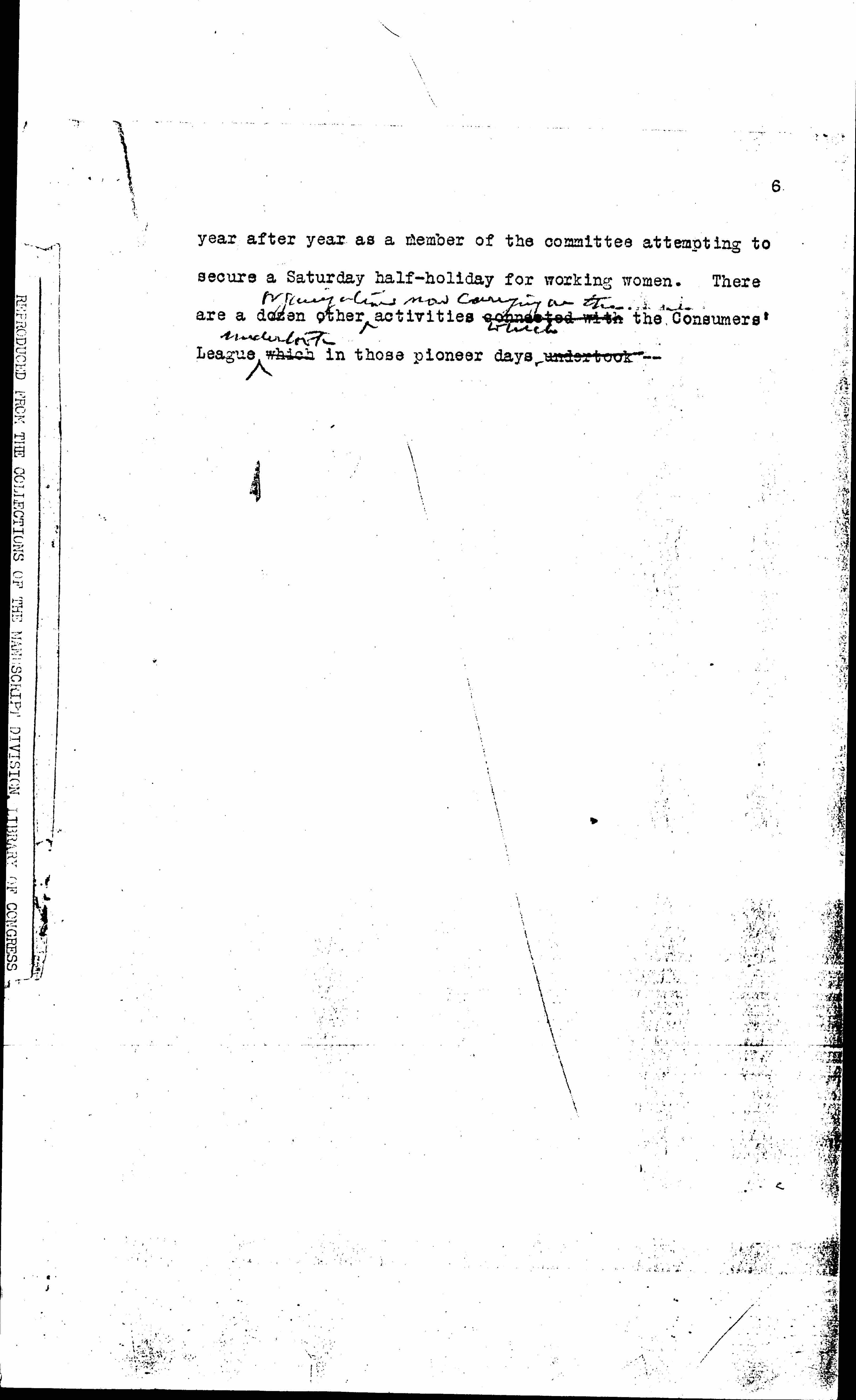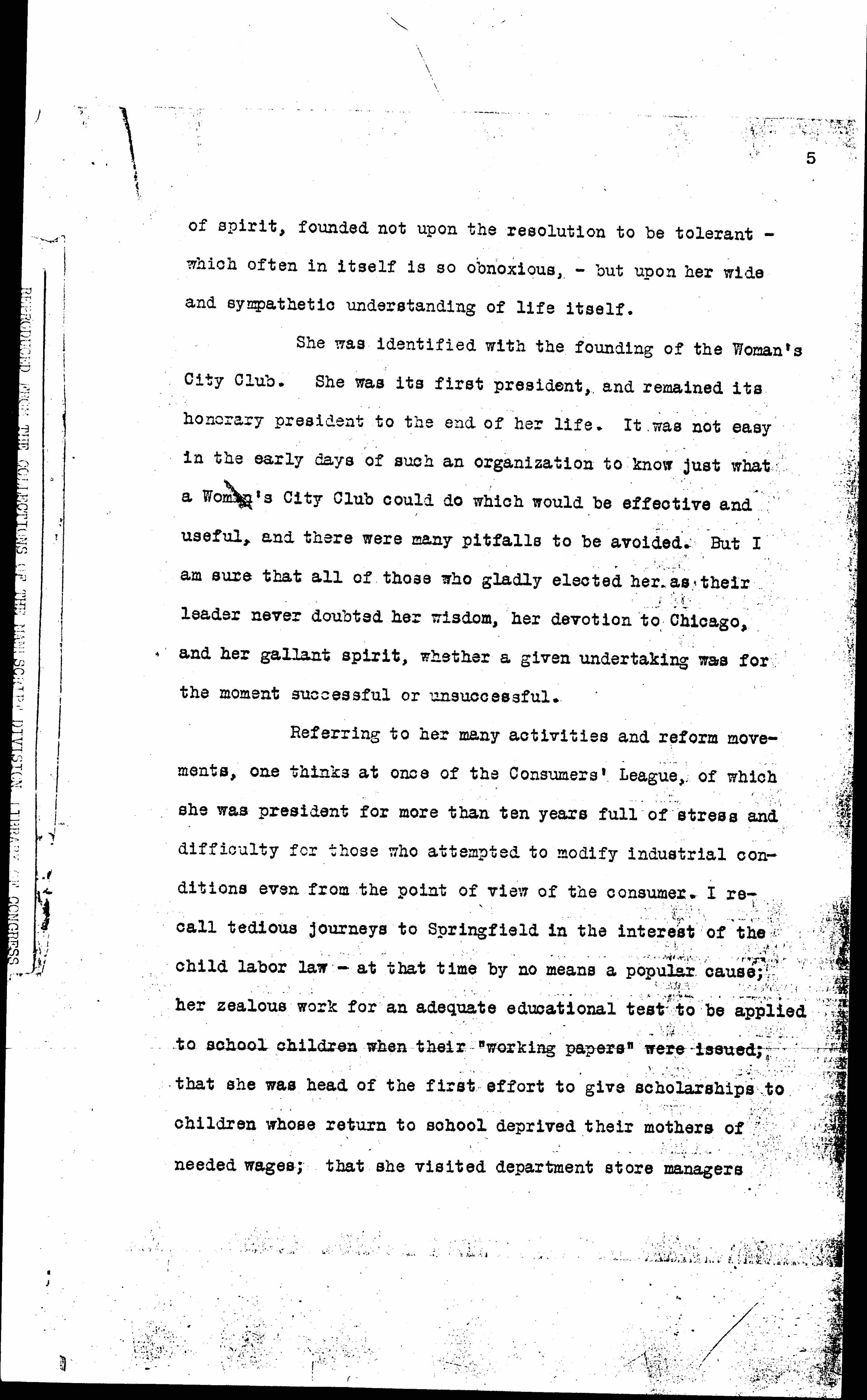 Referring to her many activities and reform movements, one thinks at once of the Consumers’ League, of which she was president for more than ten years full of stress and difficulty for those who attempted to modify industrial conditions even from the point of view of the consumer. I recall tedious journeys to Springfield in the interest of the child labor law -- at that time by no means a popular cause; her zealous work for an adequate educational test to be applied to school children when their “working papers” were issued; that she was head of the first effort to give scholarships to children whose return to school deprived their mothers of needed wages; that she visited department store managers [page 6] year after year as a member of the committee attempting to secure a Saturday half-holiday for working women. There are a dozen other ↑organizations now carrying on the↓ activities connected with ↑which↓ the Consumers’ League ↑undertook↓ which in those pioneer days undertook -- [page 7] year after year as a member of the committee attempting to secure a Saturday half-holiday for working women. There are a dozen other organizations now carrying on the activities which the Consumers’ League undertook in those pioneer days.