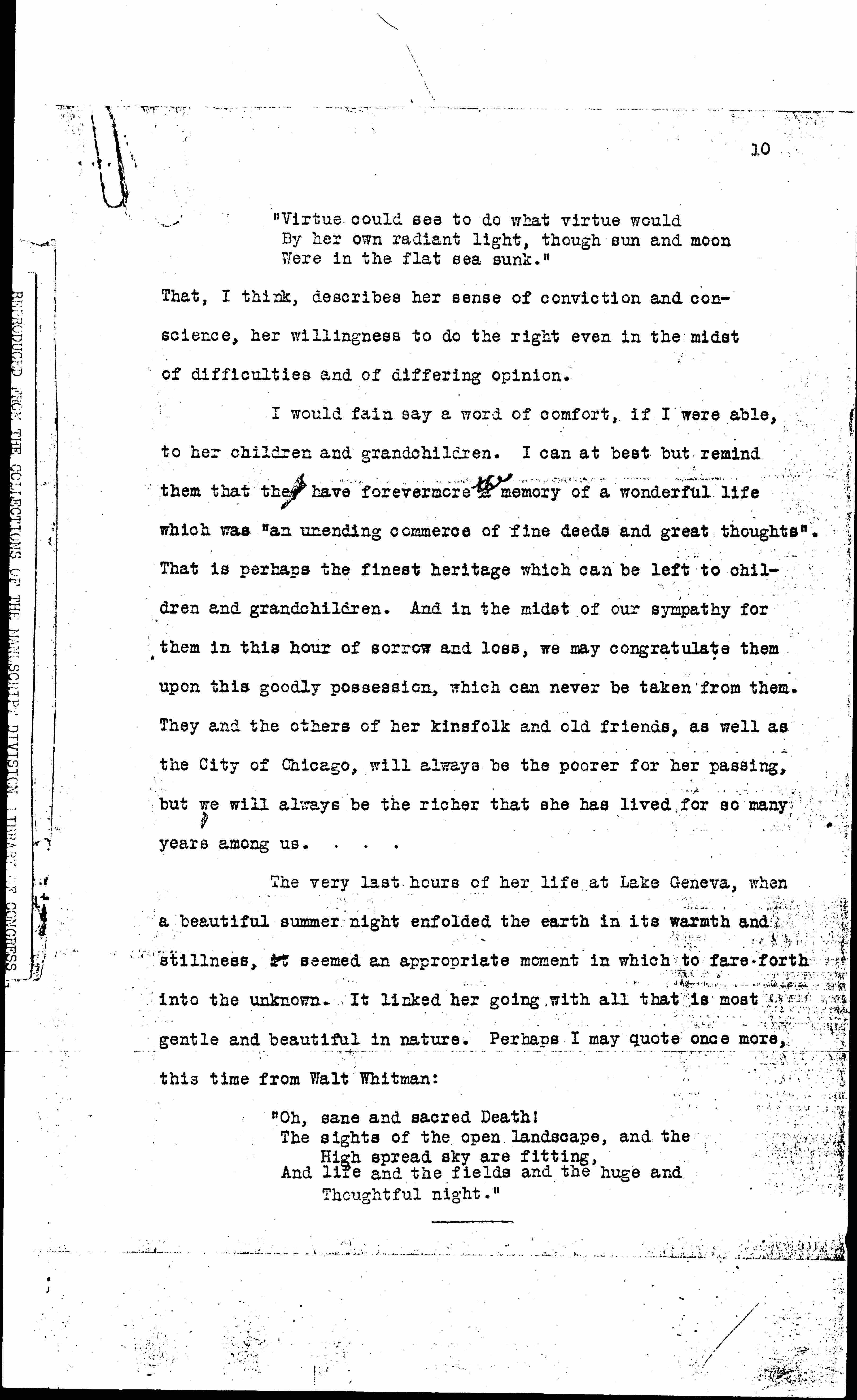 I would fain say a word of comfort, if I were able, to her children and grandchildren. I can at best but remind them that they have forevermore a ↑the↓ memory of a wonderful life which was “an unending commerce of fine deeds and great thoughts”. That is perhaps the finest heritage which can be left to children and grandchildren. And in the midst of our sympathy for them in this hour of sorrow and loss, we may congratulate them upon this goodly possession, which can never be taken from them. They and the others of her kinsfolk and old friends, as well as the City of Chicago, will always be the poorer for her passing, but we will always be the richer that she has lived for so many years among us.