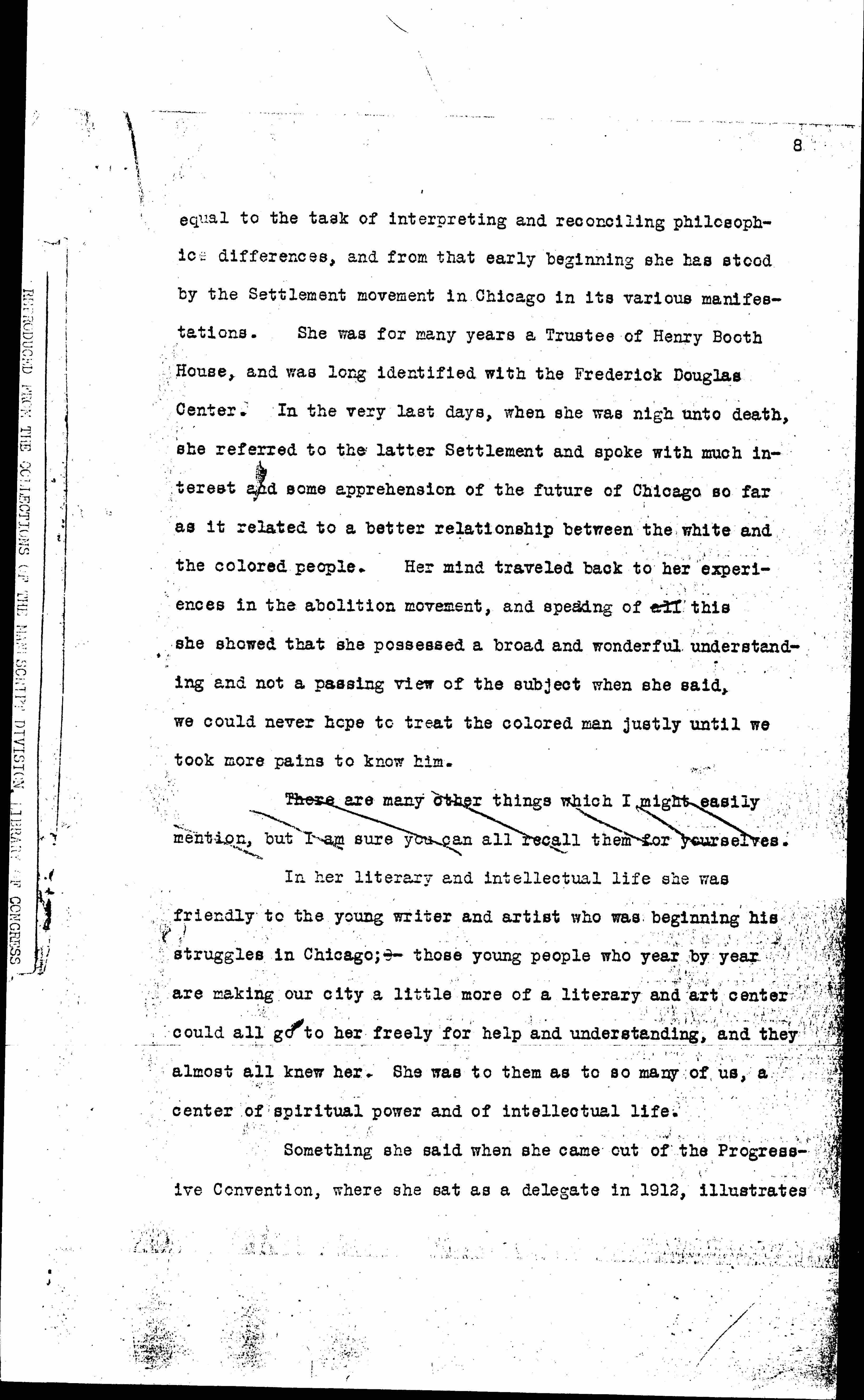 Perhaps I may say a word of her connection with the Settlements of Chicago. One of the very first public meetings that was held for us, thirty years ago when Hull-House was young, was convened in Mrs Wilmarth’s house. True to her belief in obtaining the wisest possible background and ↑of↓ knowledge, she invited Thomas Davidson, who was considered one of the leaders in the philosophic thought of America. Unhappily the philosopher disagreed with our thesis. I recall his irritation with one of our then new phrases, that “the things that make us all alike are finer and stronger than the things that make us different”. Our hostess however was [page 9] equal to the task of interpreting and reconciling philosophic differences, and from that early beginning she has stood by the Settlement movement in Chicago in its various manifestations. She was for many years a Trustee of Henry Booth House, and was long identified with the Frederick [Douglass] Center. In the very last days, when she was nigh unto death, she referred to the latter Settlement and spoke with much interest and some apprehension of the future of Chicago so far as it related to a better relationship between the white and the colored people. Her mind traveled back to her experiences in the abolition movement, and speaking of all this she showed that she possessed a broad and wonderful understanding and not a passing view of the subject when she said, we could never hope to treat the colored man justly until we took more pains to know him.