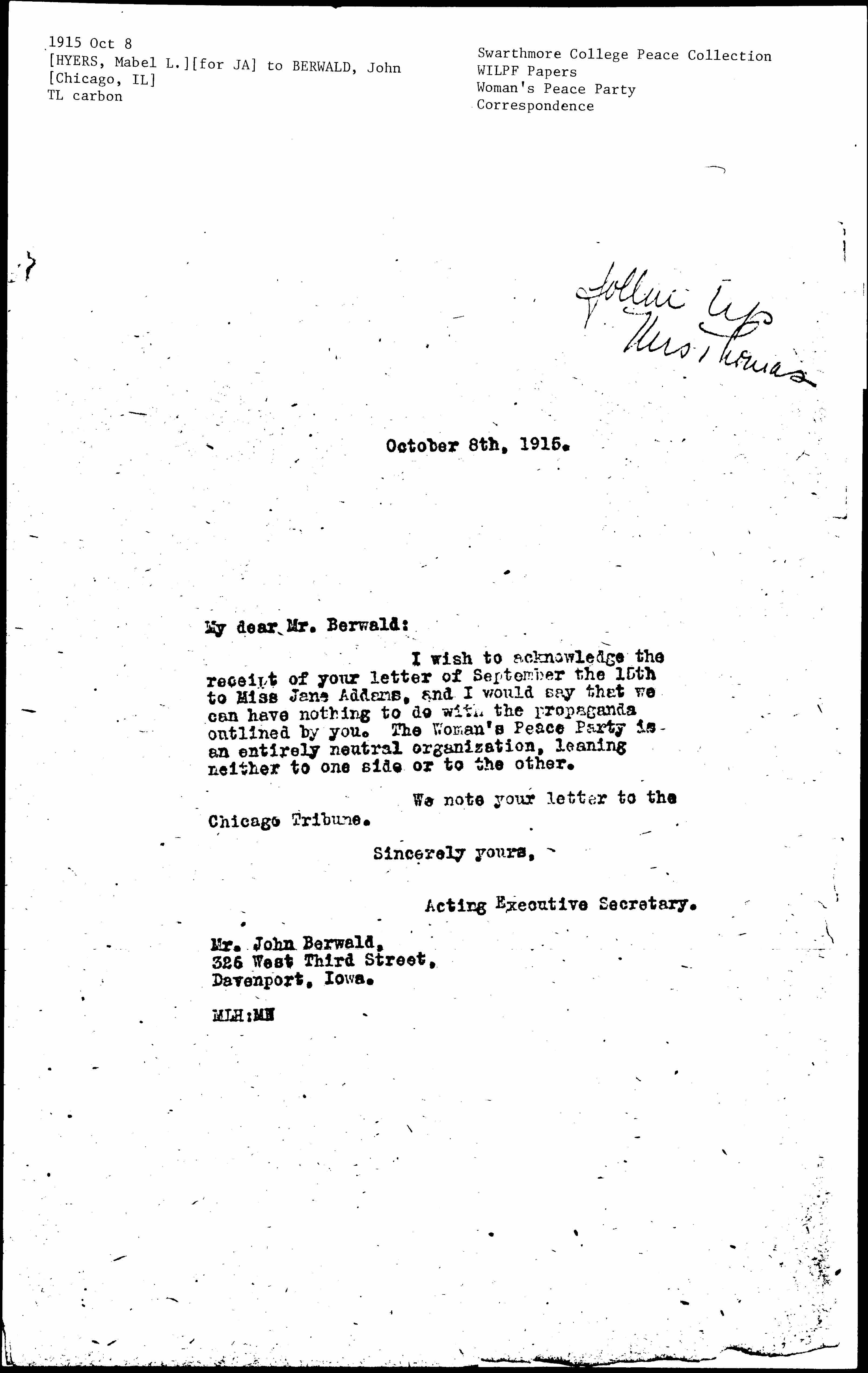 I wish to acknowledge the receipt of your letter of September the 15th to Miss Jane Addams, and I would say that we can have nothing to do with the propaganda outlined by you. The Woman's Peace Party is an entirely neutral organization, leaning neither to one side or to the other.