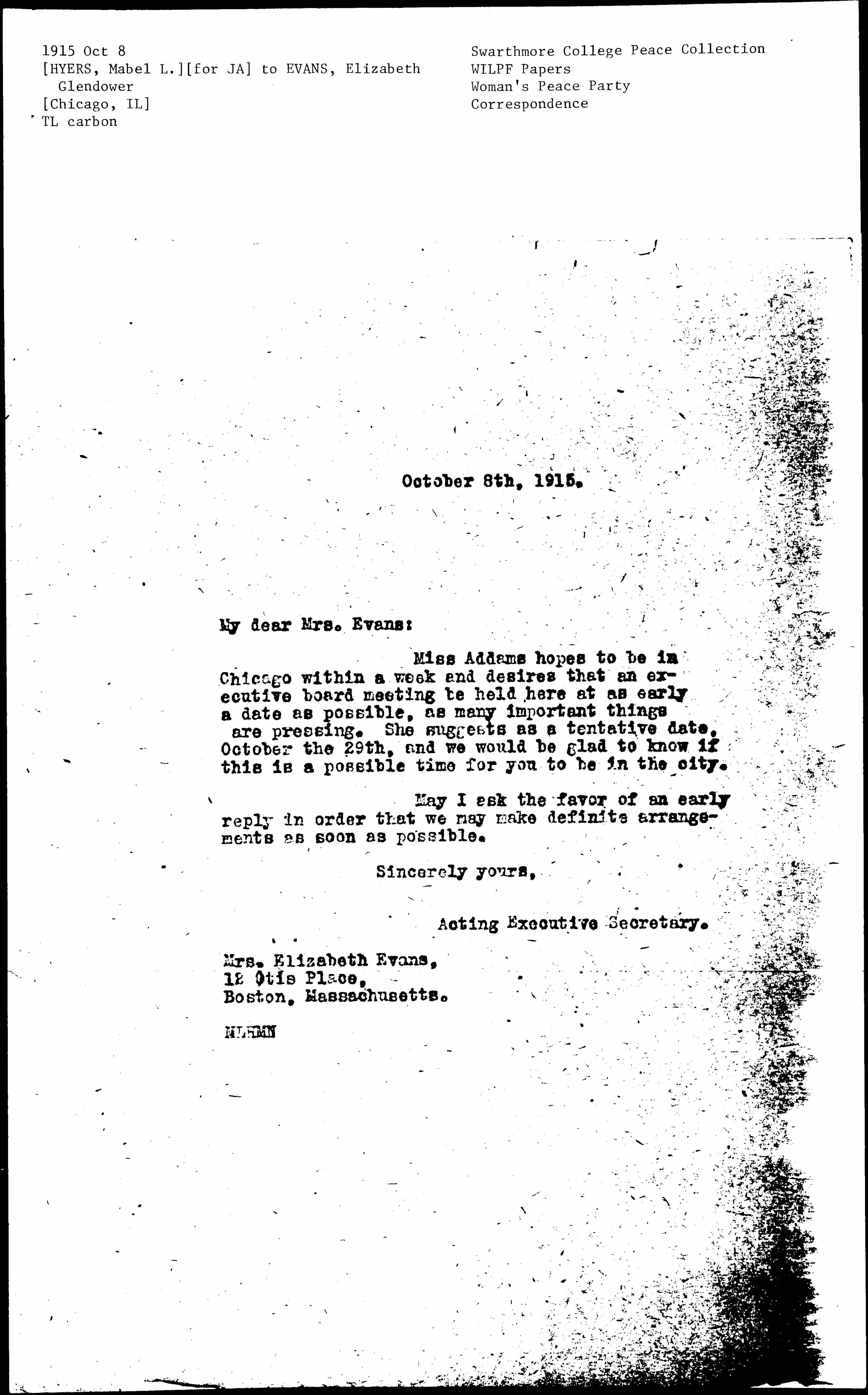 Miss Addams hopes to be in Chicago within a week and desires that an executive board meeting be held here at as early a date as possible, as many important things are pressing. She suggests as a tentative date, October the 29th, and we would be glad to know if this is a possible time for you to be in the city.