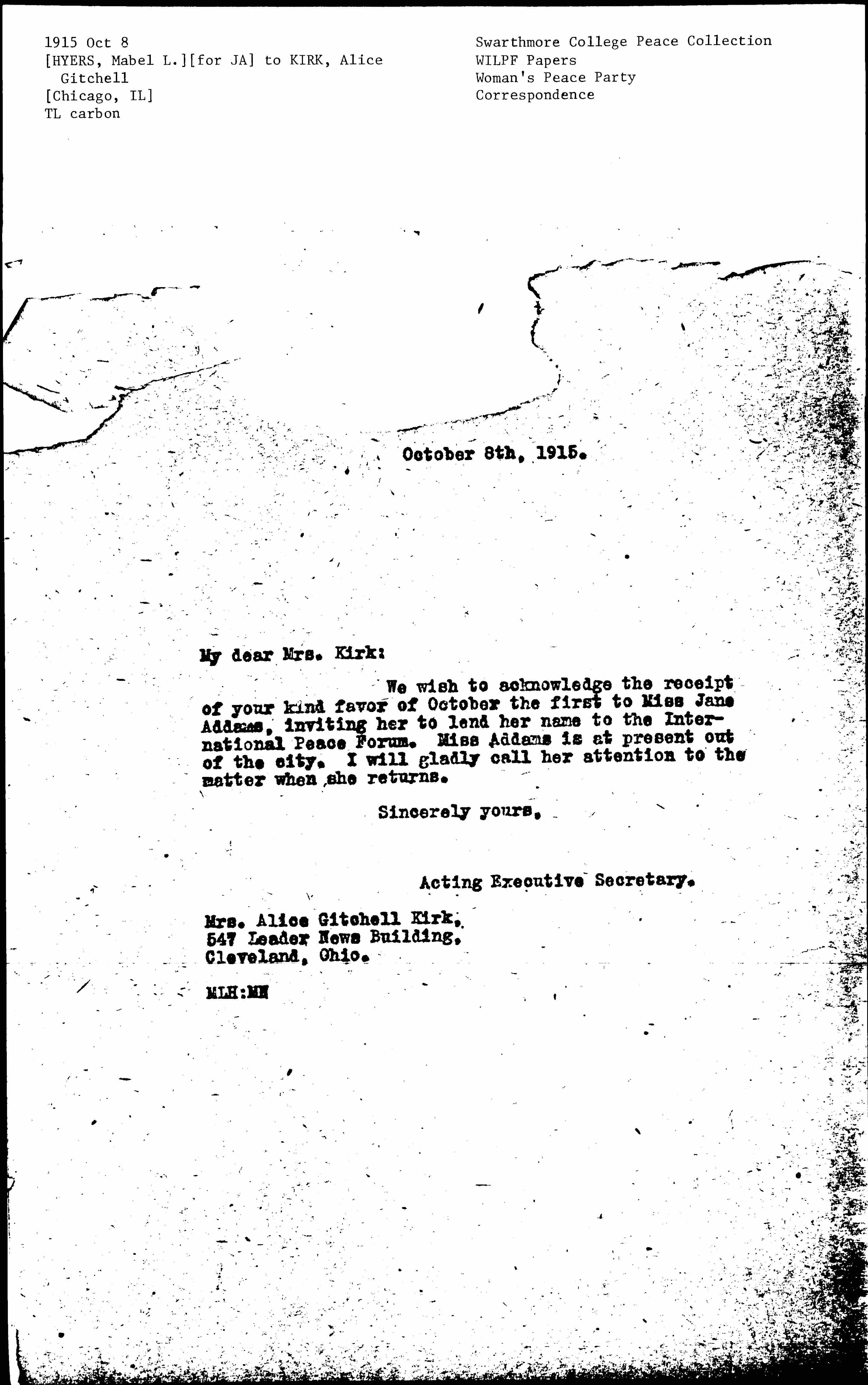 We wish to acknowledge the receipt of your kind favor of October the first to Miss Jane Addams, inviting her to lend her name to the International Peace Forum. Miss Addams is at present out of the city. I will gladly call her attention to the matter when she returns.