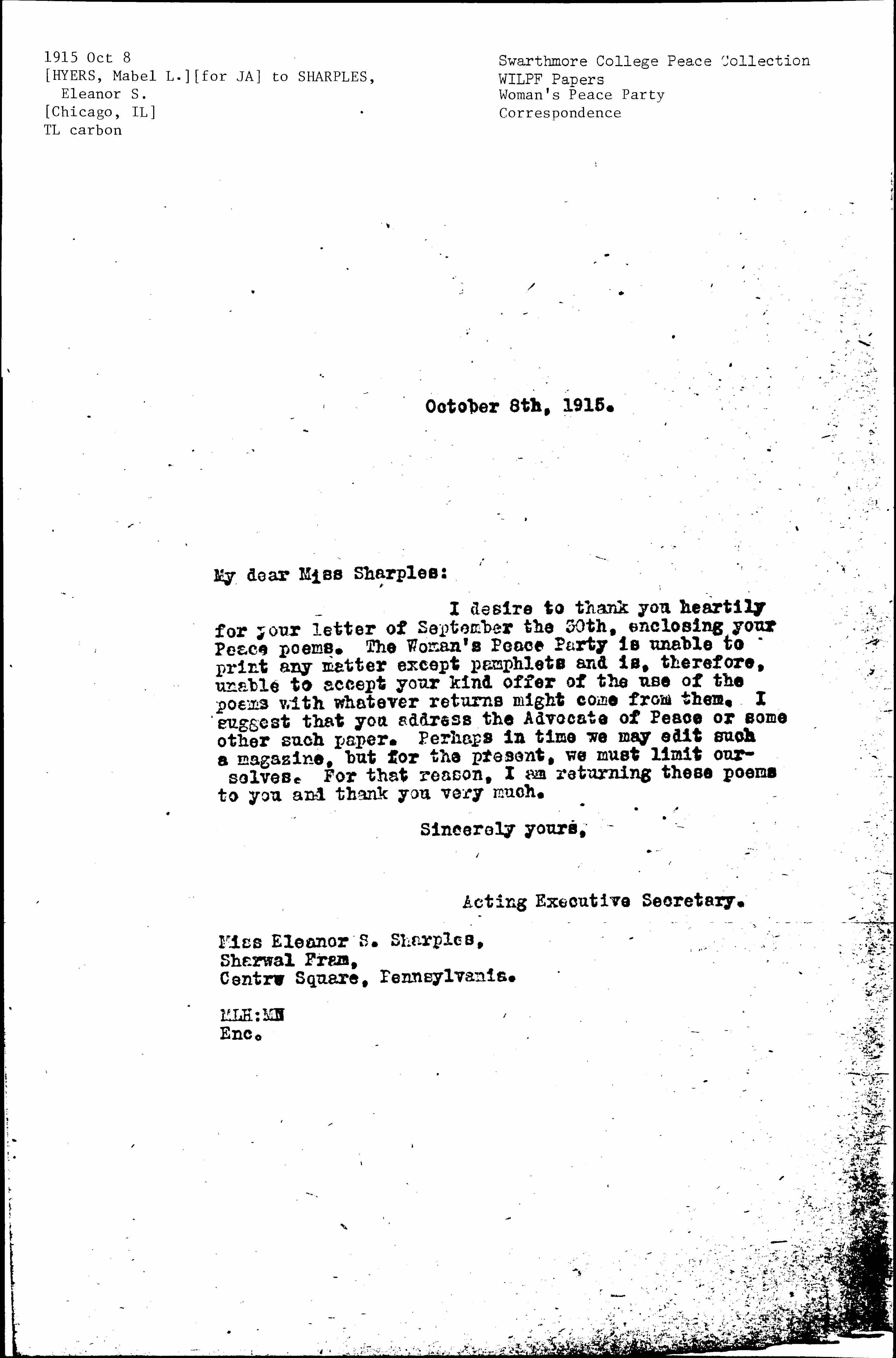 I desire to thank you heartily for your letter of September the 30th, enclosing your Peace poems. The Woman's Peace Party is unable to print any matter except pamphlets and is, therefore, unable to accept your kind offer of the use of the poems with whatever returns might come from them. I suggest that you address the Advocate of Peace or some other such paper. Perhaps in time we may edit such a magazine, but for the present, we must limit ourselves. For that reason, I am returning these poems to you and thank you very much.