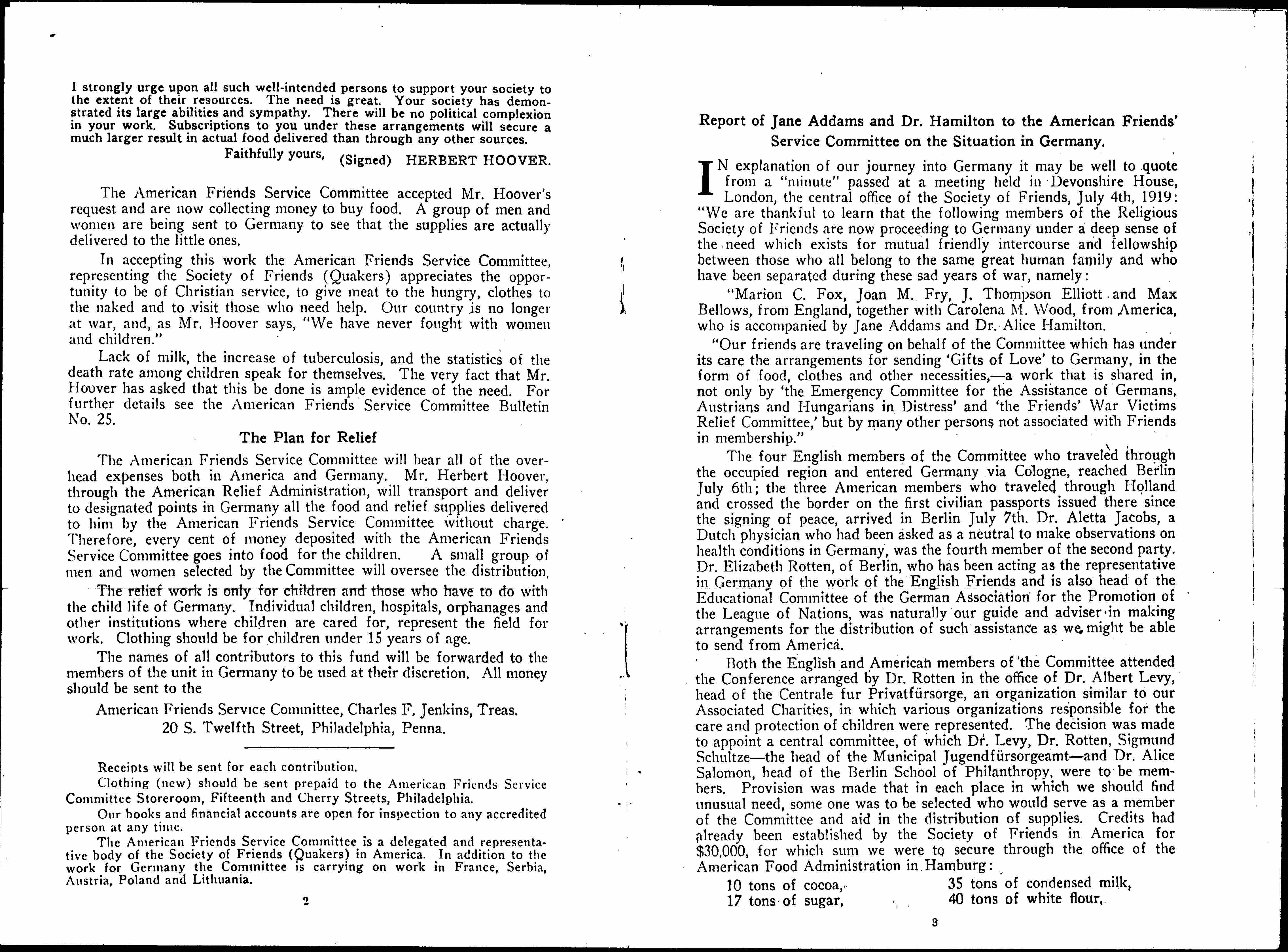 Report of Jane Addams and Dr. Hamilton to the American Friends' Service Committee on the Situation in Germany.