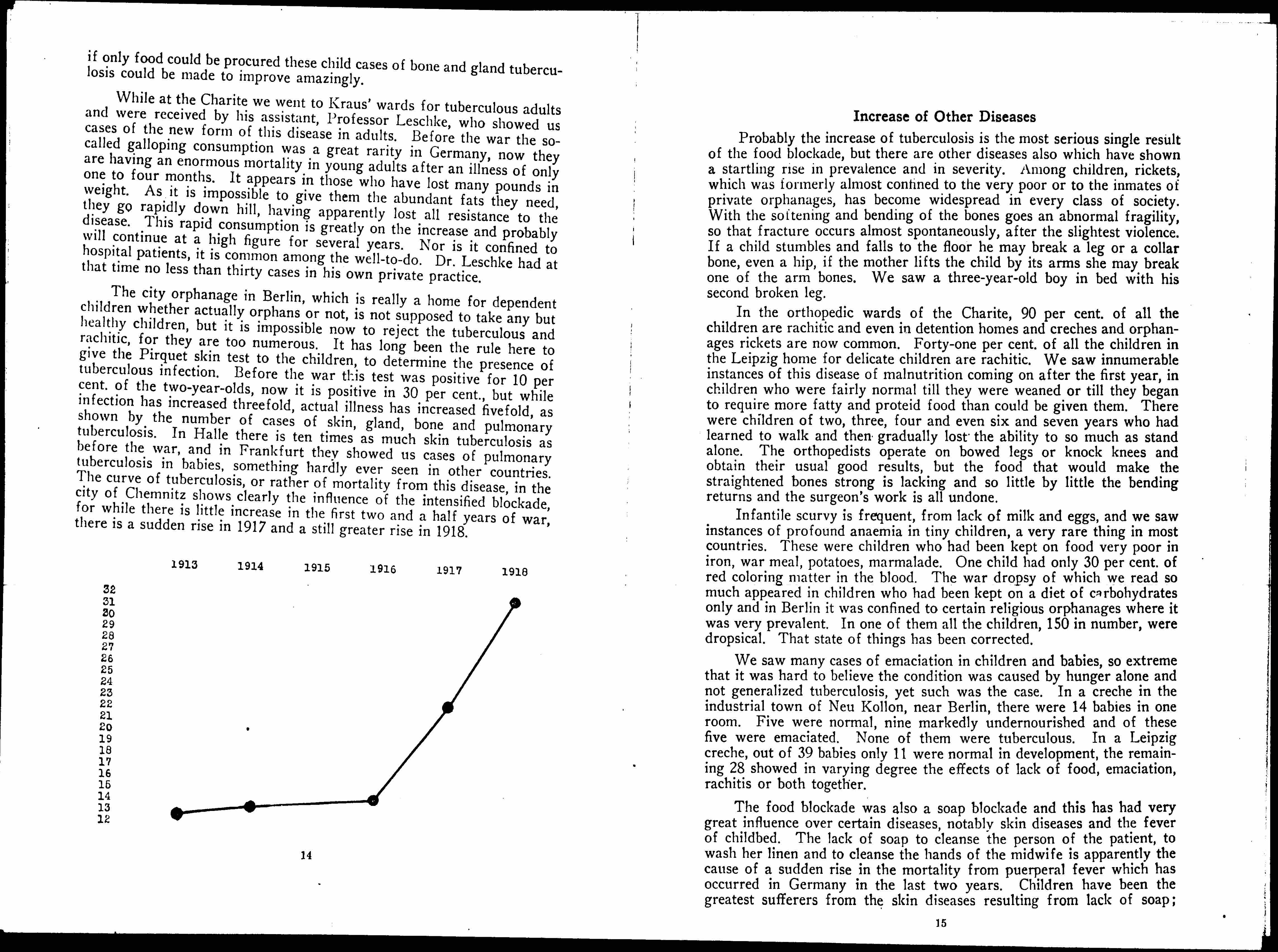 The city orphanage in Berlin, which is really a home for dependent children whether actually orphans or not, is not supposed to take any but healthy children, but it is impossible now to reject the tuberculous and rachitic, for they are too numerous. It has long been the rule here to give the Pirquet skin test to the children, to determine the presence of tuberculous infection. Before the war this test was positive for 10 [percent] of the two-year-olds, now it is positive in 30 [percent], but while the infection has increased threefold, actual illness has increased fivefold, as shown by the number of cases of skin, gland, bone and pulmonary tuberculosis. In Halle there is ten times as much skin tuberculosis as before the war, and in Frankfurt they showed us cases of pulmonary tuberculosis in babies, something hardly ever seen in other countries. The curve of tuberculosis, or rather of mortality from this disease, in the city of Chemnitz shows clearly the influence of the intensified blockade, for while there is little increase in the first two and a half years of war, there is a sudden rise in 1917 and a still greater rise in 1918.