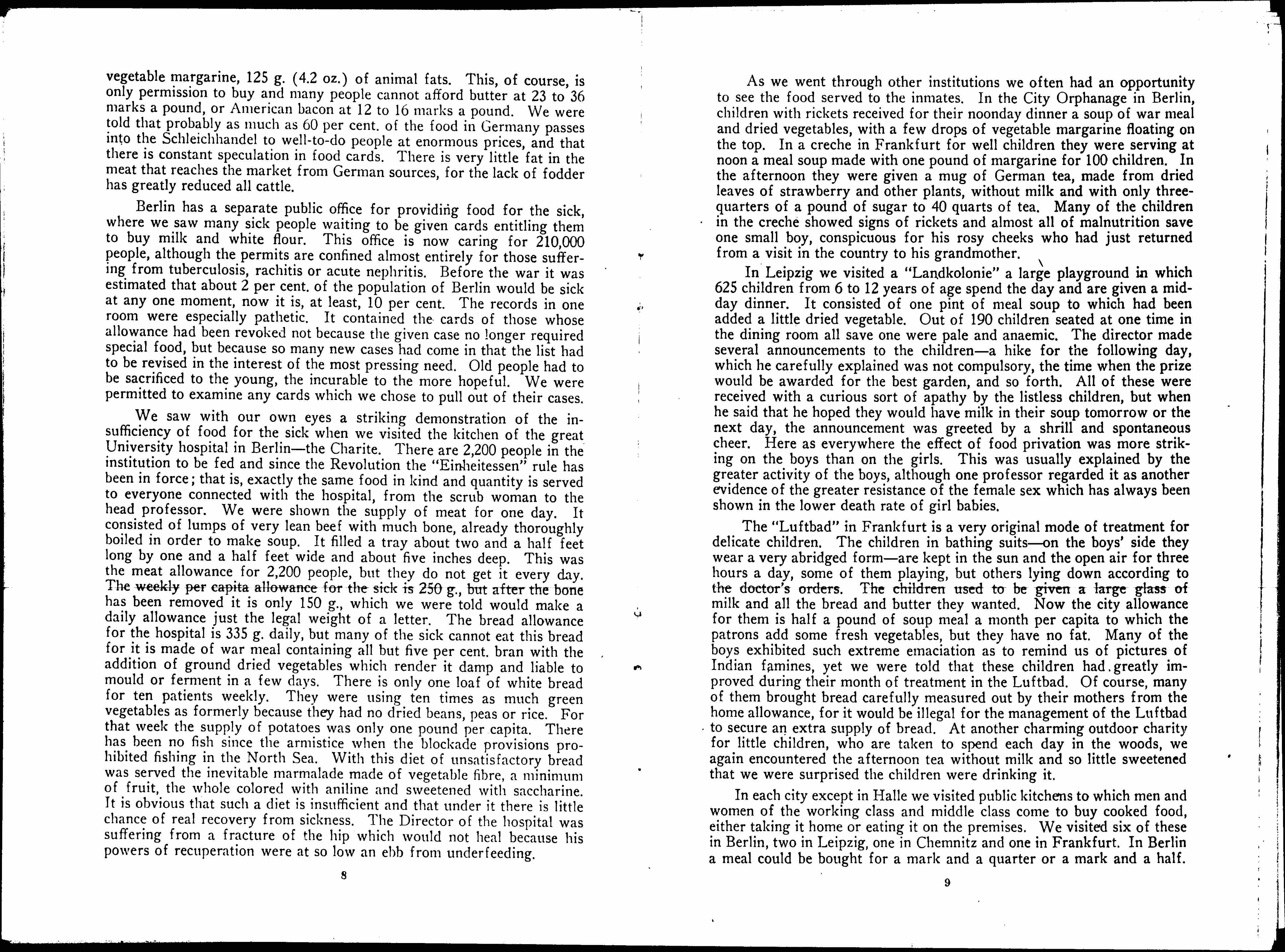 We were constantly reminded that the paucity of food does not affect only the poorer people. We were told that many working people with relatives in the country from whom they might obtain food, fared better than professional people and others who had no such connections. Often when asked a direct question the professors in clinics revealed the difficulty they had had in providing for their own families. One famous physician said that he had never during the blockade and up to the present had meat more than once a week. The wife of a great biologist said that many a morning when she had faced an empty larder she would go out in one direction, her husband in another and the nurse in a third in order to find food for her three little children. Another professor who was taking us through a children's ward admitted rather reluctantly that his breakfast consists of black war coffee with bread and marmalade, that he eats no midday meal and his supper is only soup and bread. He had come from the front to find that his wife had made a poor recovery from a serious operation and that his two children were very much reduced, all for lack of proper food. He sent them to a seaside place on the Baltic, but there proved to be so little food there that he obliged to save all he can to send them food from Berlin. Another of our guides, who kindly invited us to his house, showed us two blooming children of seven and eleven, but the little war baby of two years had stopped growing when she was weaned and developed rickets. With the utmost care she is now able to walk, and is still tiny, white and thin, a great contrast to the other two children.