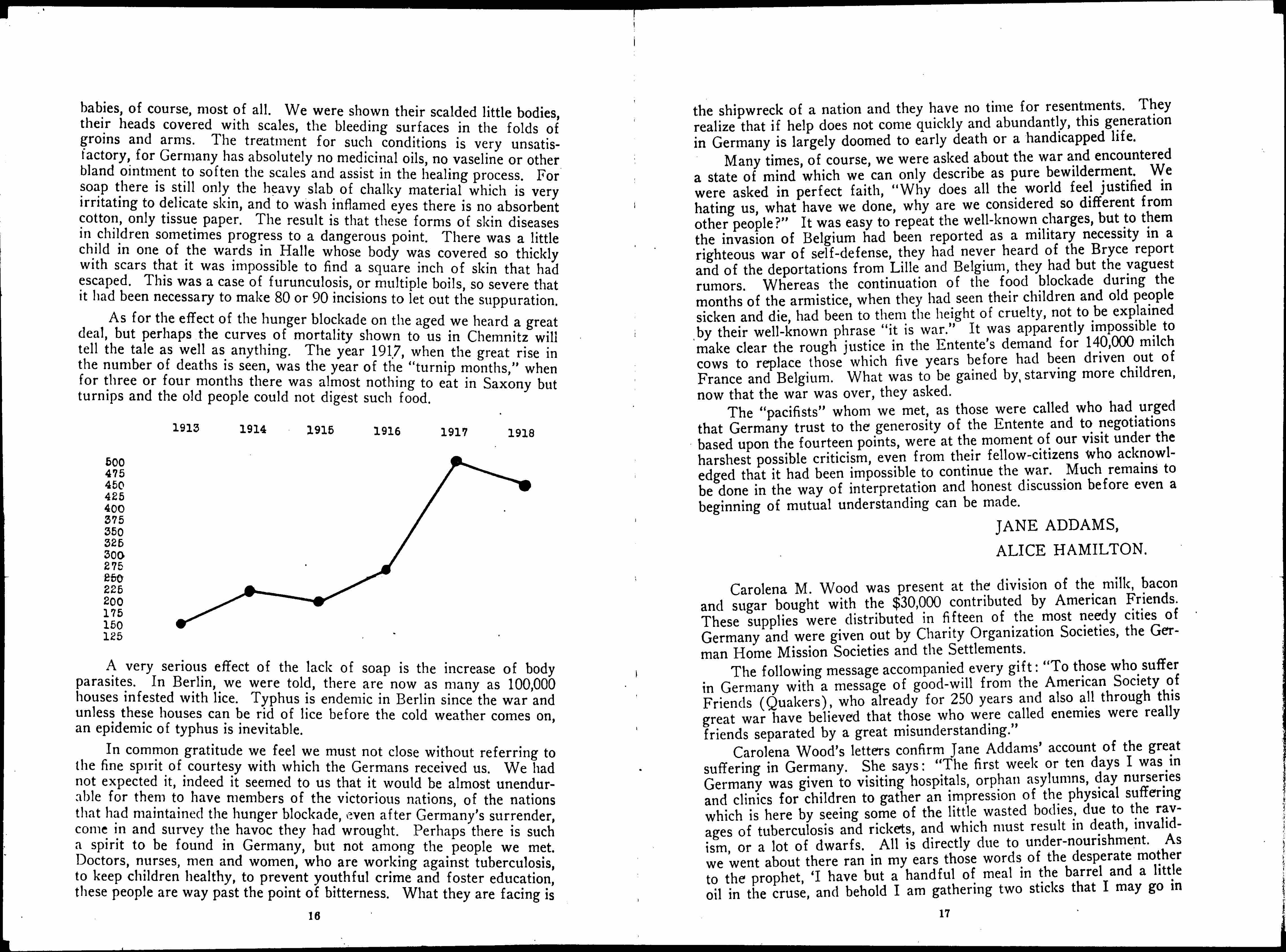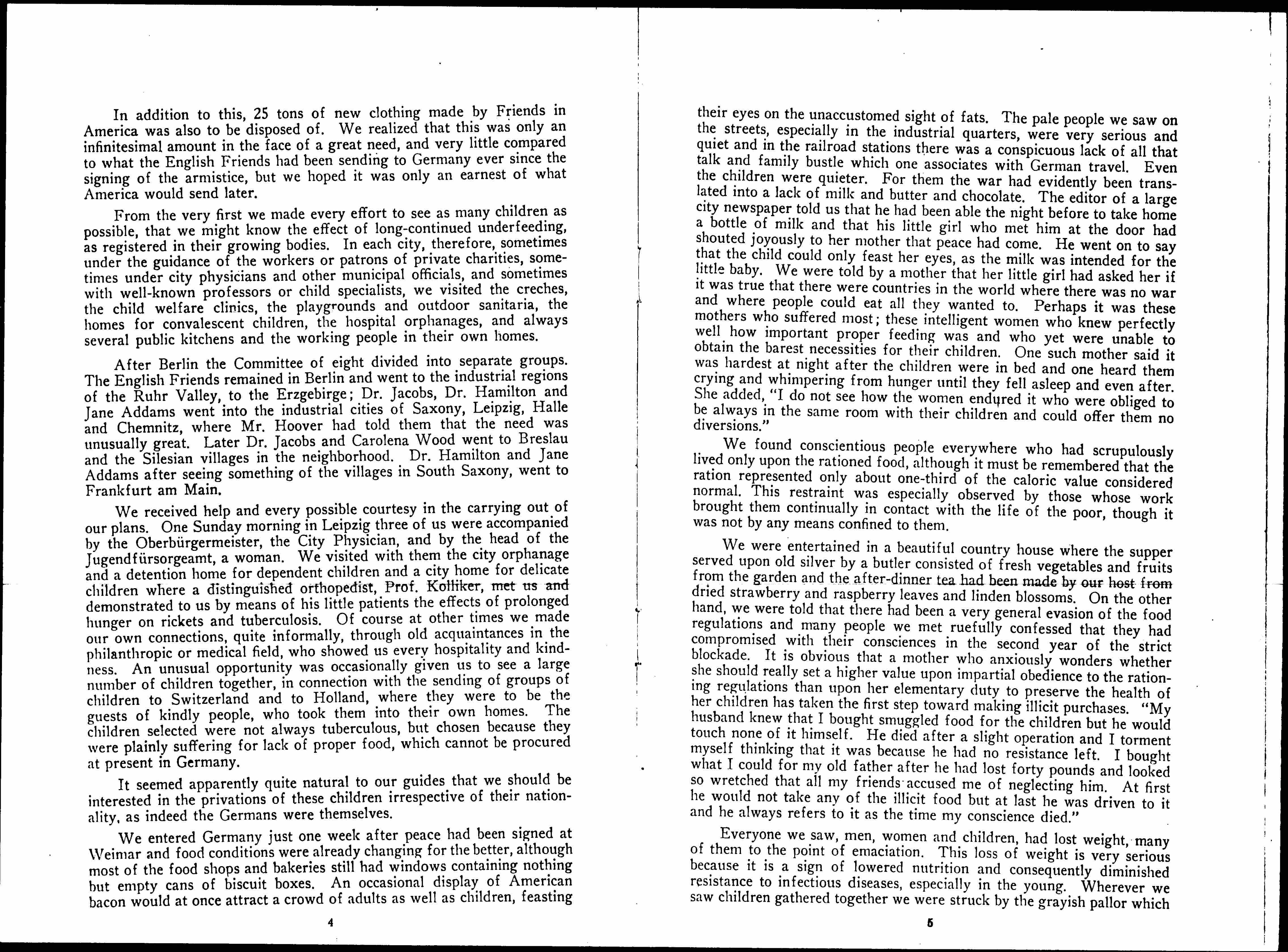 Carolena Wood's letters confirm Jane [Addams's] account of the great suffering in Germany. She says: "The first week or ten days I was in Germany was given to visiting hospitals, orphan [asylums], day nurseries and clinics for children to gather an impression of the physical suffering which is here by seeing some of the little wasted bodies, due to the ravages of tuberculosis and rickets, and which must result in death, invalidism, or a lot of dwarfs. All is directly due to under-nourishment. As we went about there ran in my ears those words of the desperate mother to the prophet, 'I have but a handful of meal in the barrel and a little oil in the cruse, and behold I am gathering two sticks that I may go in [page 18] and dress it for me and my son that we may eat it and die.' So far has Germany gone....