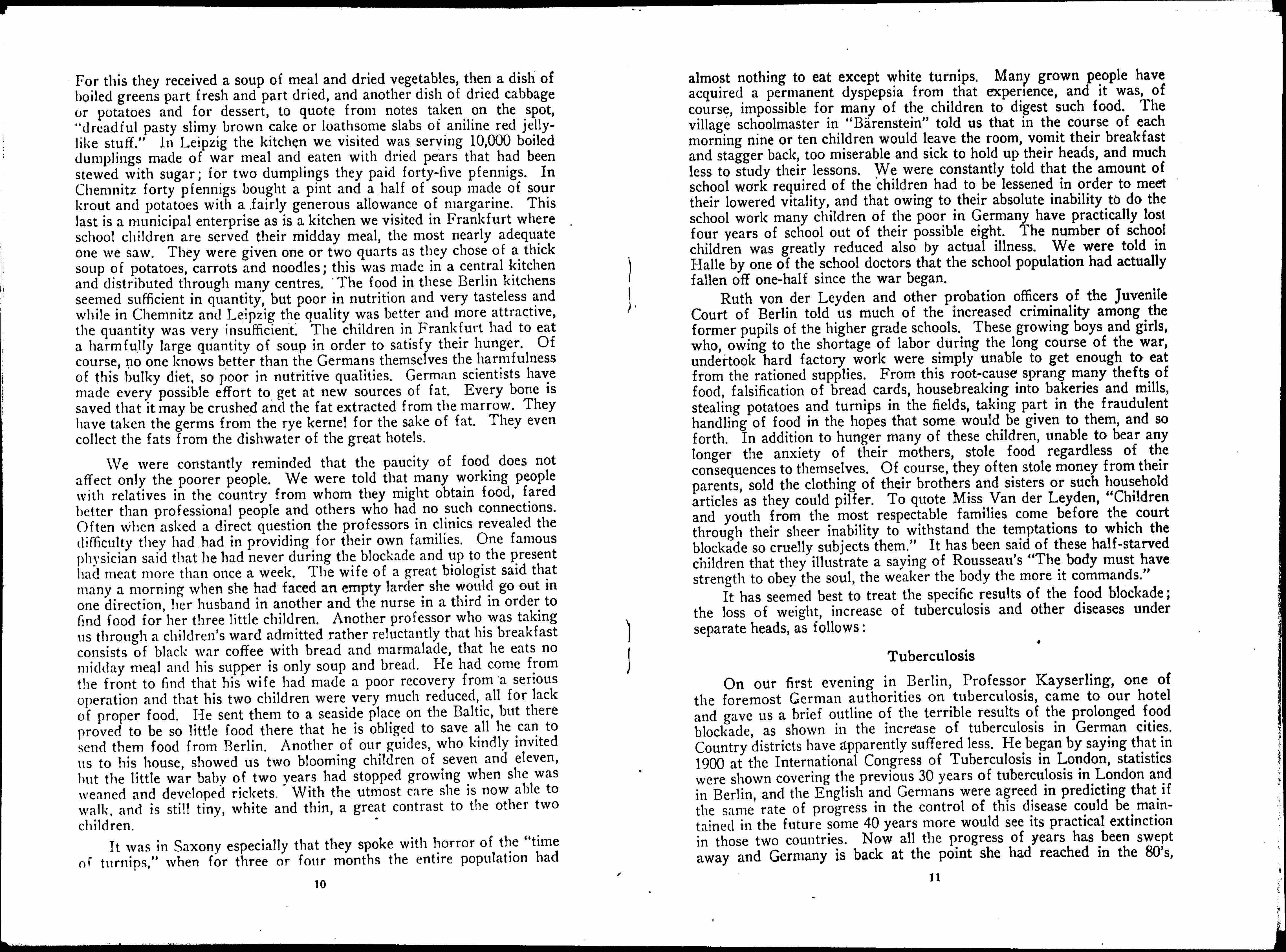 We heard still more about tuberculosis in the great hospital of Charite, connected with the University, when we visited Professor Czerny's wards there. Fully half of all the children here are tuberculous, a condition which they attribute first to increased infection because so many mothers have contracted tuberculosis through overwork and underfeeding and so many fathers have come back from the front tubercular, and second to the loss of resistance in the children's bodies because of starvation for fats. The men in charge in this hospital and in the Kaiser and Kaiserin Friedrich Spital for children's bodies told us that they feel sure the effects of the hunger blockade will be apparent throughout the lifetime of this generation and perhaps longer. These effects cannot be rightly estimated it by simply looking at death records. Most children infected with tuberculosis will not die now, the majority do not, as yet, even show signs of the disease. But each coming year for twenty years will show a far higher rate of sickness and death from tuberculosis than Germany has known for decades, because the seeds of the disease which have fastened themselves on these weakened children will do their work later on, perhaps in puberty when resistance is always lowered, perhaps in twenties under the strain of childbearing or of industrial life. Nor is it only tuberculosis which will have increased; all infectious diseases will meet with a lessoned resistance, all overstrain and hard work will do a greater injury and even the children of these war children may be below the normal standard.