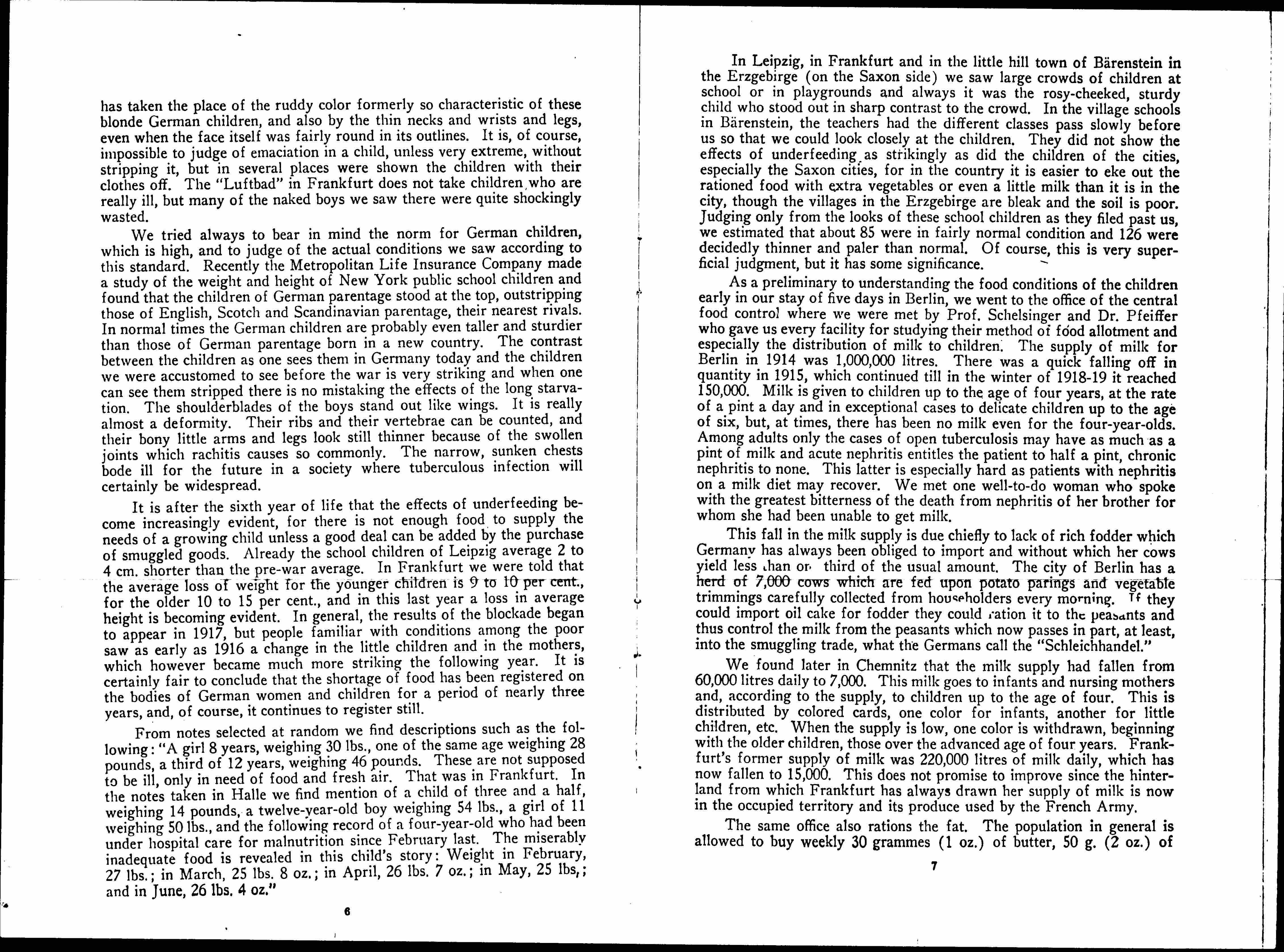 From notes selected at random we find descriptions such as the following: "A girl 8 years, weighing 30 lbs., one of the same age weighing 28 pounds, a third of 12 years, weighing 46 pounds. These are not supposed to be ill, only in need of food and fresh air. That was in Frankfurt. In the notes taken in Halle we find mention of a child of three and a half, weighing 14 pounds, a twelve-year-old boy weighing 54 lbs., a girl of 11 weighing 50 lbs., and the following record of a four-year-old who had been under hospital care for malnutrition since February last. The miserably inadequate food is revealed in this child's story: Weight in February, 27 lbs.; in March, 25 lbs. 8 oz.; in April, 26 lbs. 7 oz.; in May, 25 lbs.; and in June, 26 lbs. 4 oz." [page 7]