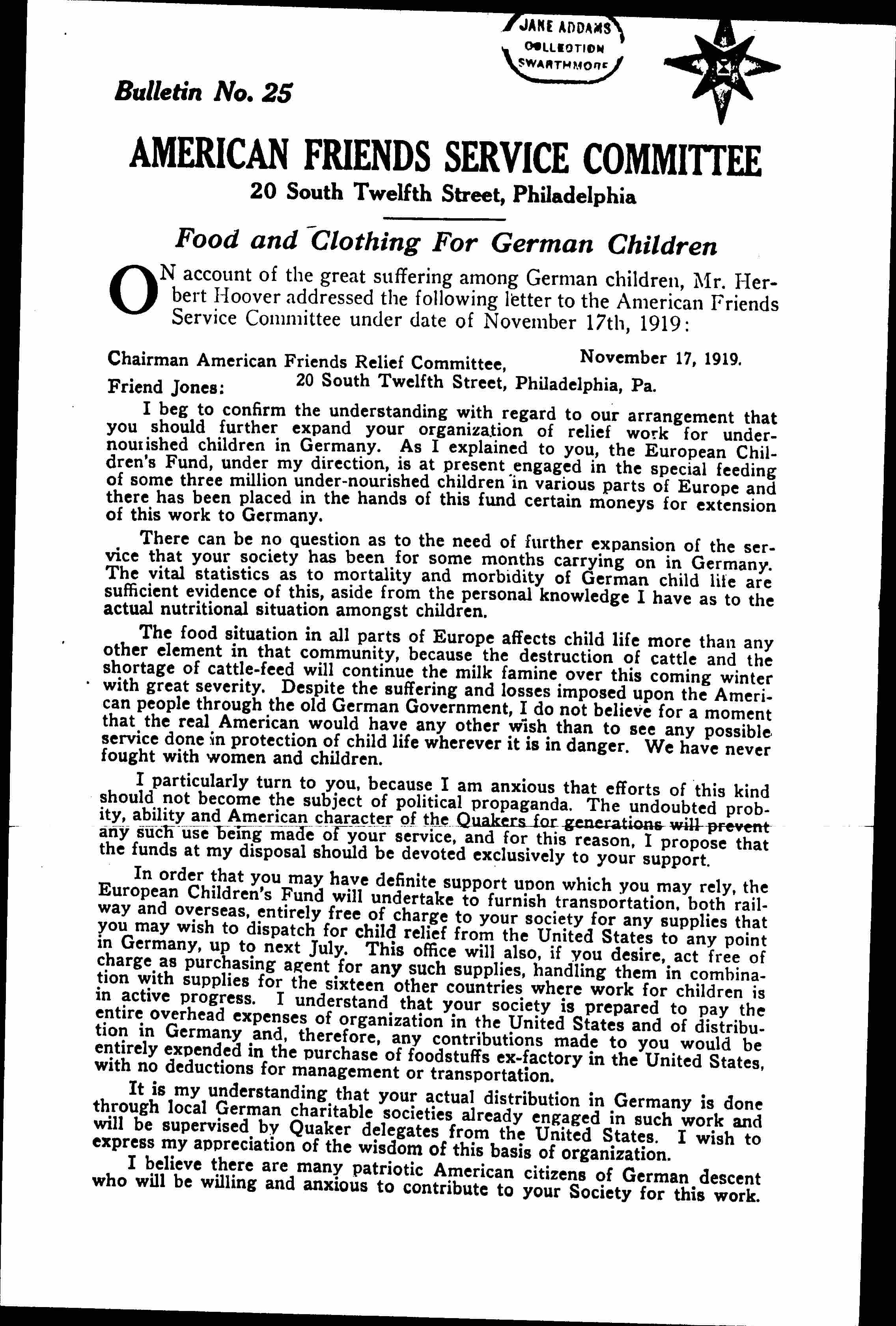On account of the great suffering among German children, Mr. Herbert Hoover addressed the following letter to the American Friends Service Committee under date of November 17th, 1919: