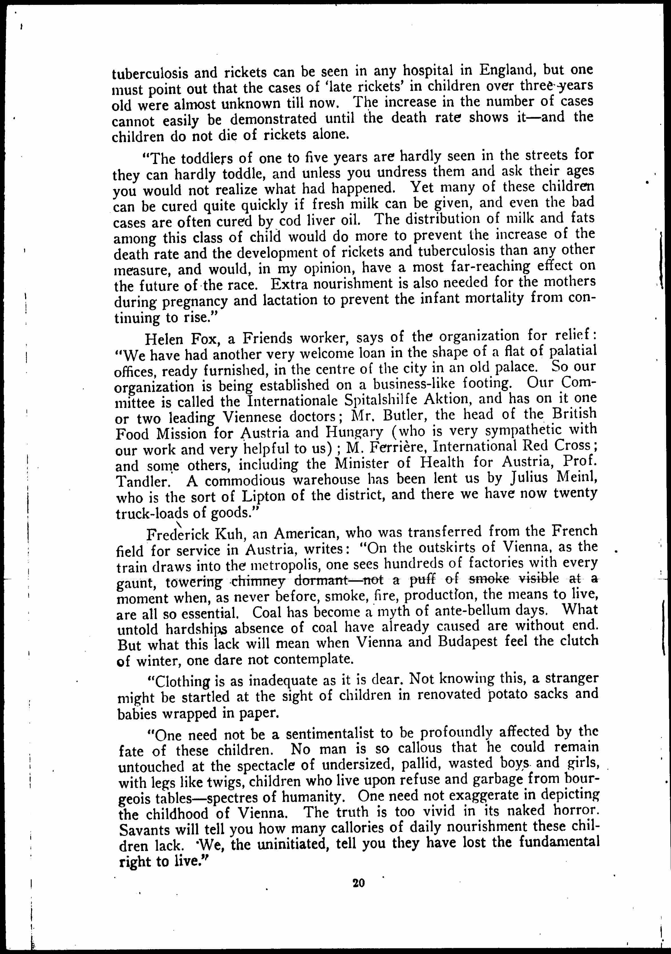 "The full extent of the disaster that has befallen the children of Vienna is not realized by many, even of those who visit here. Cases of [page 20] tuberculosis and rickets can be seen in any hospital in England, but one must point out that the cases of 'late rickets' in children over three years old were almost unknown till now. The increase in the number of cases cannot easily be demonstrated until the death rate shows it -- and the children do not die of rickets alone.
