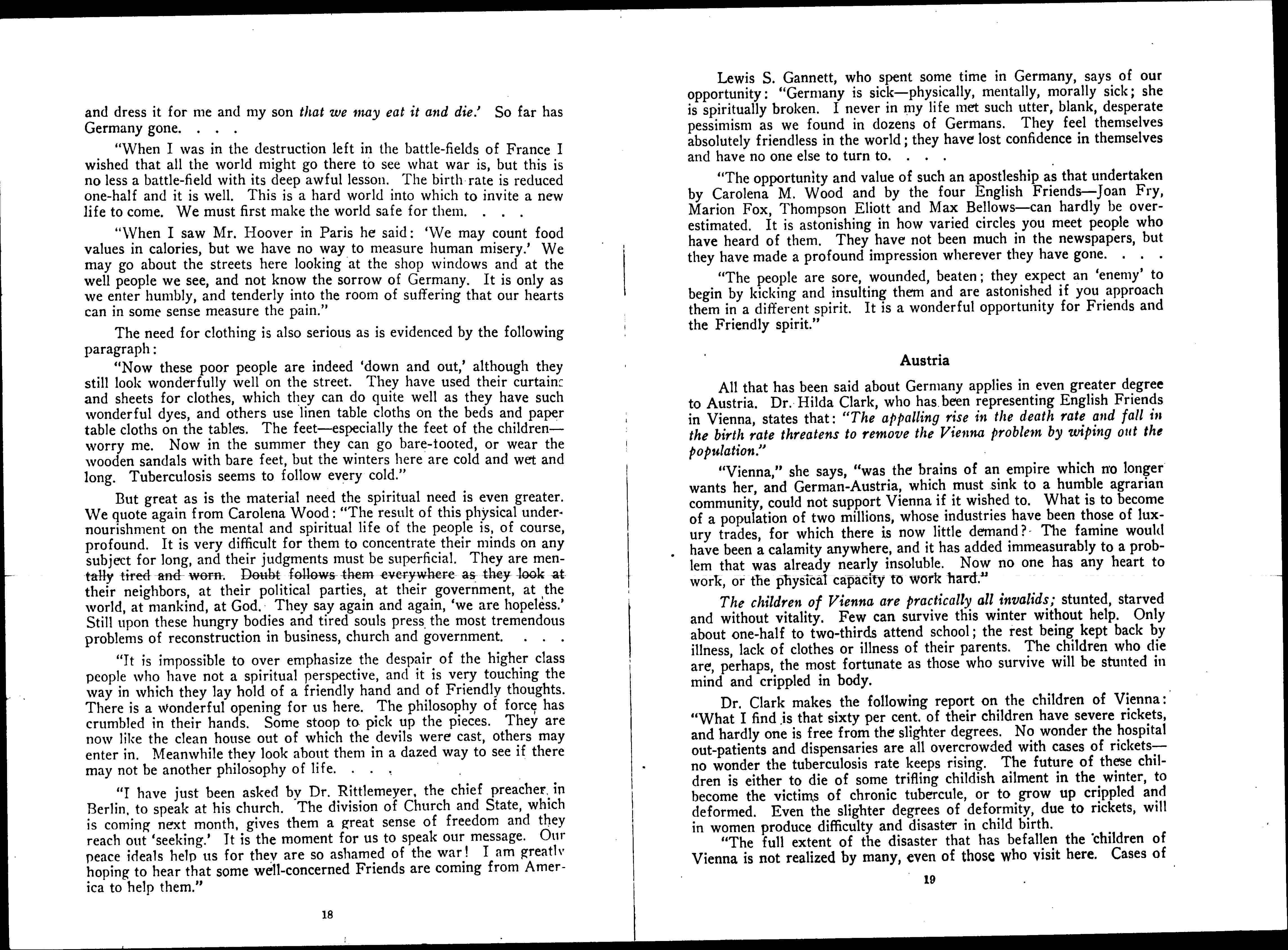 All that has been said about Germany applies in even greater degree to Austria. Dr. Hilda Clark, who has been representing English Friends in Vienna, states that: "The appalling rise in the death rate and fall in the birth rate threatens to remove the Vienna problem by wiping out the population."
