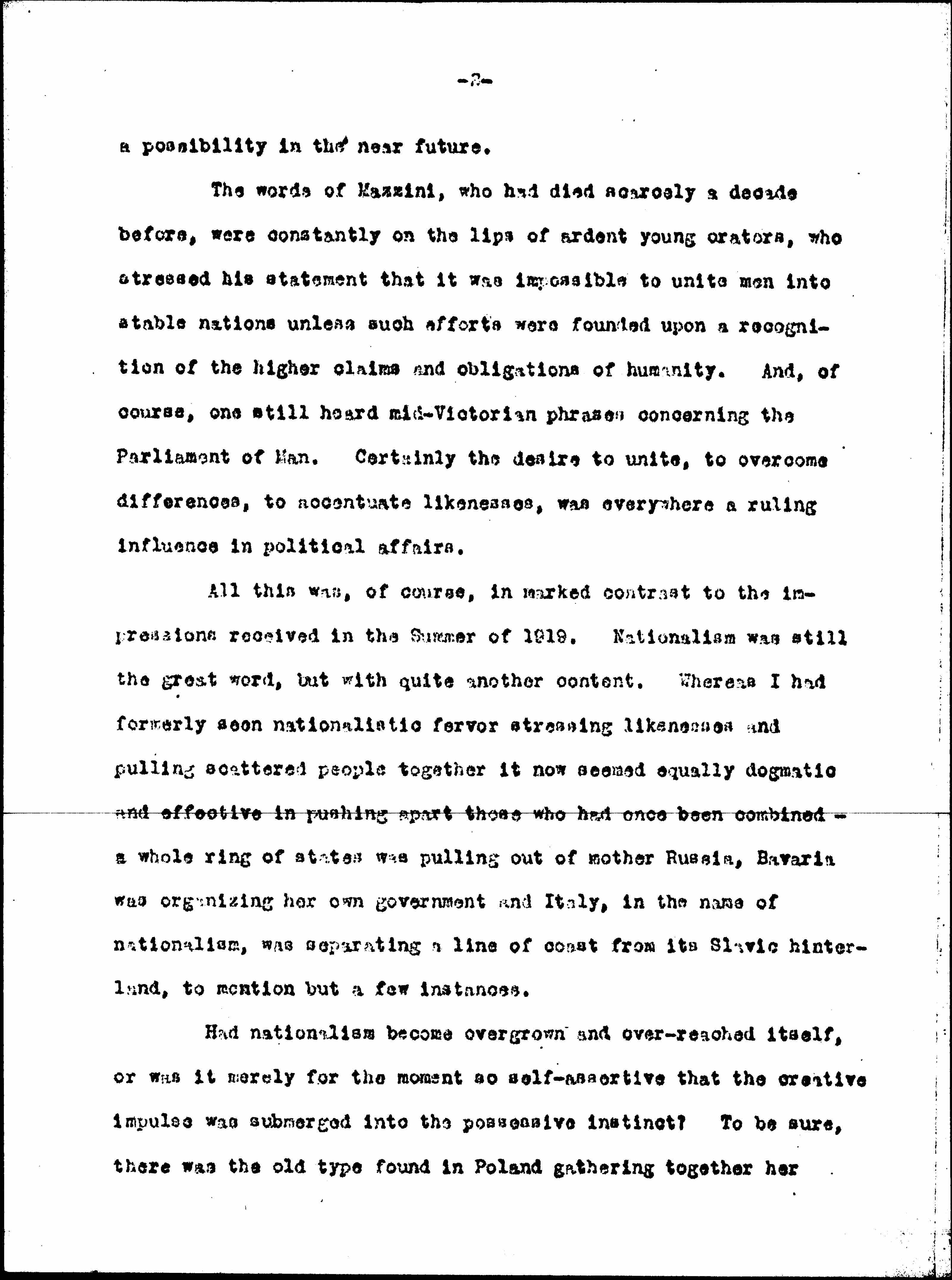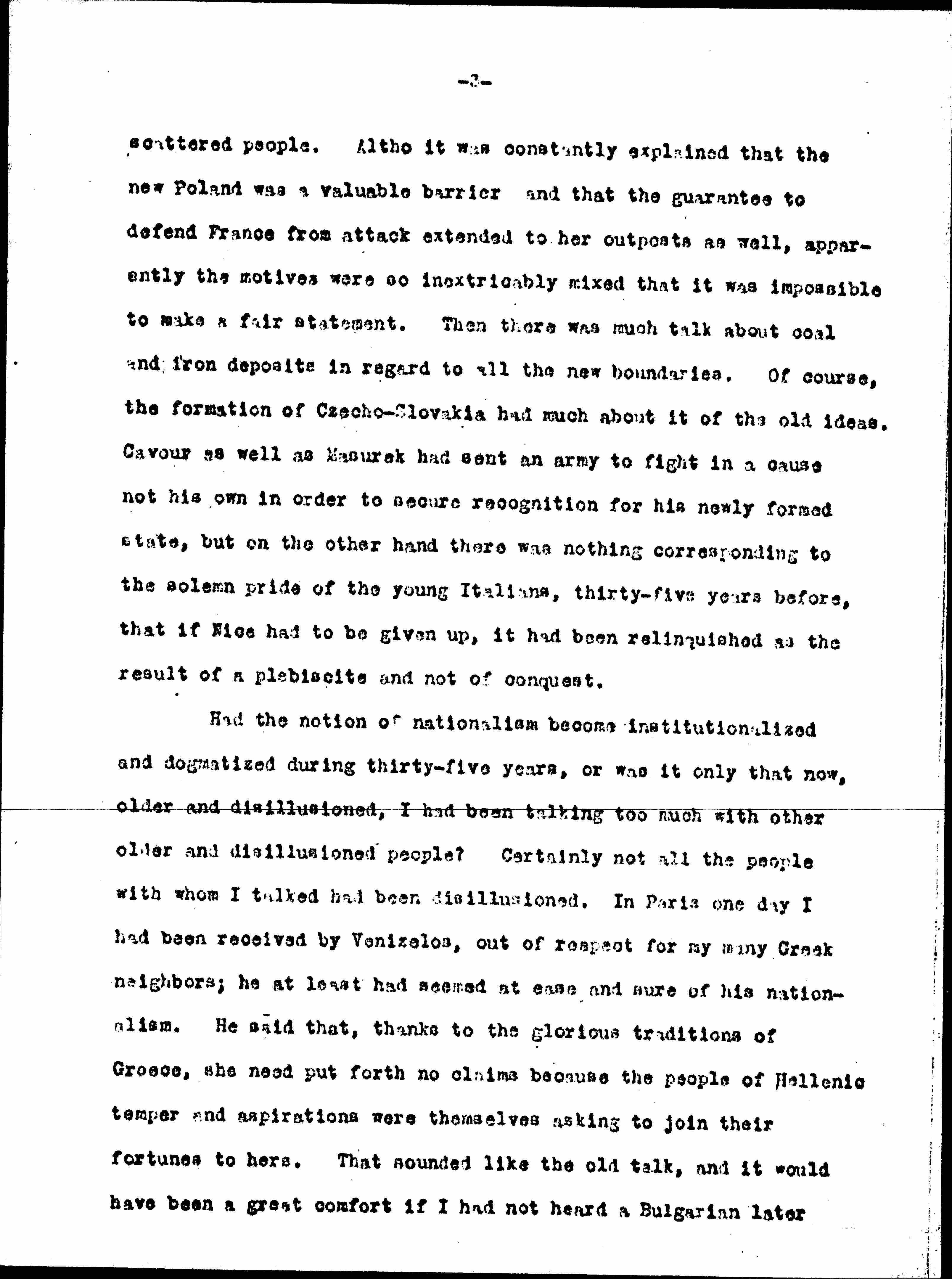 Had nationalism become overgrown and over-reached itself, or was it merely for the moment so self-assertive that the creative impulse was submerged into the possessive instinct? To be sure, there was the old type found in Poland gathering together her [page 3] scattered people. [Although] it was constantly explained that the new Poland was a valuable barrier and that the guarantee to defend France from attack extended to her outposts as well, apparently the motives were so inextricably mixed that it was impossible to make a fair statement. Then there was much talk about coal and iron deposits in regard to all the new boundaries. Of course, the formation of Czecho-Slovakia had much about it of the old ideas. Cavour as well as [Masaryk] had sent an army to fight in a cause not his own in order to secure recognition for his newly formed state, but on the other hand there was nothing corresponding to the solemn pride of the young Italians, thirty-five years before, that if Nice had to be given up, it had been relinquished as the results of a plebiscite and not of conquest.