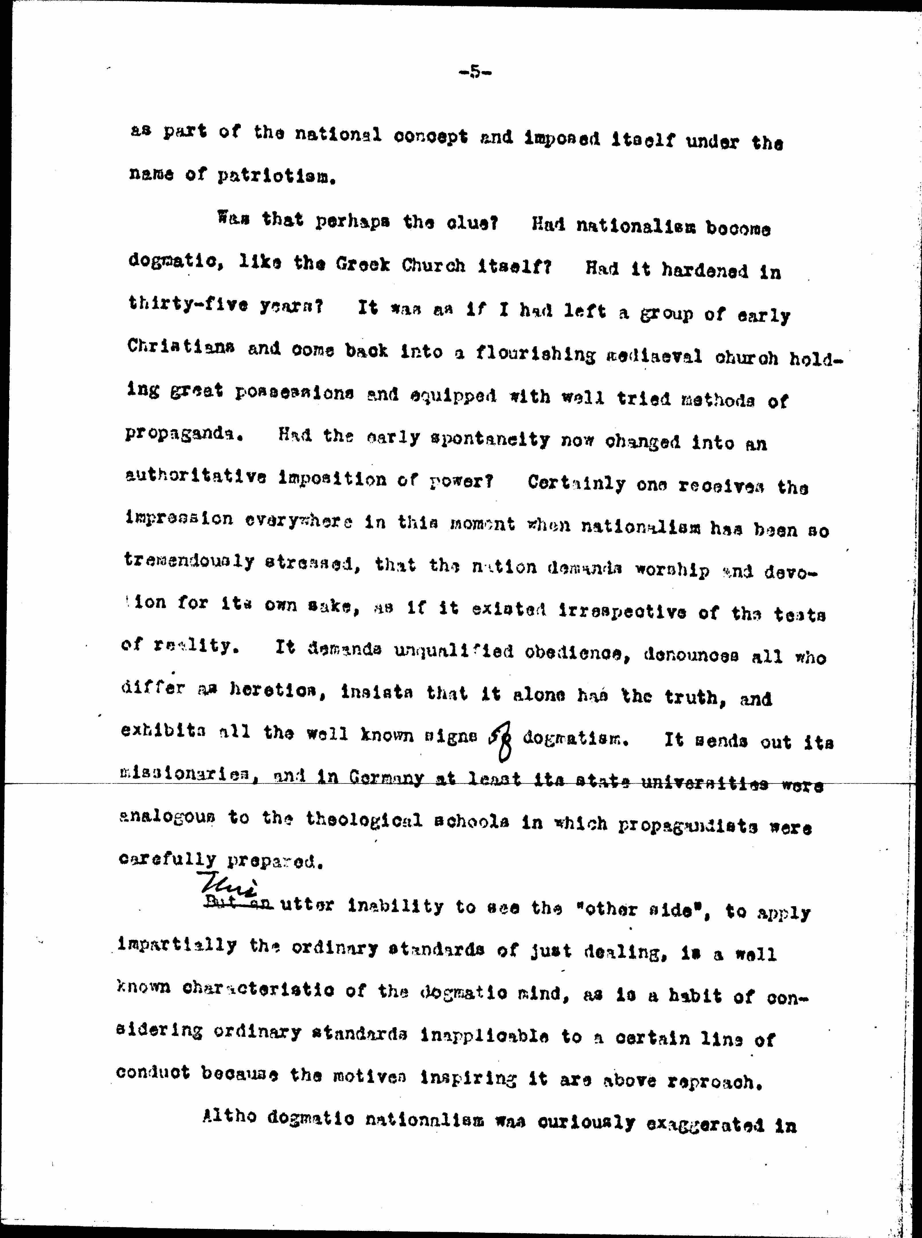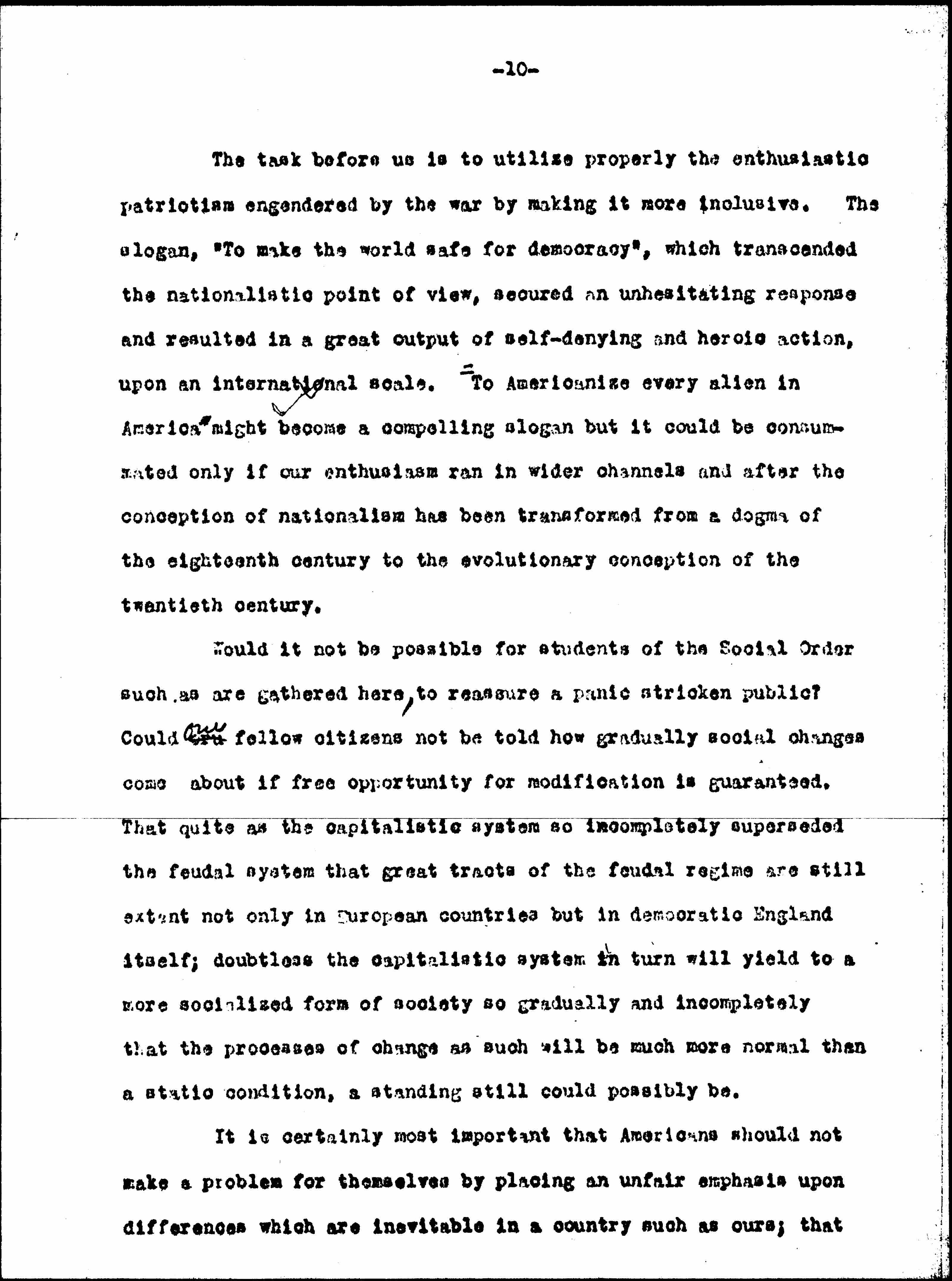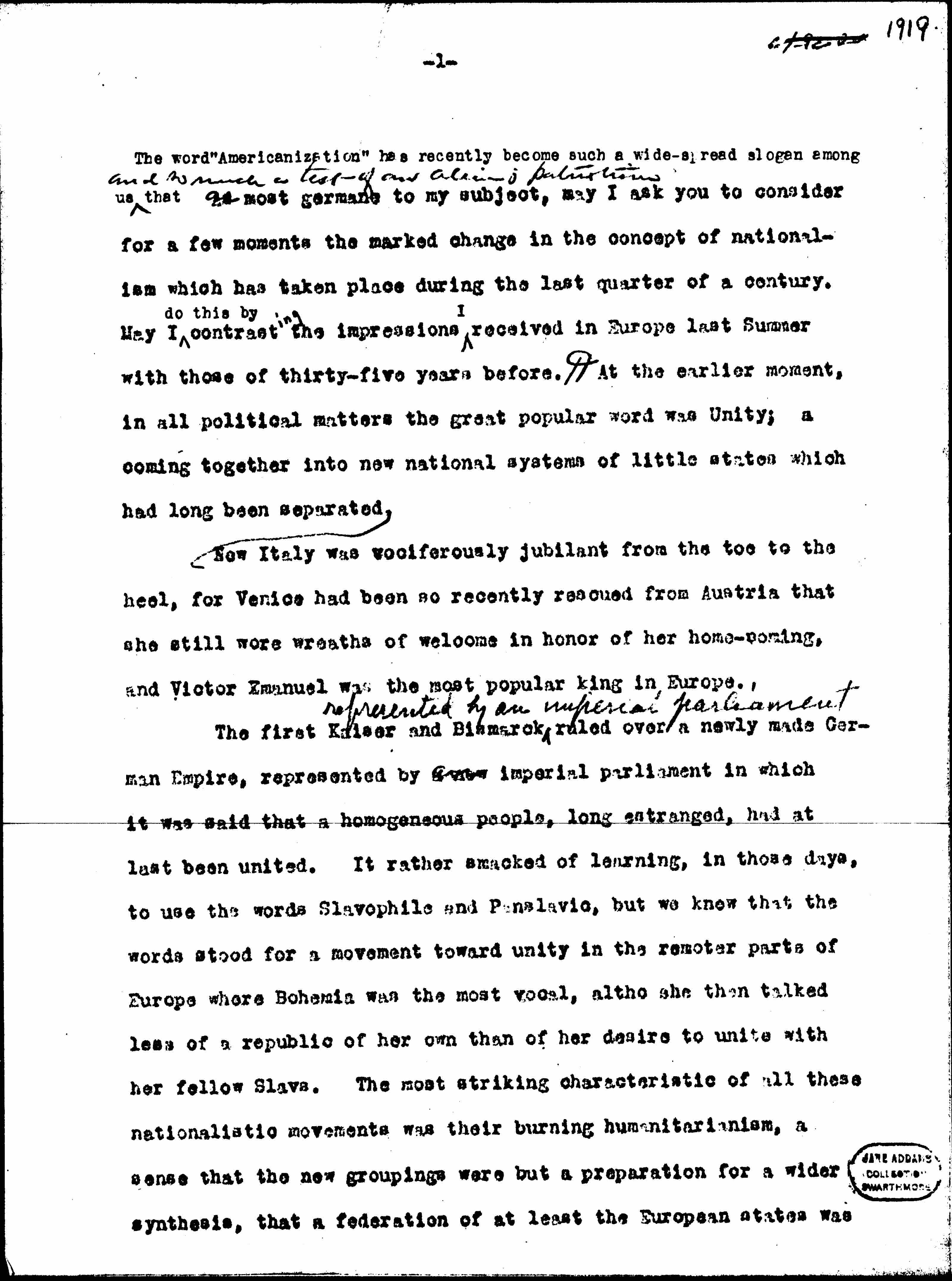 The word "Americanization" has recently become such a [widespread] slogan among us ↑and so much a test of our alien's patriotism↓ that as most germane to my subject, may I ask you to consider for a few moments the marked change in the concept of nationalism which has taken place during the last quarter of a century. May I ↑do this by↓ ↑contrasting↓ the impressions ↑I↓ received in Europe last Summer with those of thirty-five years before.