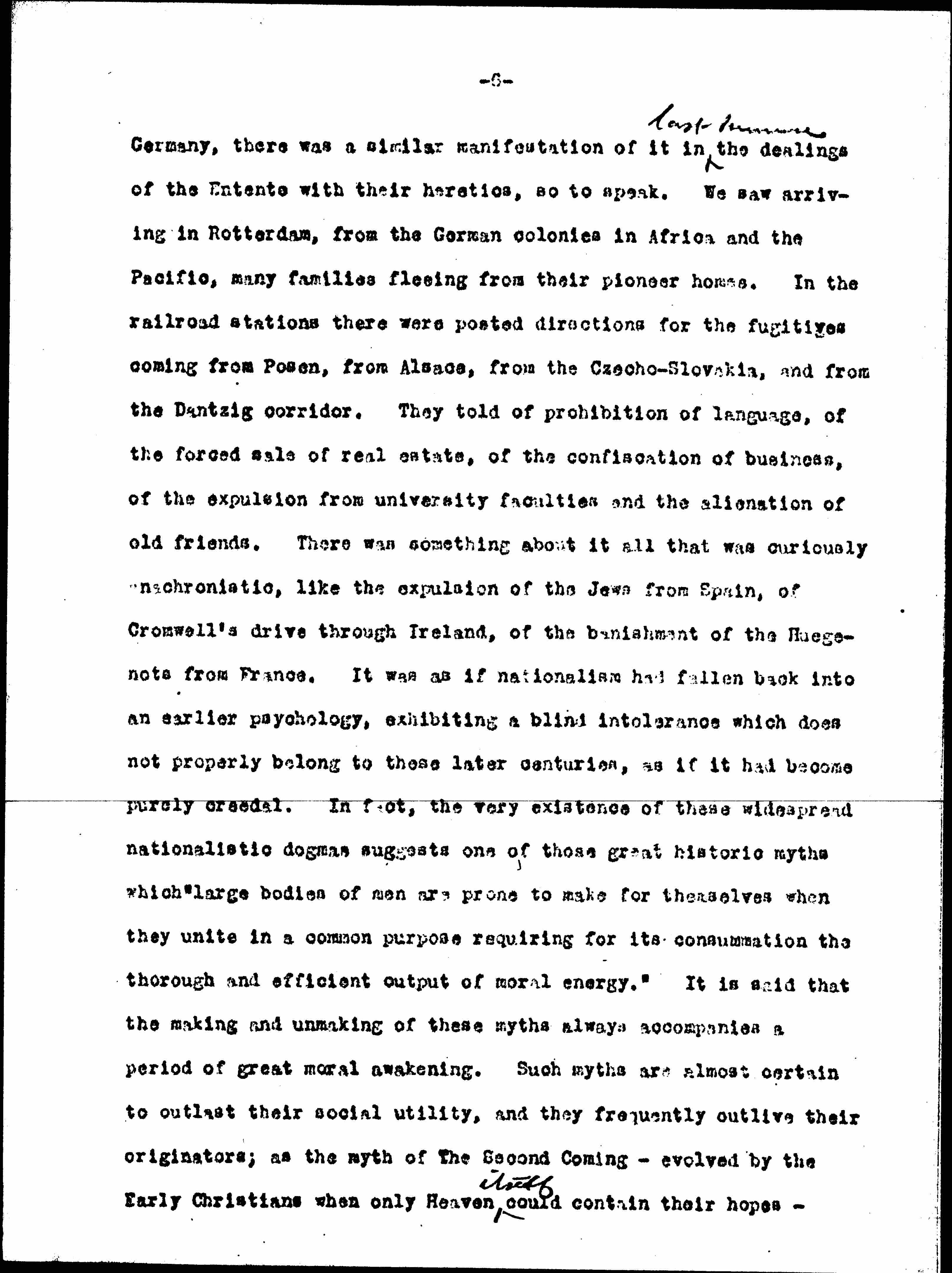 [Although] dogmatic nationalism was curiously exaggerated in [page 6] Germany, there was a similar manifestation of it in ↑last humane↓ the dealings of the Entente with their heretics, so to speak. We saw arriving in Rotterdam, from the German colonies in Africa and the Pacific, many families fleeing from their pioneer homes. In the railroad stations there were posted directions for the fugitives coming from Posen, from Alsace, from the Czecho-Slovakia, and from the [Danzig] corridor. They told of prohibition of language, of the forced sale of real estate, of the confiscation of business, of the expulsion from university faculties and the alienation of old friends. There was something about it all that was curiously anachronistic, like the expulsion of the Jews from Spain, of Cromwell's drive through Ireland, of the banishment of the [Huguenots] from France. It was as if nationalism had fallen back into an earlier psychology, exhibiting a blind intolerance which does not properly belong to those later centuries, as if it had become purely creedal. In fact, the very existence of these widespread nationalistic dogmas suggests one of those great historic myths which "large bodies of men are prone to make for themselves when they unite in a common purpose requiring for its consummation the thorough and efficient output of moral energy." It is said that the making and unmaking of these myths always accompanies a period of great moral awakening. Such myths are almost certain to outlast their social utility, and they frequently outlive their originators; as the myth of The Second Coming -- evolved by the Early Christians when only Heaven ↑itself↓ could contain their hopes -- [page 7] lasted for a thousand years.
