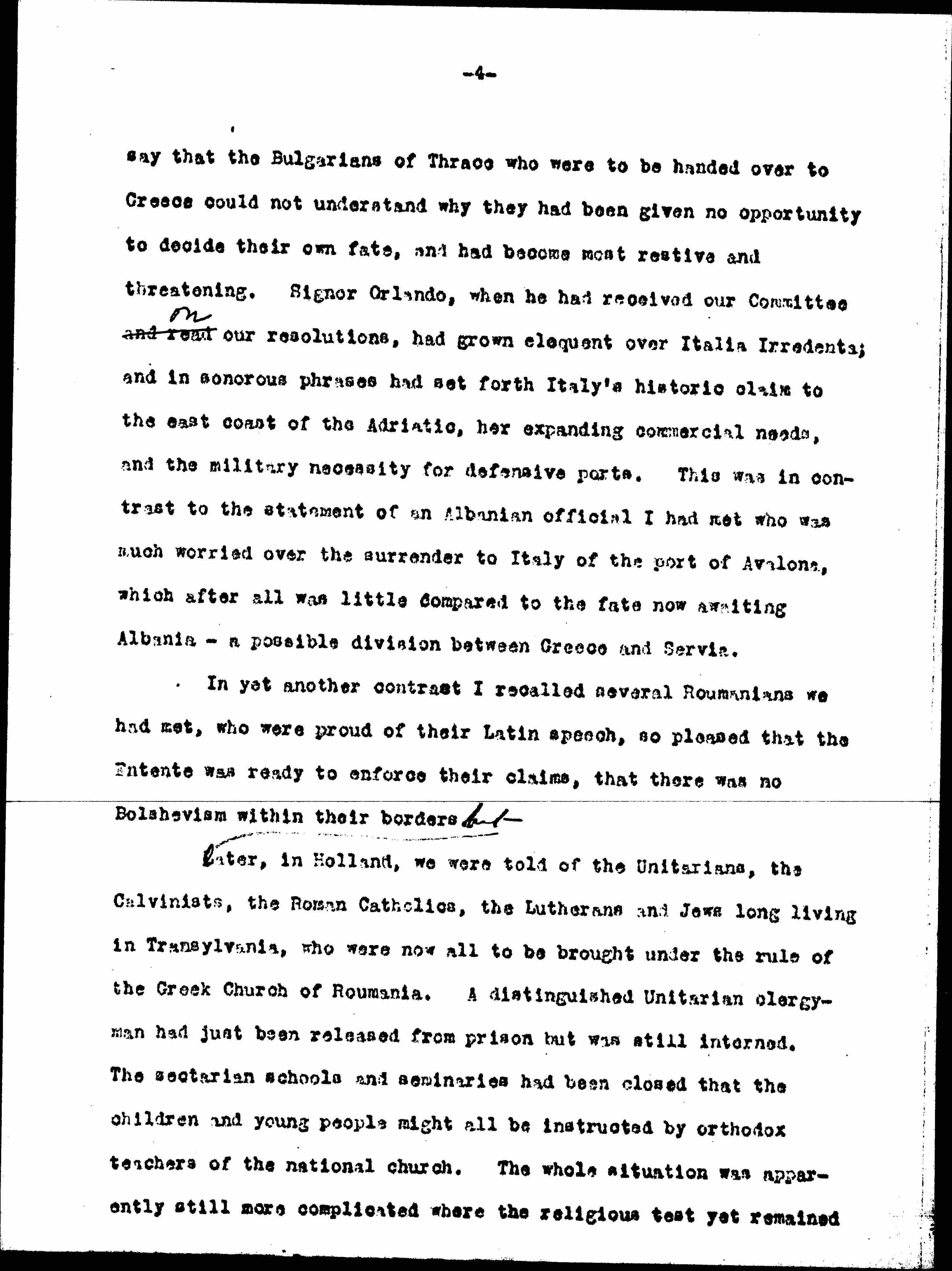 Had the notion of nationalism become institutionalized and dogmatized during thirty-five years, or was it only that now, older and disillusioned, I had been talking too much with other older and disillusioned people? Certainly not all the people with whom I talked has been disillusioned. In Paris one day I had been received by [Venizelos], out of respect for my many Greek neighbors; he at least had seemed at ease and sure of his nationalism. He said that, thanks to the glorious traditions of Greece, she need put forth no claims because the people of Hellenic temper and aspirations were themselves asking to join their fortunes to hers. The sounded like the old talk, and it would have been a great comfort if I had not heard a Bulgarian later [page 4] say that the Bulgarians of Thrace who were to be handed over to Greece could not understand why they had been given no opportunity to decide their own fate, and had become most restive and threatening. Signor Orlando, when he had received our Committee and read ↑on↓ our resolutions, had grown eloquent over Italia Irredenta; and in sonorous phrases had set forth Italy's historic claim to the east coast of the Adriatic, her expanding commercial needs, and the military necessity for defensive ports. This was in contrast to the statement of an Albanian official I had met who was much worried over the surrender to Italy of the port of Avalona, which after all was little compared to the fate now awaiting Albania -- a possible division between Greece and Servia.