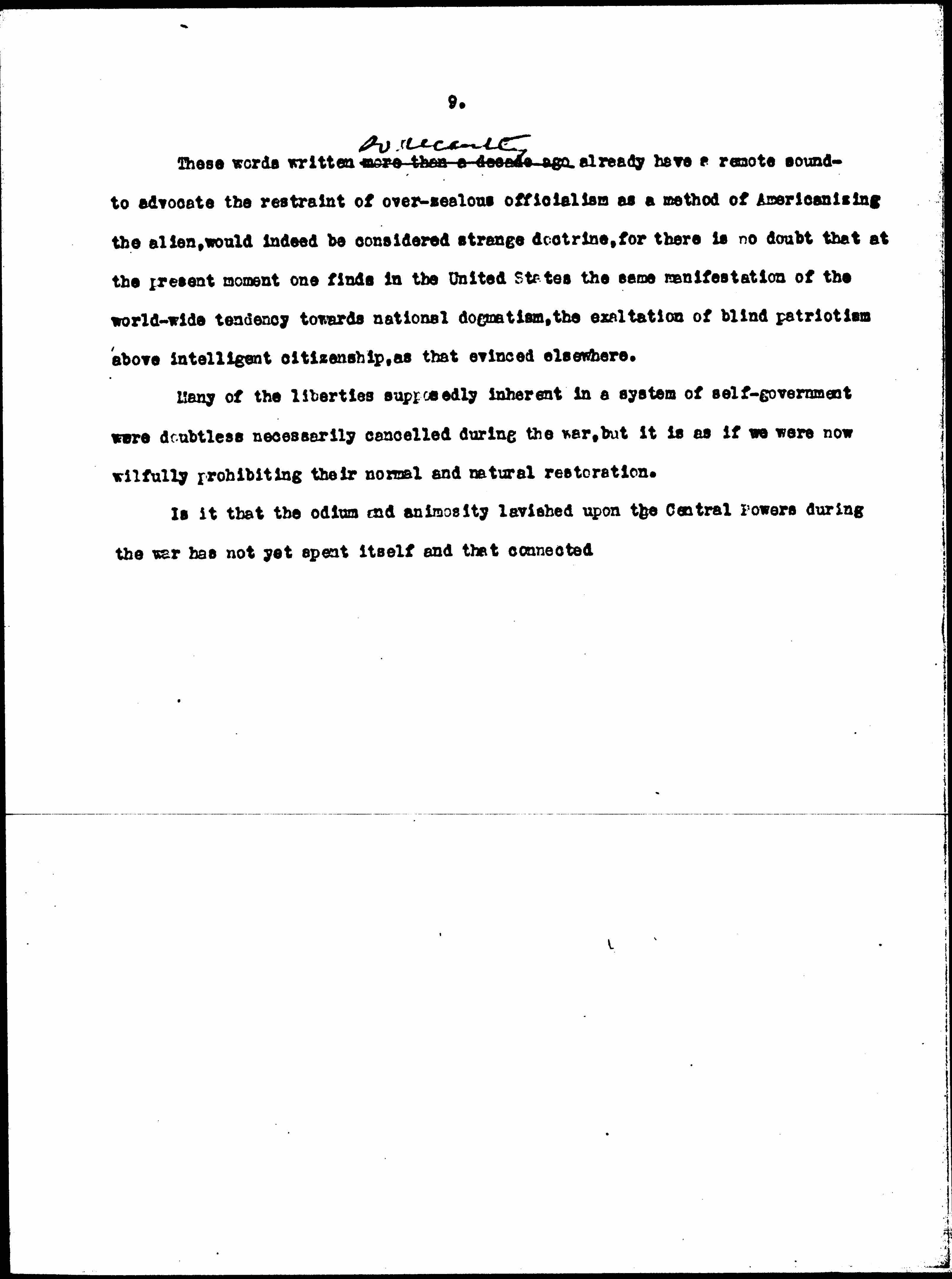 These words written more than a decade ago ↑so recently↓ already have a remote sound -- to advocate the restraint of over-zealous officialism as a method of Americanizing the alien, would indeed be considered strange doctrine, for there is no doubt that at the present moment one finds in the United States the same manifestation of the world-wide tendency towards national dogmatism, the exaltation of blind patriotism above intelligent citizenship, as that evinced elsewhere.