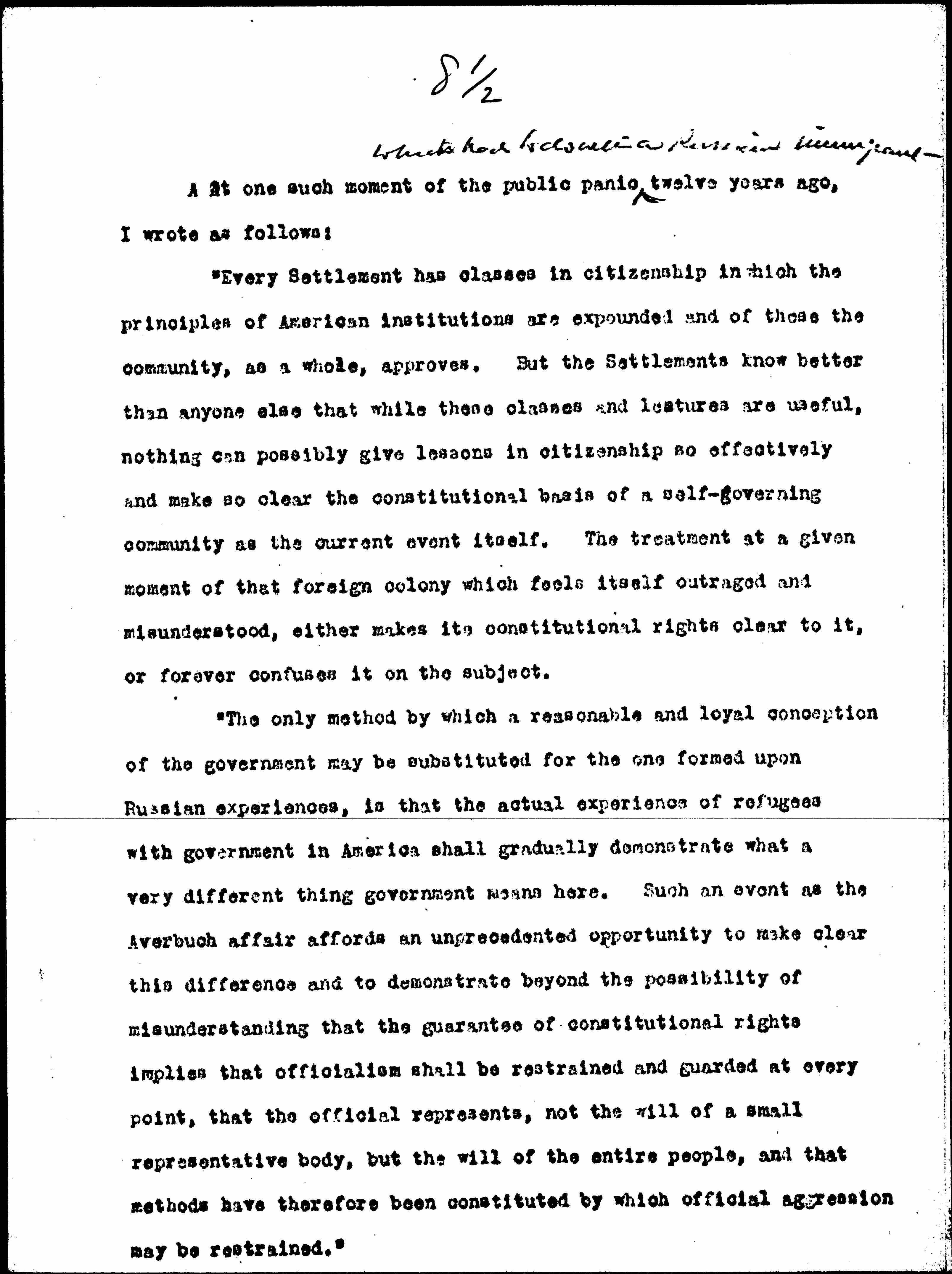 "The only method by which a reasonable and loyal conception of the government may be substituted for the one formed upon Russian experiences, is that the actual experience of refugees with government in America shall gradually demonstrate what a very different thing government means here. Such an event as the Averbuch affair affords an unprecendented opportunity to make clear this difference and to demonstrate beyond the possibility of misunderstanding that the guarantee of constitutional rights implies that officialism shall be restrained and guarded at every point, that the official represents, not the will of a small representative body, but the will of the entire people, and that methods have therefore been constituted by which official aggression may be restrained." [page 10]