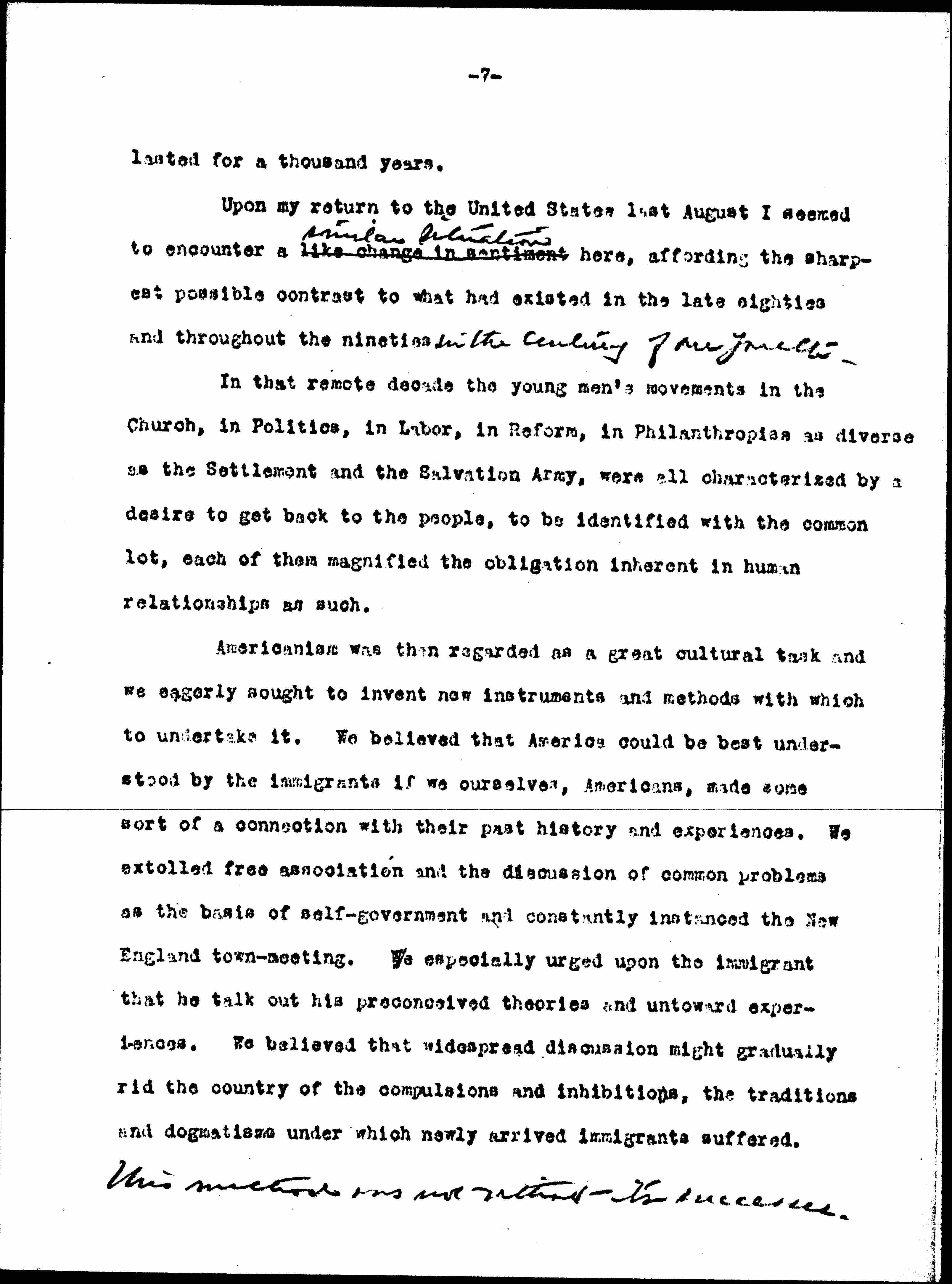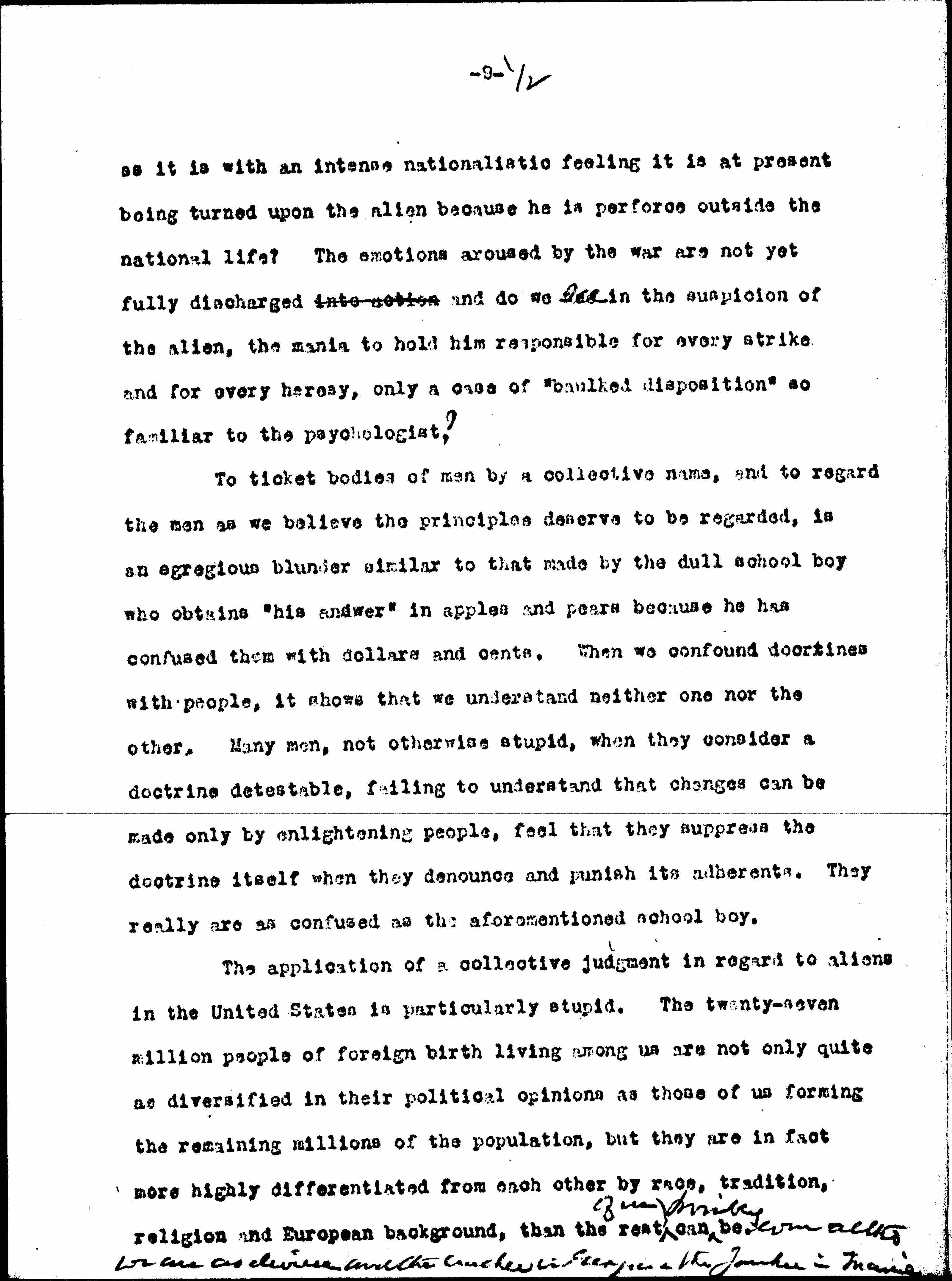 The application of a collective judgement in regard to aliens in the United States is particularly stupid. The twenty-seven million people of foreign birth living among us are not only quite as diversified in their political opinions as those of us forming the remaining millions of the population, but they are in fact more highly differentiated from each other by race, tradition, religion and European background, that the rest ↑of us↓ can ↑possibly↓ be, ↑even [although] we are as divisive as the cracker in Georgia & the Yankee in Maine.↓ [page 12]