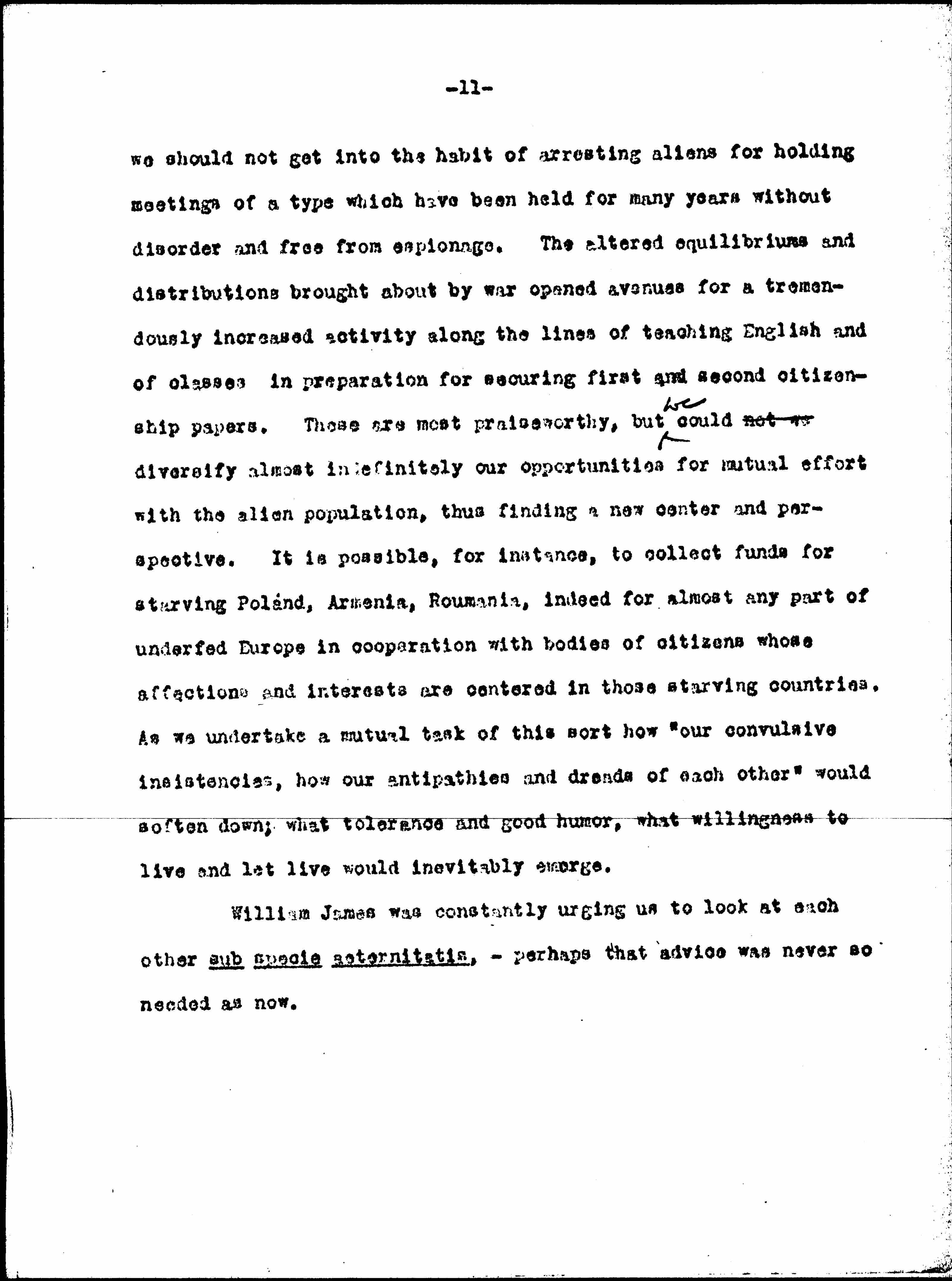 It is certainly most important that Americans should not make a problem for themselves by placing an unfair emphasis upon differences which are inevitable in a country such as ours; that [page 13] we should not get into the habit of arresting aliens for holding meetings of a type which have been held for many years without disorder and free from espionage. The altered equilibriums and distributions brought about by war opened avenues for a tremendously increased activity along the lines of teaching English and of classes in preparation for securing first and second citizenship papers. These are most praiseworthy, but ↑we↓ could not we diversify almost indefinitely our opportunities for mutual effort with the alien population, thus finding a new center and perspective. It is possible, for instance, to collect funds for starving Poland, Armenia, [Romania], indeed for almost any part of underfed Europe in cooperation with bodies of citizens whose affections and interests are centered in those starving countries. As we undertake a mutual task of this sort how "our convulsive inconsistencies, how our antipathies and dreads of each other" would soften down; what tolerance and good humor, what willingness to live and let live would inevitably emerge.