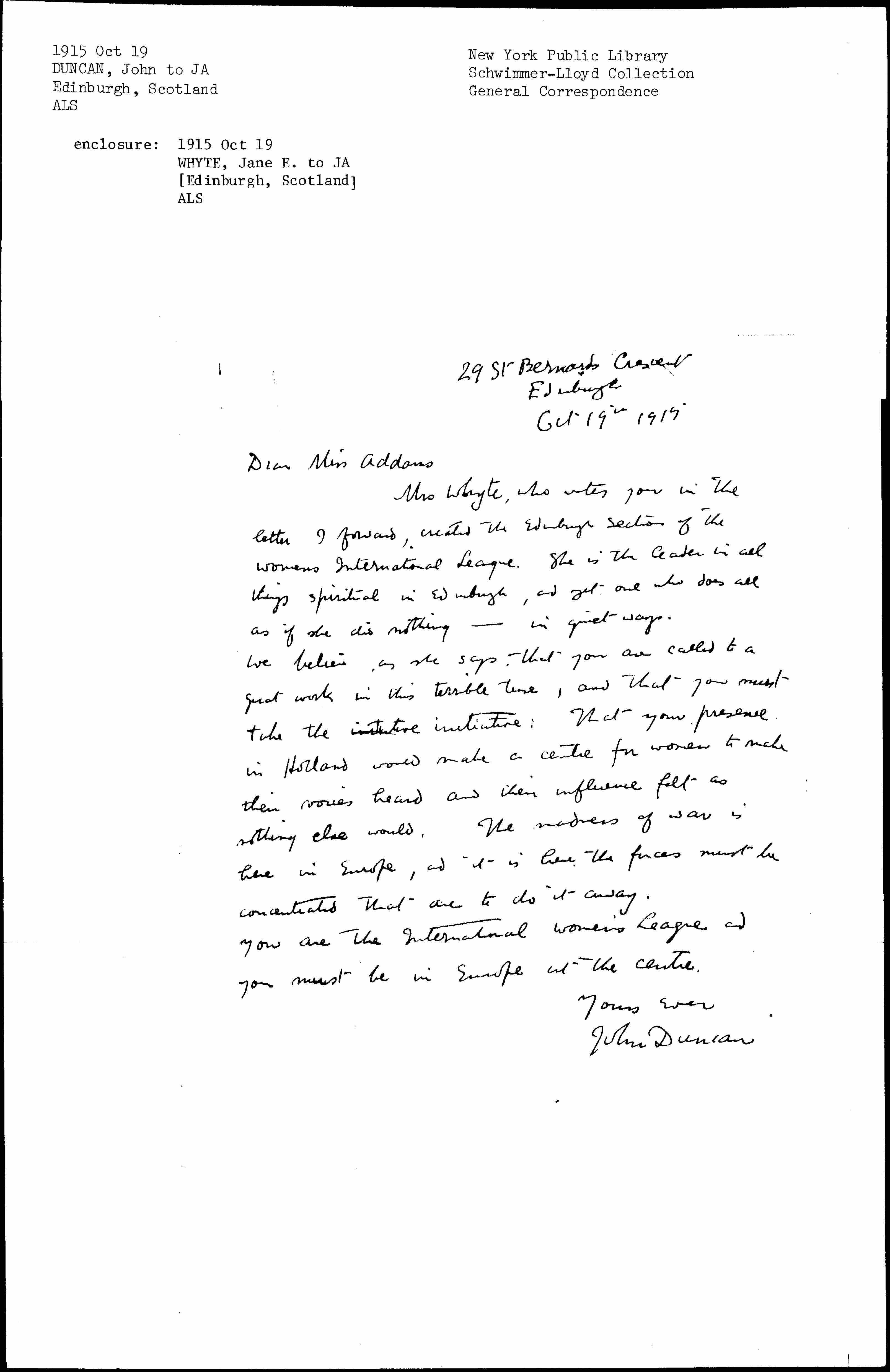 Mrs Whyte, who writes you in the letter I forward, created the Edinburgh Section of the Womens International League. She is the leader in all things spiritual in Edinburgh, and yet one who does all as if she did nothing -- in quiet ways.