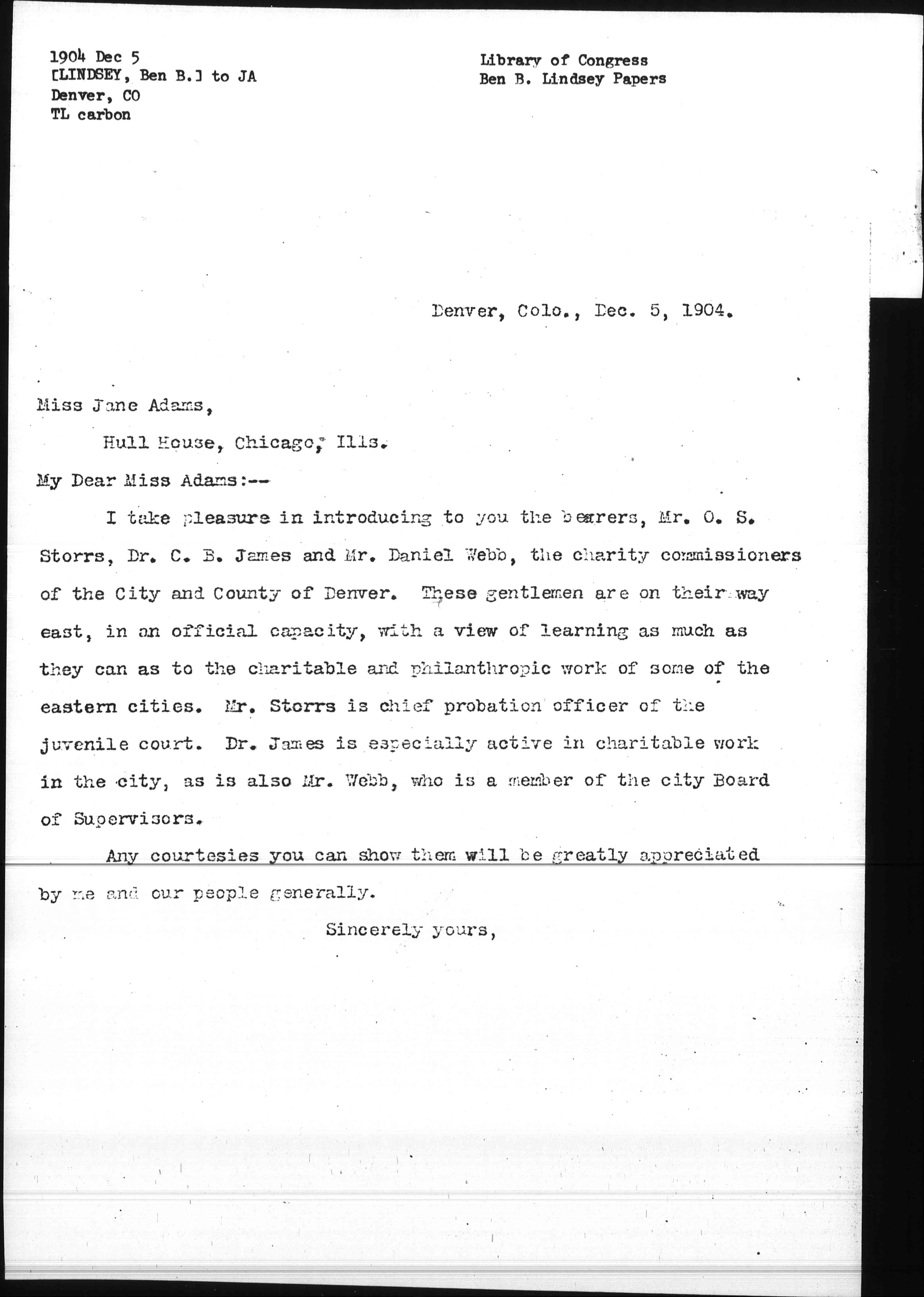 I take pleasure in introducing to you the bearers, Mr. O. S. Storrs, Dr. C. B. James and Mr. Daniel Webb, the charity commissioners of the City and County of Denver. These gentlemen are on their way east, in an official capacity, with a view of learning as much as they can as to the charitable and philanthropic work of some of the eastern cities. Mr. Storrs is chief probation officer of the juvenile court. Dr. James is especially active in charitable work in the city, as is also Mr. Webb, who is a member of the city Board of Supervisors.