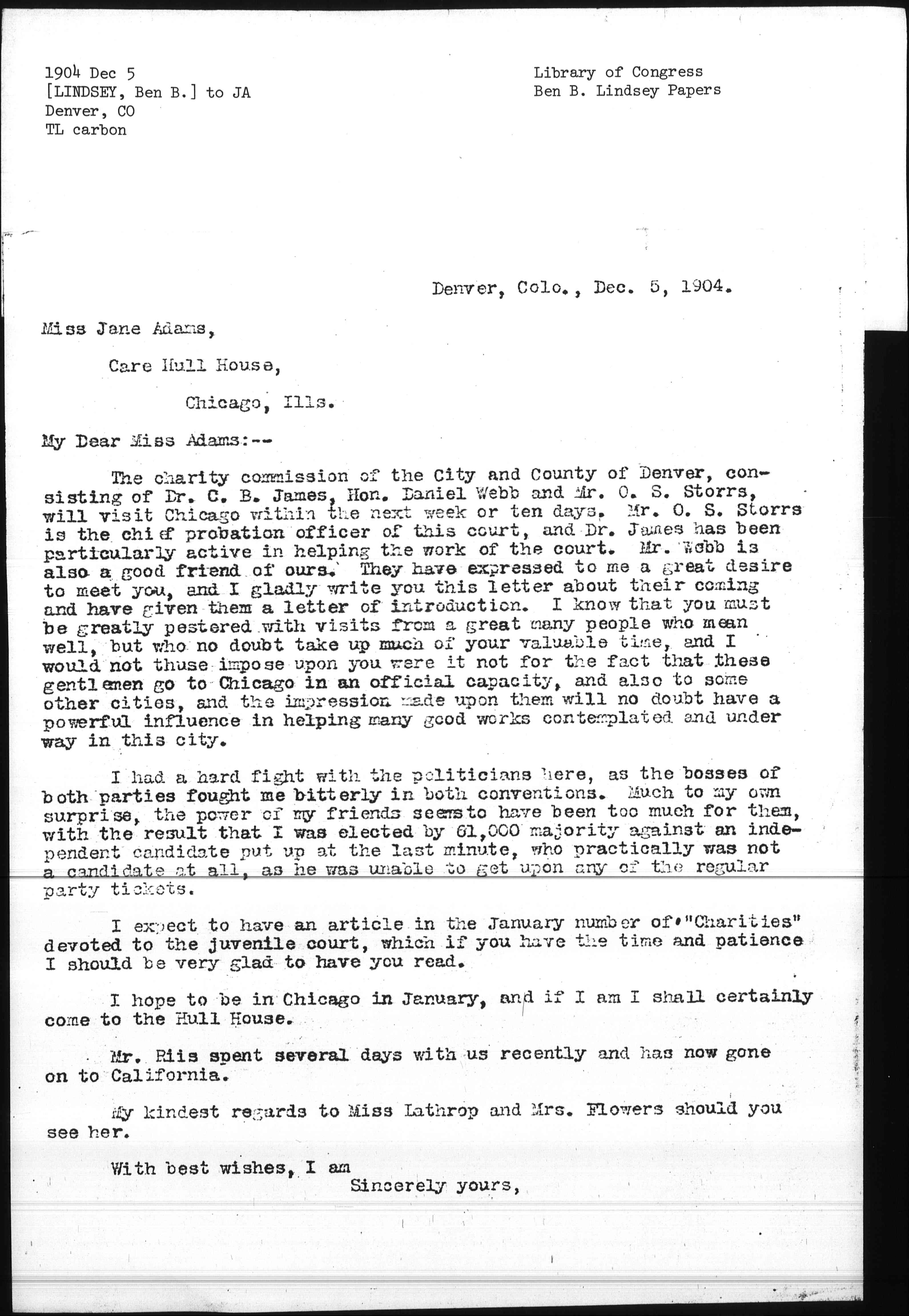 The charity commission of the City and County of Denver, consisting of Dr. C. B. James, Hon. Daniel Webb and Mr. O. S. Storrs, will visit Chicago within the next week or ten days. Mr. O. S. Storrs is the chief probation officer of this court, and Dr. James has been particularly active in helping the work of the court. Mr. Webb is also a good friend of ours. They have expressed to me a great desire to meet you, and I gladly write you this letter about their coming and have given them a letter of introduction. I know that you must be greatly pestered with visits from a great many people who mean well, but who no doubt take up much of your valuable time, and I would not thus impose upon you were it not for the fact that these gentlemen go to Chicago in an official capacity, and also to some other cities, and the impression made upon them will no doubt have a powerful influence in helping many good works contemplated and underway in this city.