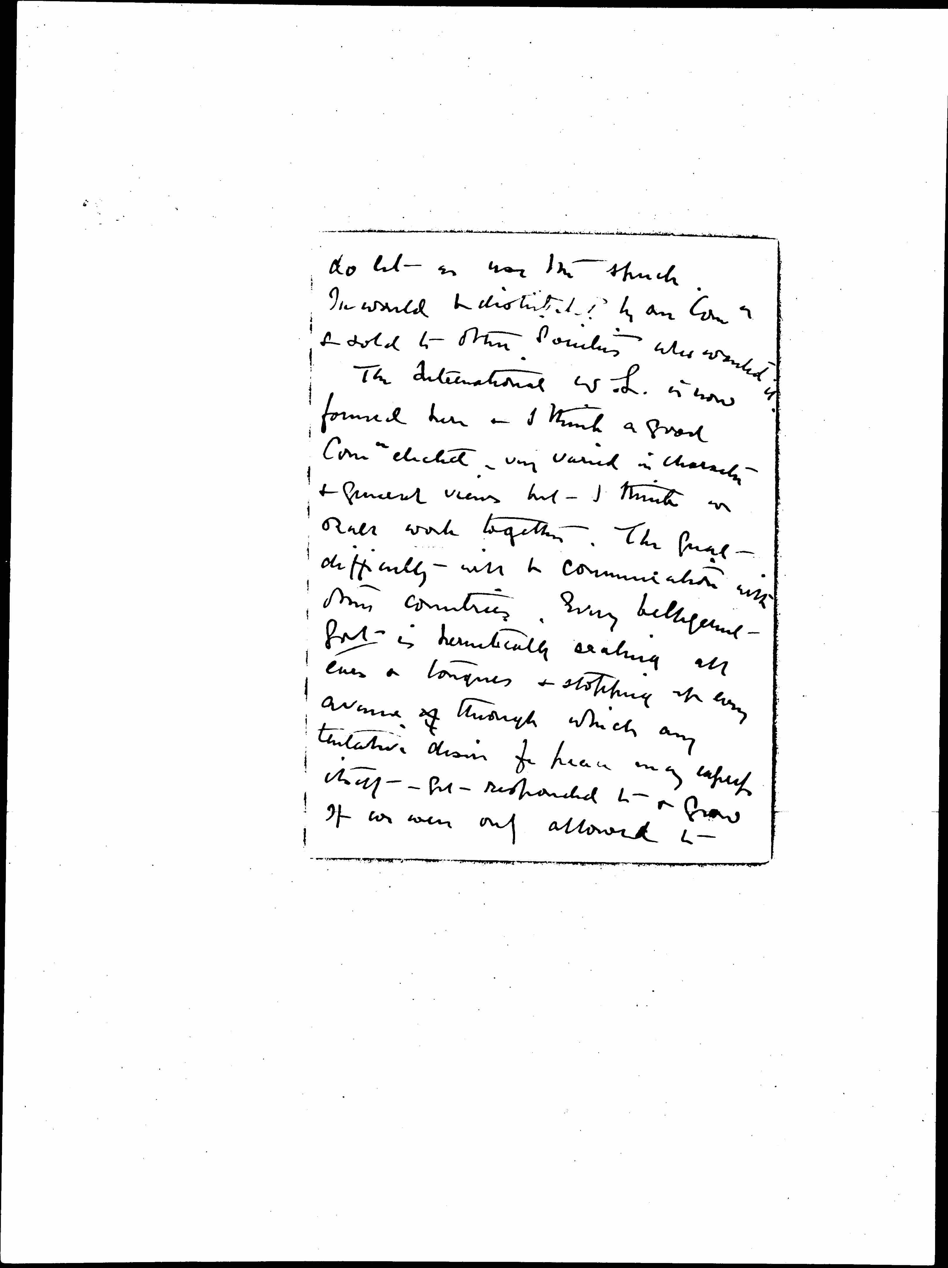 The International W.L. is now formed here & I think a good Comee elected -- very varied in character & general views but I think we shall work together. The great difficulty will be communication with other countries. Every belligerent Govt is hermetically sealing all ears & tongues & stopping up every avenue of through which any tentative desire for peace may [express] itself --[get?] -- responded to & grow. If we were only allowed to [written on left margin of page 1] talk to each other I believe we [would] find a common will to peace which [wd assert] itself -- [illegible] [best?]-- regards & wishes.