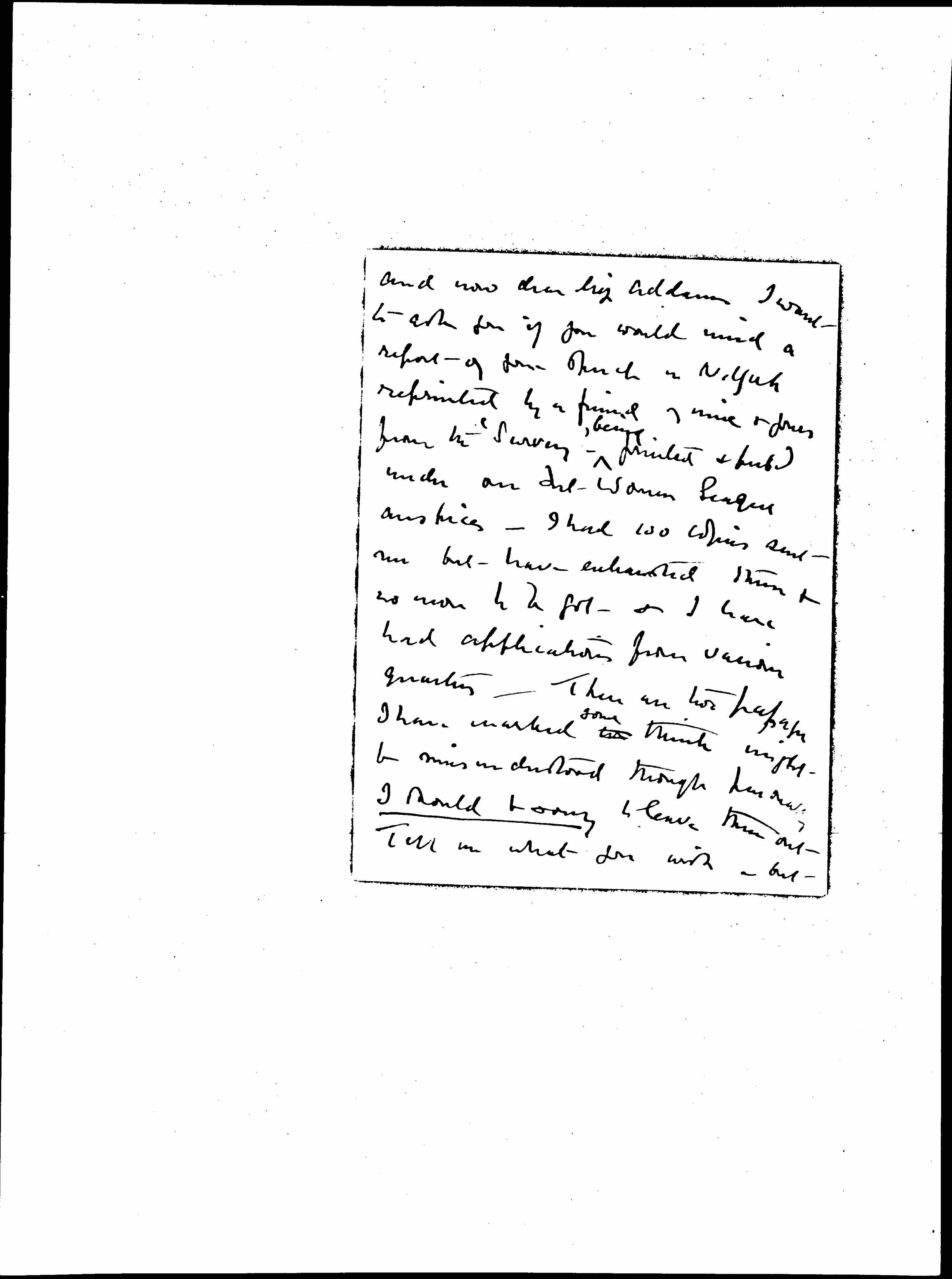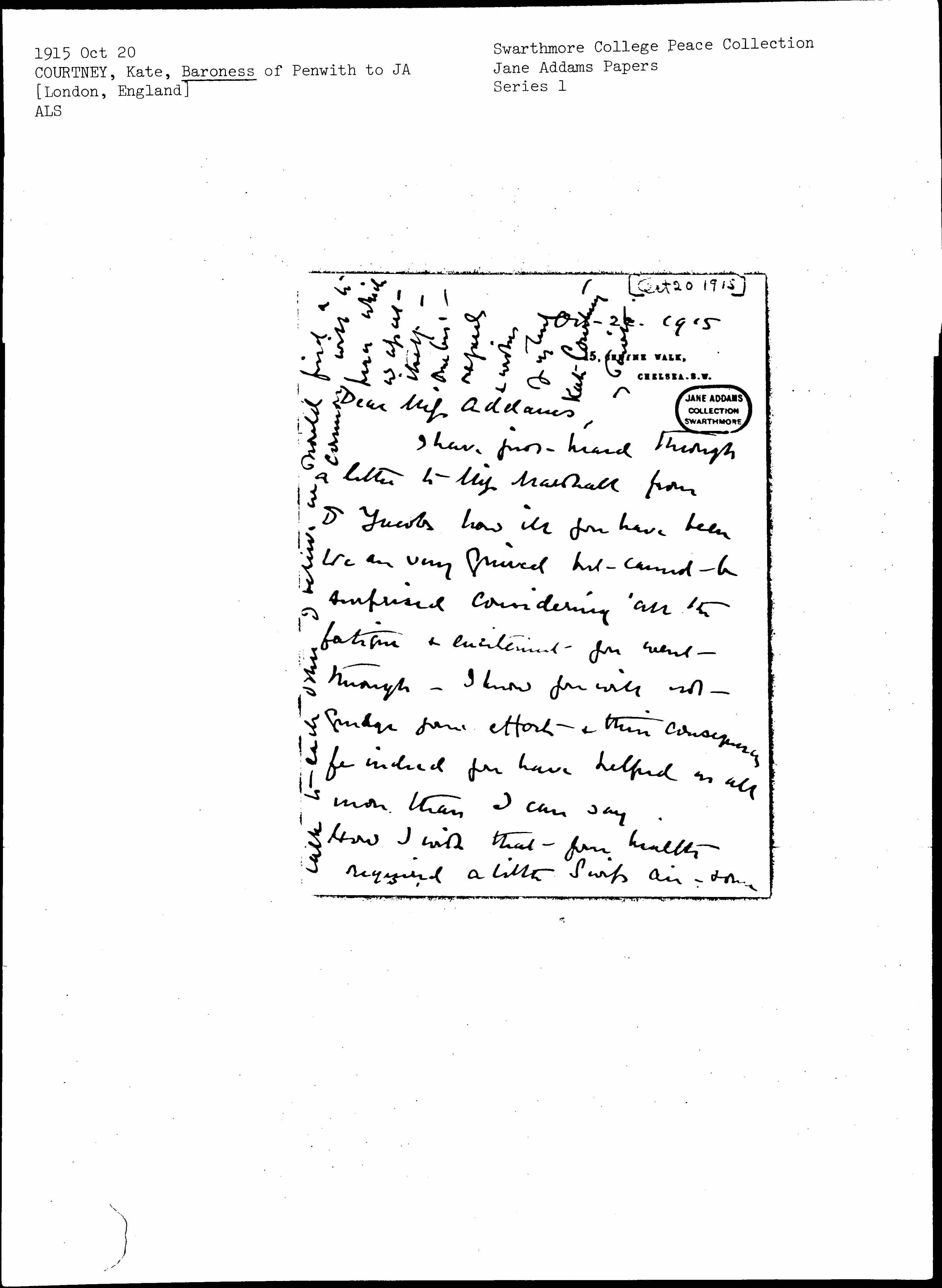 And now dear [Miss] Addams I want to ask you if you would mind a report of your speech in N. York reprinted by a friend of mine & yours from the "Survey" -- <being> printed & pubd under our Int Women League auspices -- I had 100 copies sent me but have exhausted them & no more to be got & I have had applications from various quarters. There are two [passages] I have marked we <some> think might be misunderstood though [personally] I should be sorry to leave them out. Tell me what you wish -- but [page 4] do let us use the speech. It would be distributed by our Comee & sold to other Societies who wanted it.