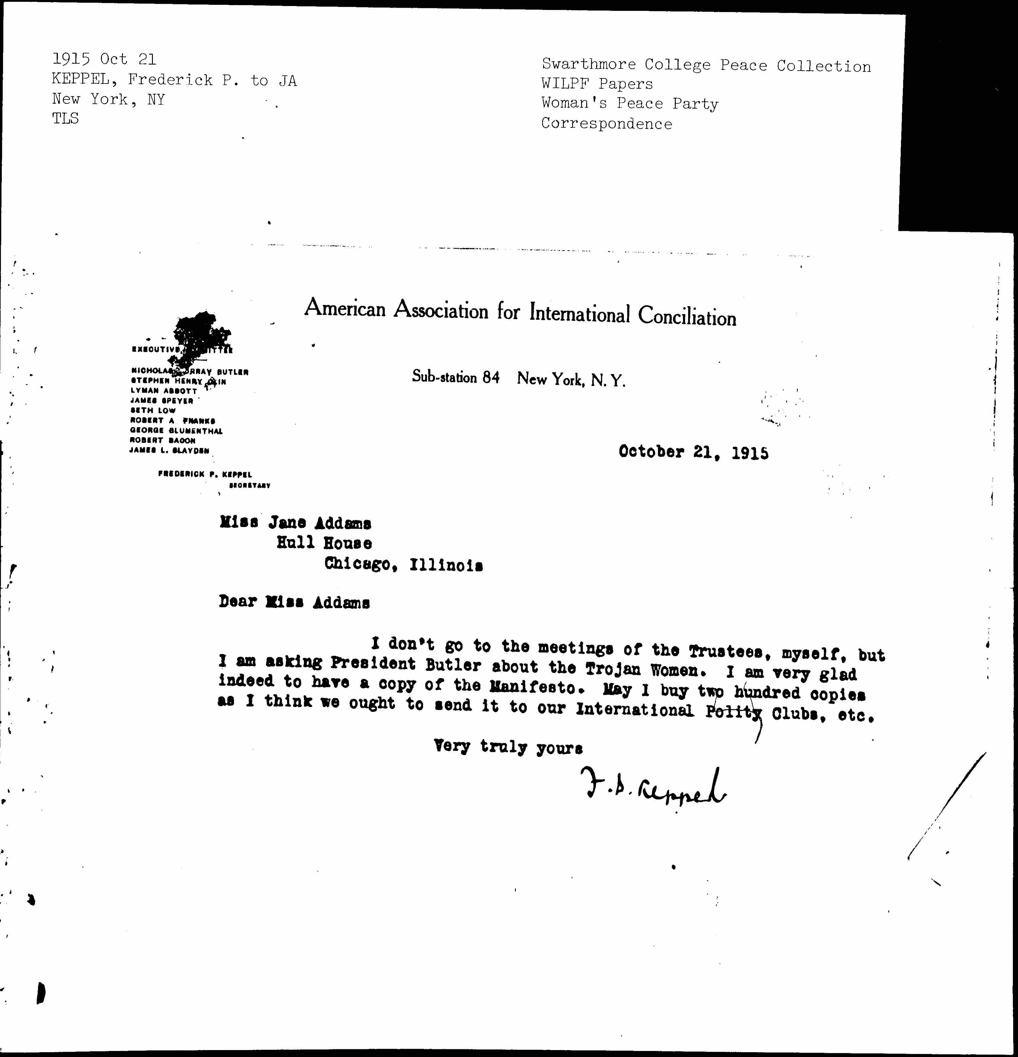 I don't go to the meetings of the Trustees, myself, but I am asking President Butler about the Trojan Women. I am very glad indeed to have a copy of the Manifesto. May I buy two hundred copies as I think we ought to send it to our International Polity Clubs, etc.