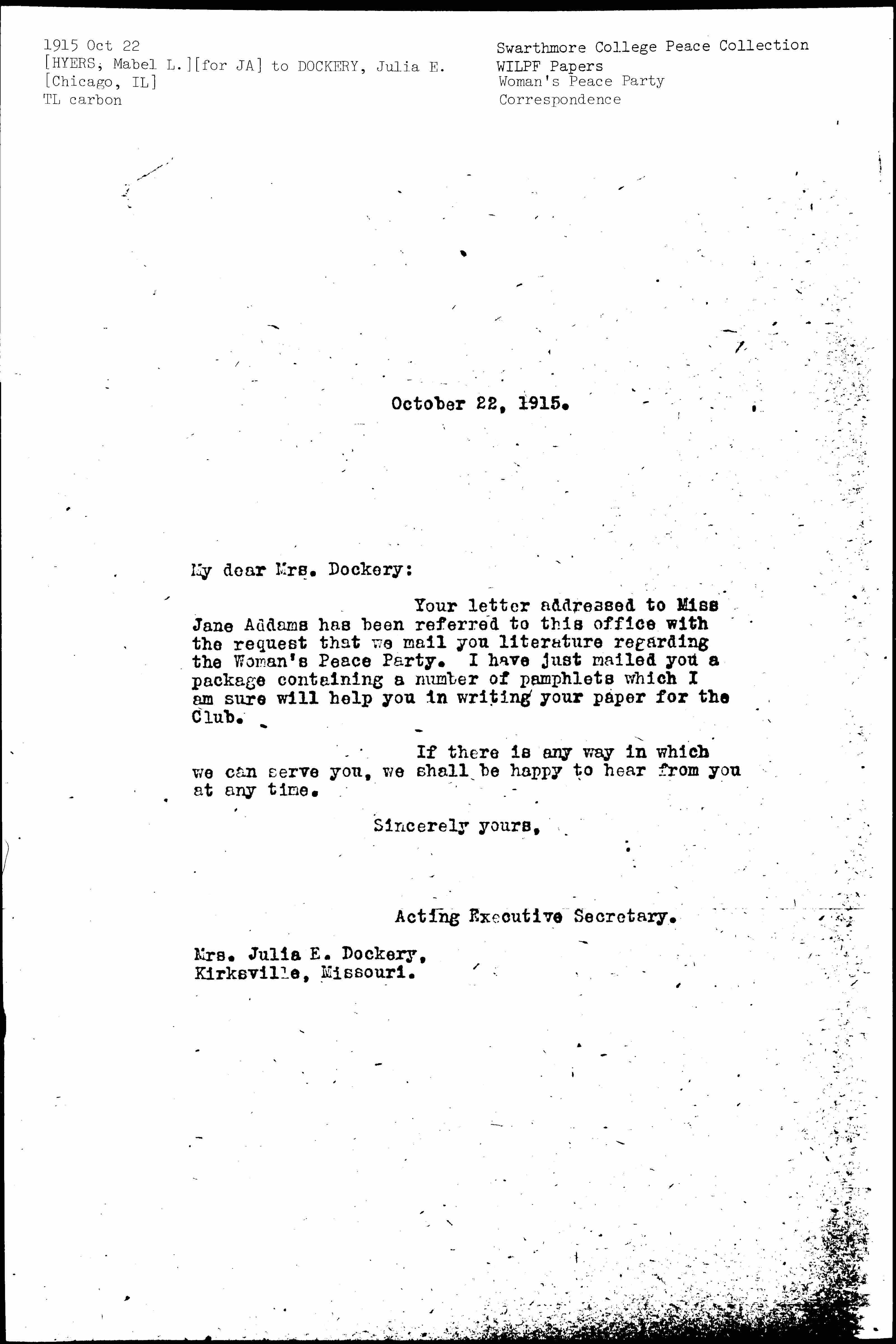 Your letter addressed to Miss Jane Addams has been referred to this office with the request that we mail you literature regarding the Woman's Peace Party. I have just mailed you a package containing a number of pamphlets which I am sure will help you in writing your paper for the Club.