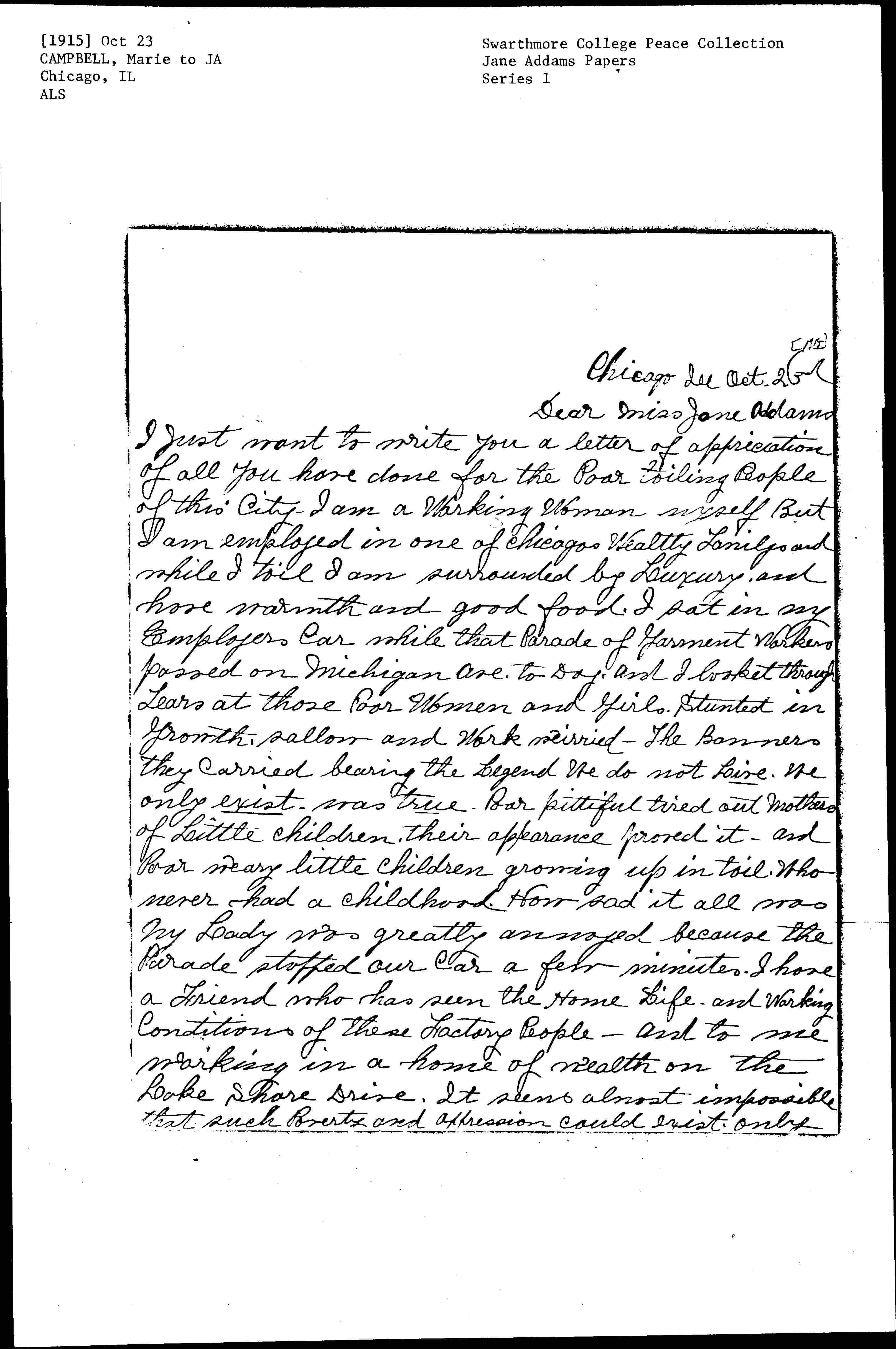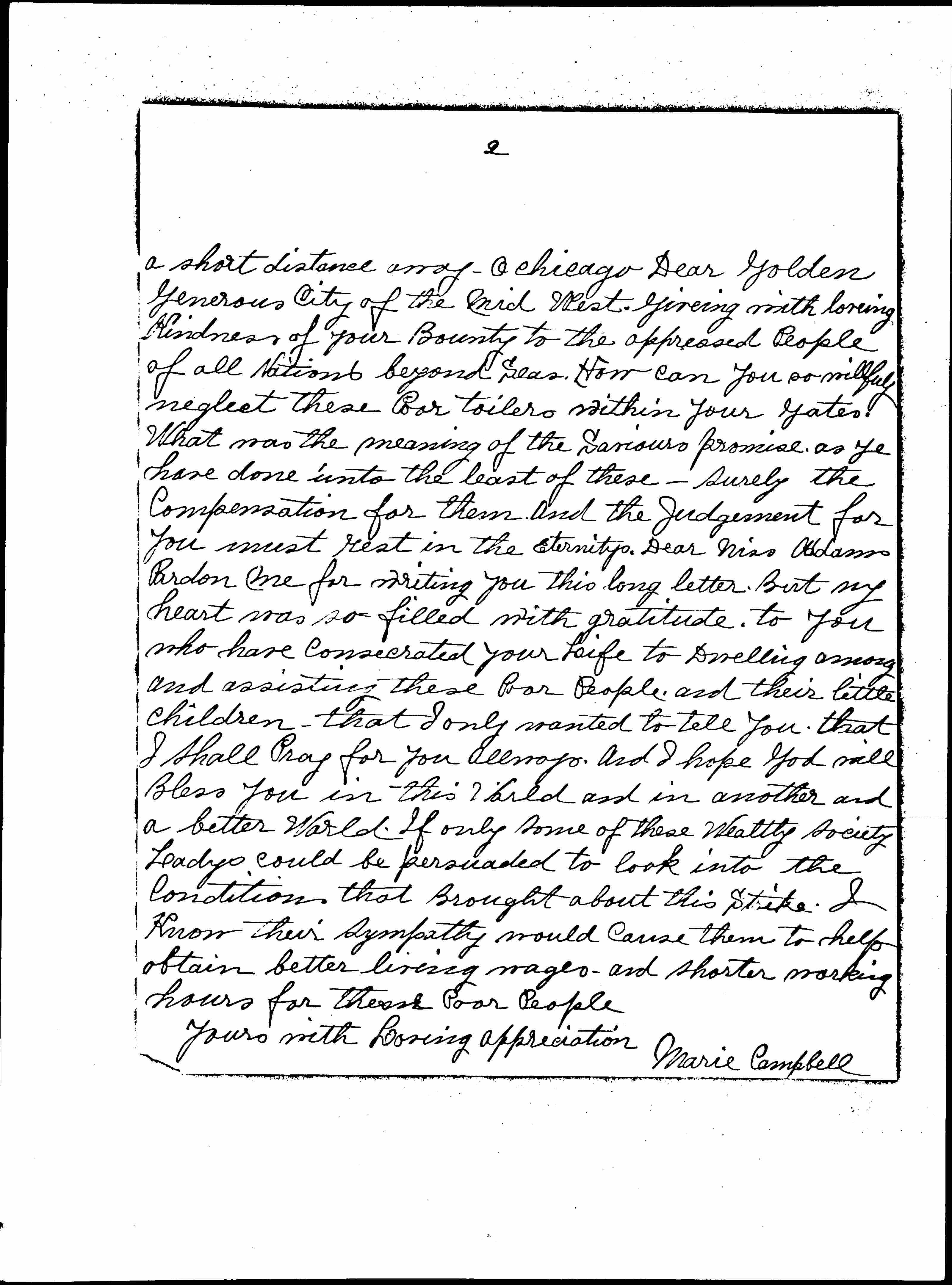 I just want to write you a letter of [appreciation] of all you have done for the Poor toiling People of this City. I am a Working Woman myself But I am employed in one of Chicagos Wealthy [Families] and while I toil I am surrounded by Luxury, and [have] warmth and good food. I sat in my Employers Car while that Parade of Garment Workers passed on Michigan Ave. [today], and I [looked] through Tears at those Poor Women and Girls. Stunted in Growth, sallow and Work [wearied] -- The Banners they carried bearing the Legend We do not Live. We only exist -- was true. Poor [pitiful] tired out mothers of Little children, their appearance proved it -- and Poor weary little children growing up in toil, who never had a childhood. How sad it all was my Lady was greatly annoyed because the Parade stopped our car a few minutes. I have a Friend who has seen the Home Life -- and working conditions of these Factory People -- and to me working in a home of wealth on the Lake Shore Drive, It seems almost impossible that such Poverty and oppression could exist only [page 2] a short distance away. O Chicago Dear Golden Generous City of the Mid West [giving] with [loving] Kindness of your Bounty to the oppressed People of all Nations beyond Seas. How can you so [willfully] neglect these Poor toilers within your Gates. What was the meaning of the [Saviors] promise, as Ye have done unto the least of these -- surely the Compensation for them and the [Judgment] for You must rest in the [eternities]. Dear Miss Addams Pardon me for writing you this long letter. But my heart was so filled with gratitude to you who have consecrated your Life to Dwelling among and assisting these Poor People, and their little children -- that I only wanted to tell you that I shall Pray for You [always]. And I hope God will Bless You in this World and in another and a better World. If only some of these Wealthy society [Ladies] could be persuaded to look into the Condition that Brought about this Strike. I Know their sympathy would cause them to help obtain better living wages -- and shorter working hours for [these] Poor People