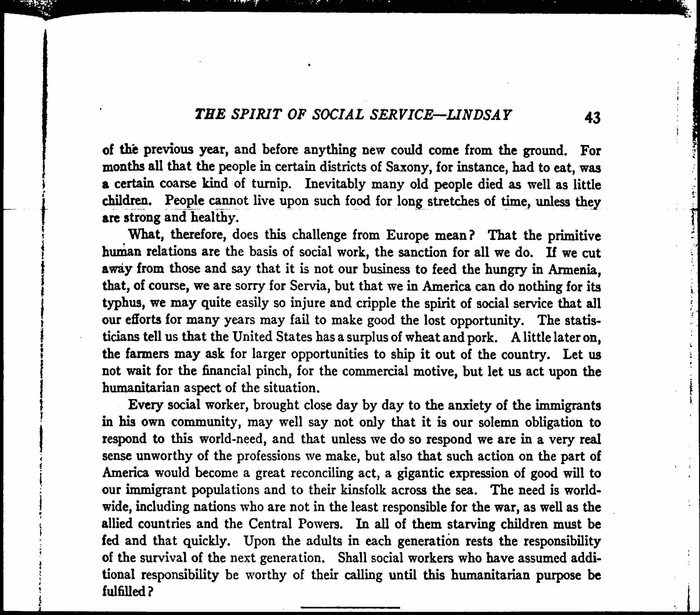 Every social worker, brought close day by day, to the anxiety of the immigrants in his own community, may well say not only that it is our solemn obligation to respond to this world-need, and that unless we do so respond we are in a very real sense unworthy of the professions we make, but also that such action on the part of America would become a great reconciling act, a gigantic expression of good will to our immigrant populations and to their kinsfolk across the sea. The need is world-wide, including nations who are not in the least responsible for the war, as well as the allied countries and the Central Powers. In all of them starving children must be fed and that quickly. Upon the adults in each generation rests the responsibility of the survival of the next generation. Shall social workers who have assumed additional responsibility be worthy of their calling until this humanitarian purpose be fulfilled?