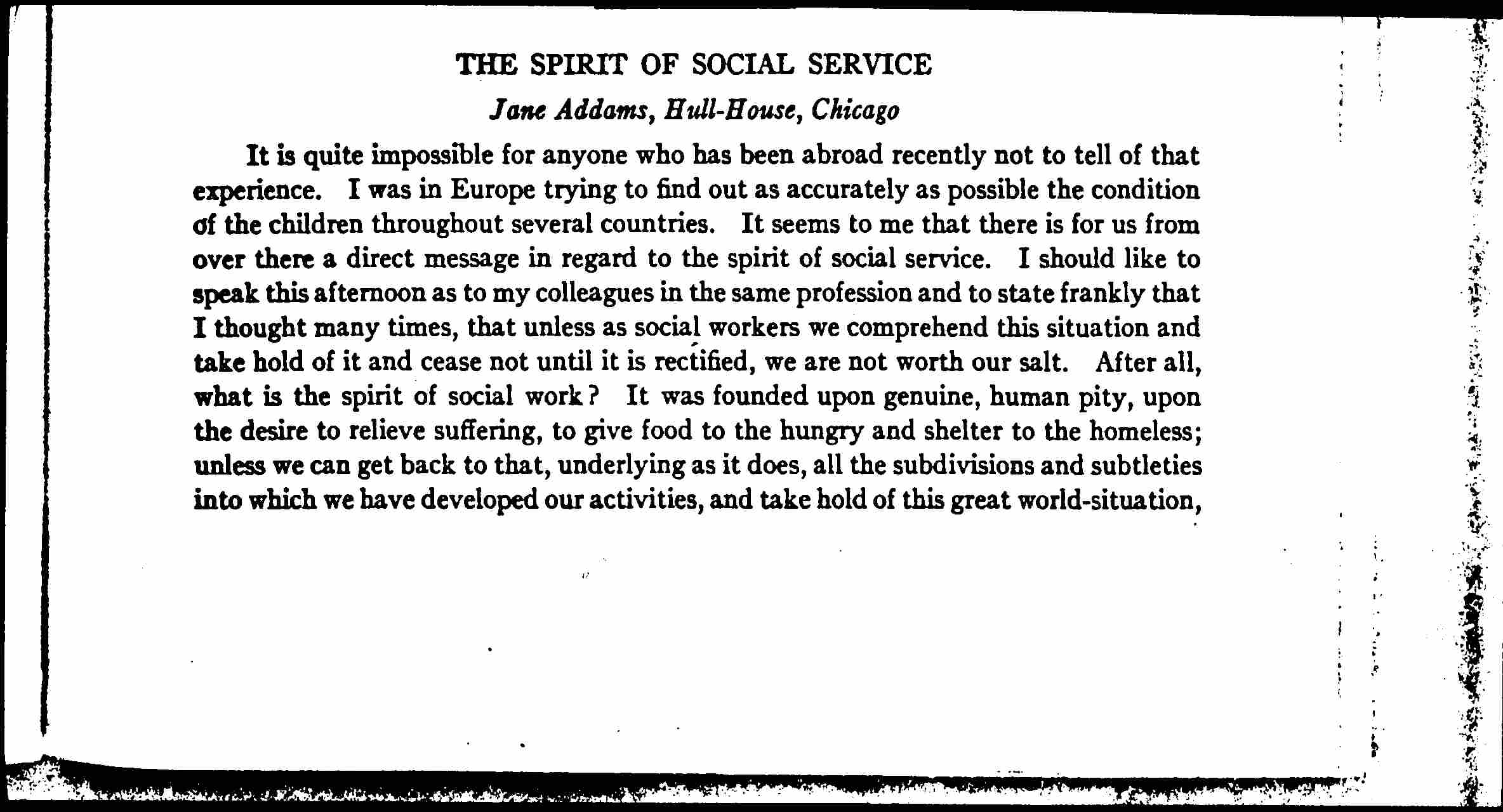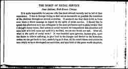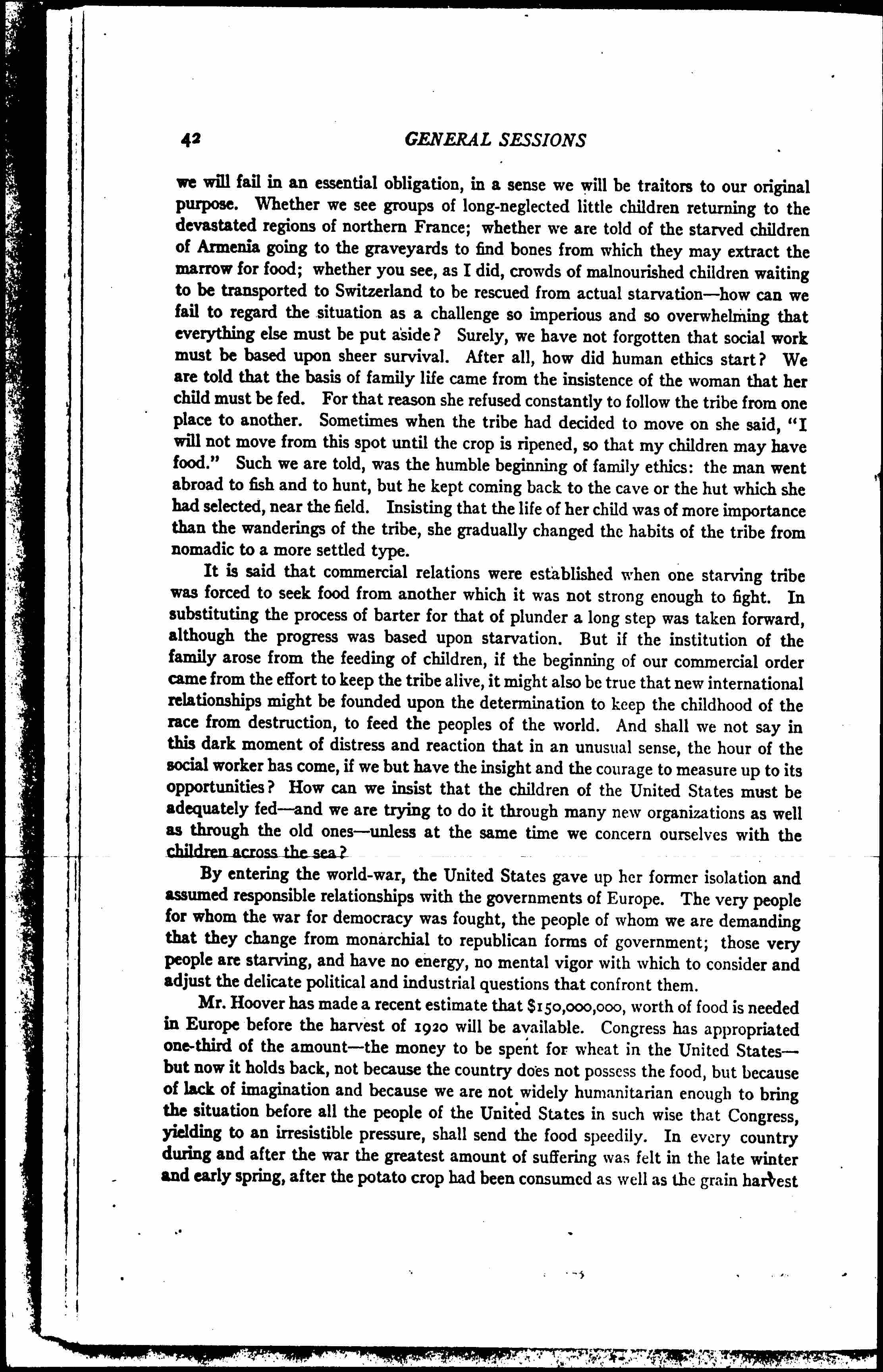 It is quite impossible for anyone who has been abroad recently not to tell of that experience. I was in Europe trying to find out as accurately as possible the condition of the children throughout several countries. It seems to me too that there is for us from over there a direct message in regard to the spirit of social service. I should like to speak this afternoon as to my colleagues in the same profession and to state frankly that I thought many times, that unless as social workers we comprehend this situation and take hold of it and cease not until it was rectified, we are not worth our salt. After all, what is the spirit of social work? It was founded upon genuine, human pity, upon the desire to relieve suffering, to give food to the hungry and shelter to the homeless; unless we can get back to that, underlying as it does, all the subdivisions and subtleties into which we have developed our activities, and take hold of this great world-situation, [page 2] we will fail in an essential obligation, in a sense we will be traitors to our original purpose. Whether we see groups of long-neglected little children returning to the devastated regions of northern France; whether we are told of the starved children of Armenia going to the graveyards to find bones from which they may extract the marrow for food; whether you see, as I did, crowds of malnourished children waiting to be transported to Switzerland to be rescued from actual starvation -- how can we fail to regard the situation as a challenge so imperious and so overwhelming that everything else must be put aside? Surely, we have not forgotten that social work must be based upon sheer survival. After all, how did human ethics start? We are told that the basis of family life came from the insistence of the woman that her child must be fed. For that reason she refused constantly to follow the tribe from one place to another. Sometimes when the tribe had decided to move on she said, "I will not move from this spot until the crop is ripened, so that my children may have food." Such we are told, was the humble beginning of family ethics: the man went abroad to fish and to hunt, but he kept coming back to the cave or the hut which she had selected, near the field. Insisting that the life of her child was of more importance than the wanderings of the tribe, she gradually changed the habits of the tribe from nomadic to a more settled type.
