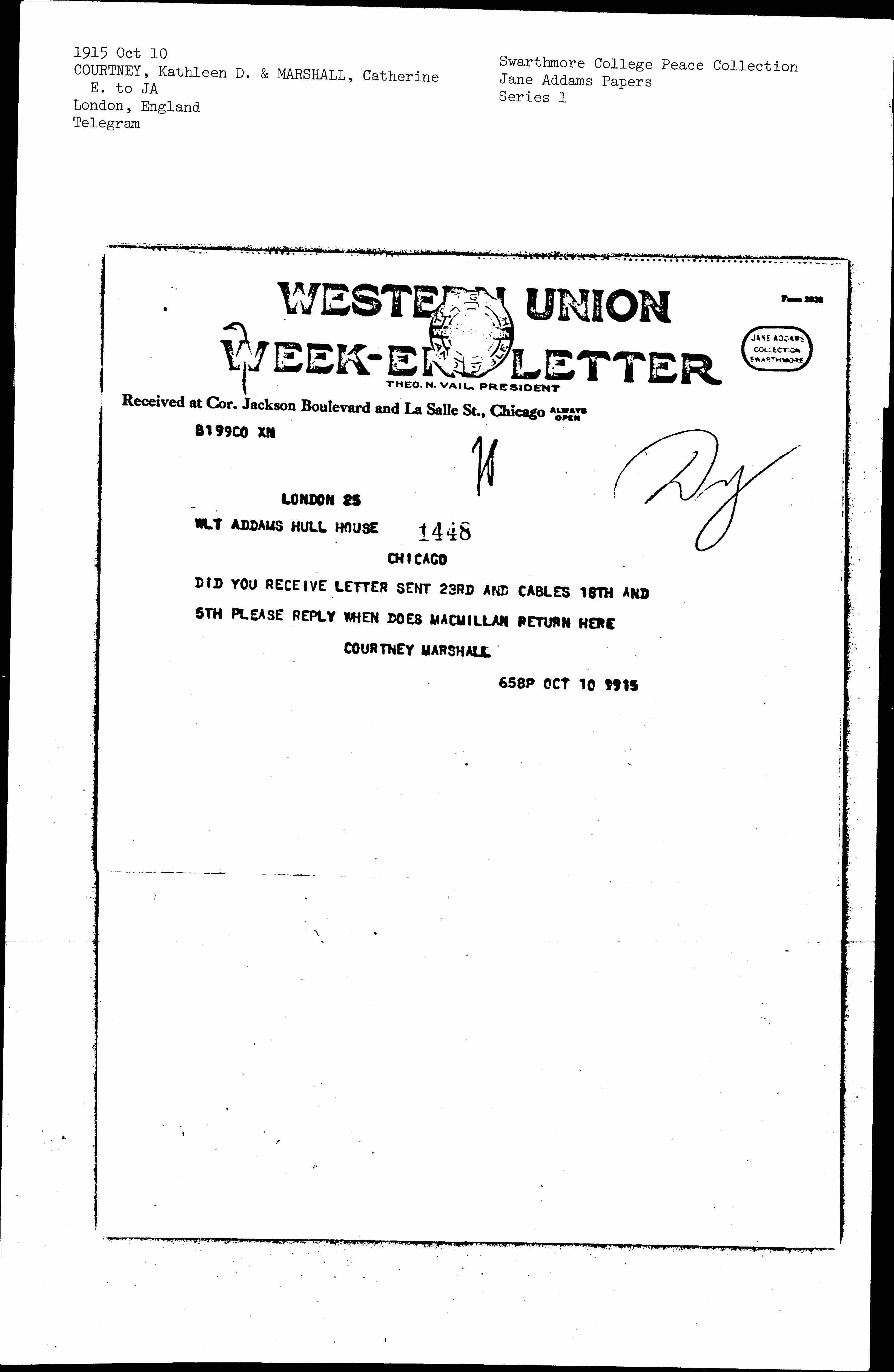 DID YOU RECEIVE LETTER SENT 23RD AND CABLES 18TH AND 5TH PLEASE REPLY WHEN DOES MACMILLAN RETURN HERE