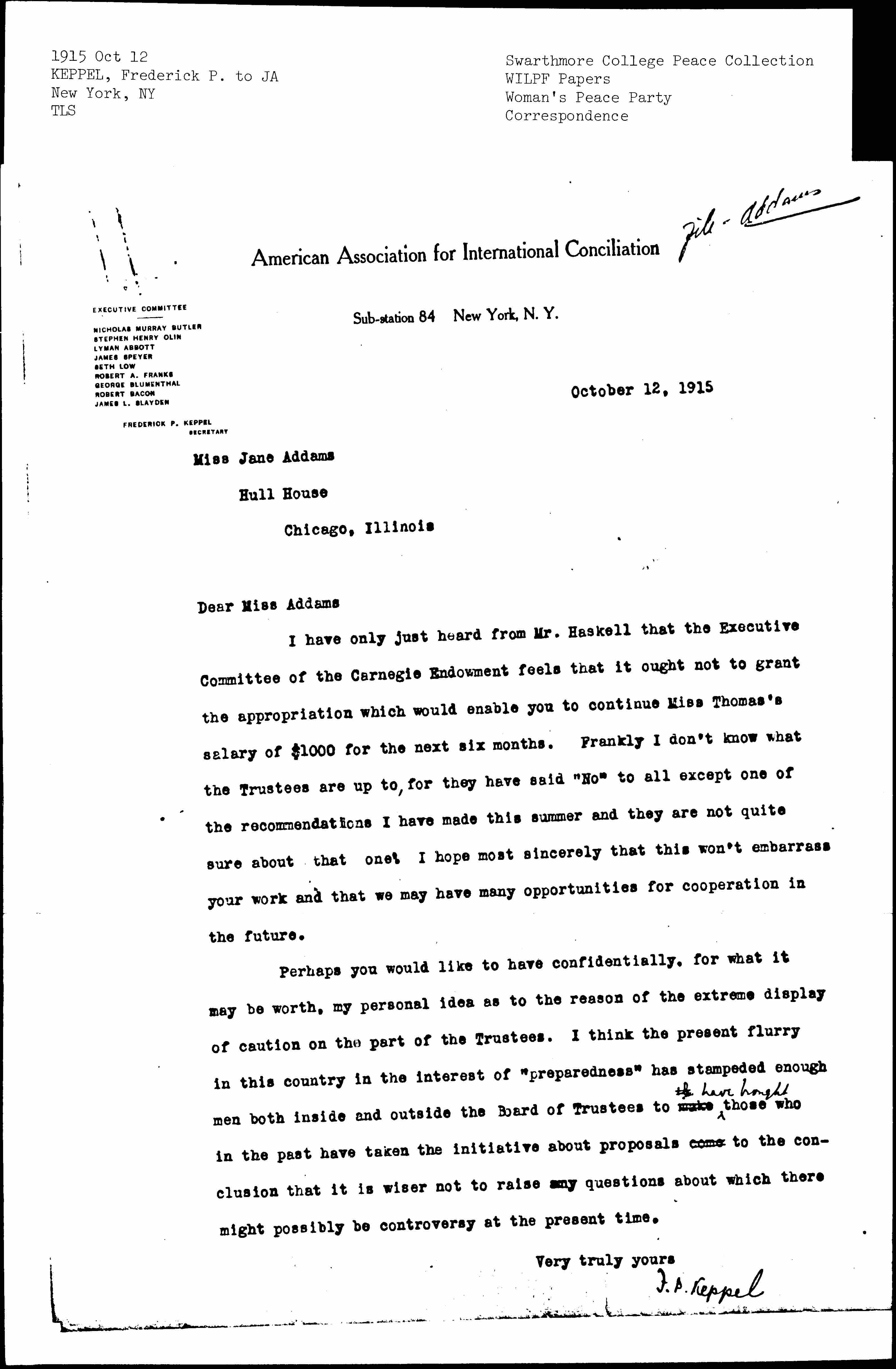 I have only just heard from Mr. Haskell that the Executive Committee of the Carnegie Endowment feels that it ought not to grant the appropriation which would enable you to continue Miss Thomas's salary of $1000 for the next six months. Frankly I don't know what the Trustees are up to, for they have said "No" to all except one of the recommendations I have made this summer and they are not quite sure about that one! I hope most sincerely that this won't embarrass your work and that we may have many opportunities for cooperation in the future.