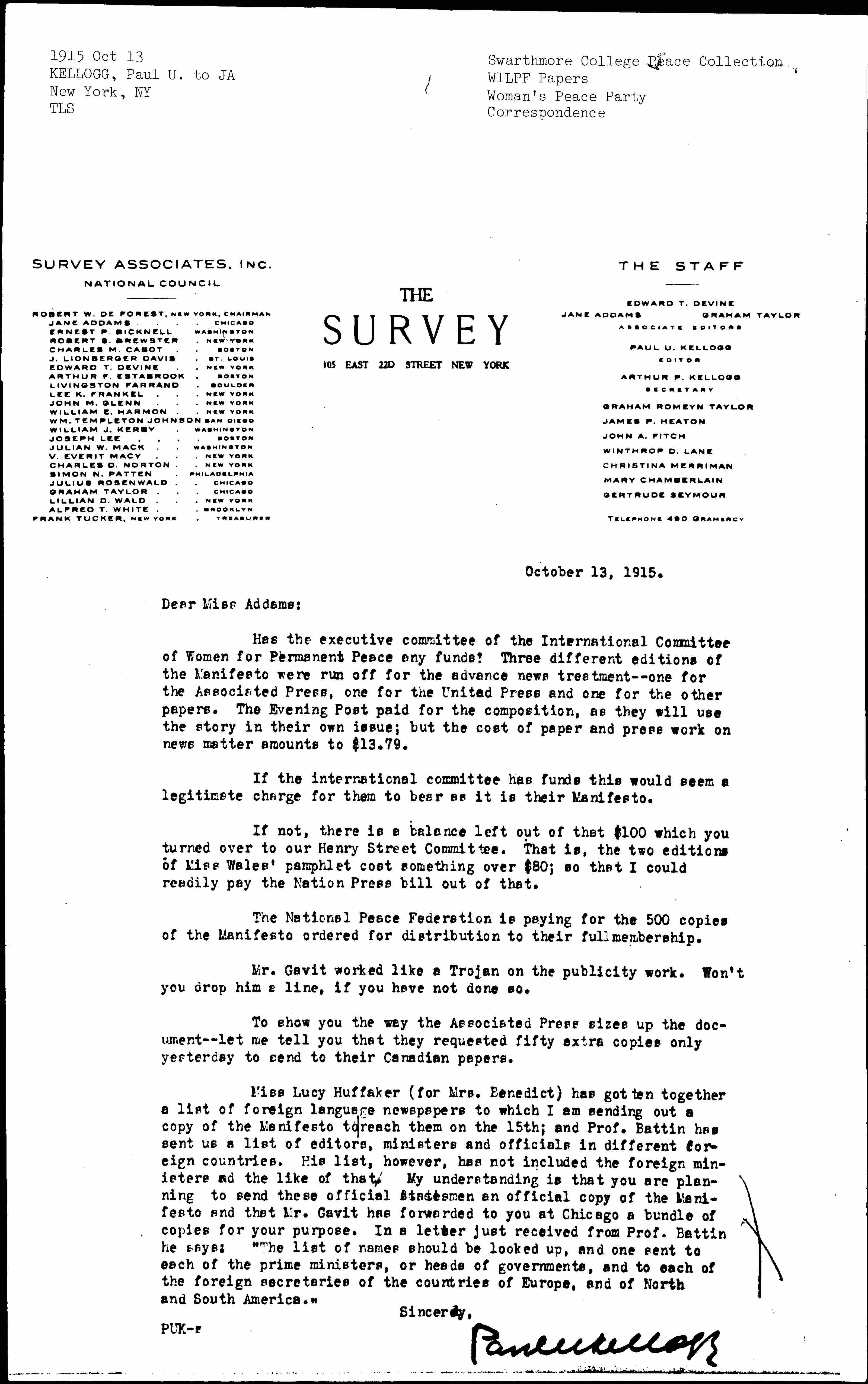 Has the executive committee of the International Committee of Women for Permanent Peace any funds? Three different editions of the Manifesto were run off for the advance news treatment -- one for the Associated Press, one for the United Press and one for the other papers. The Evening Post paid for the composition, as they will use the story in their own issue; but the cost of paper and press work on news matter amounts to $13.79.