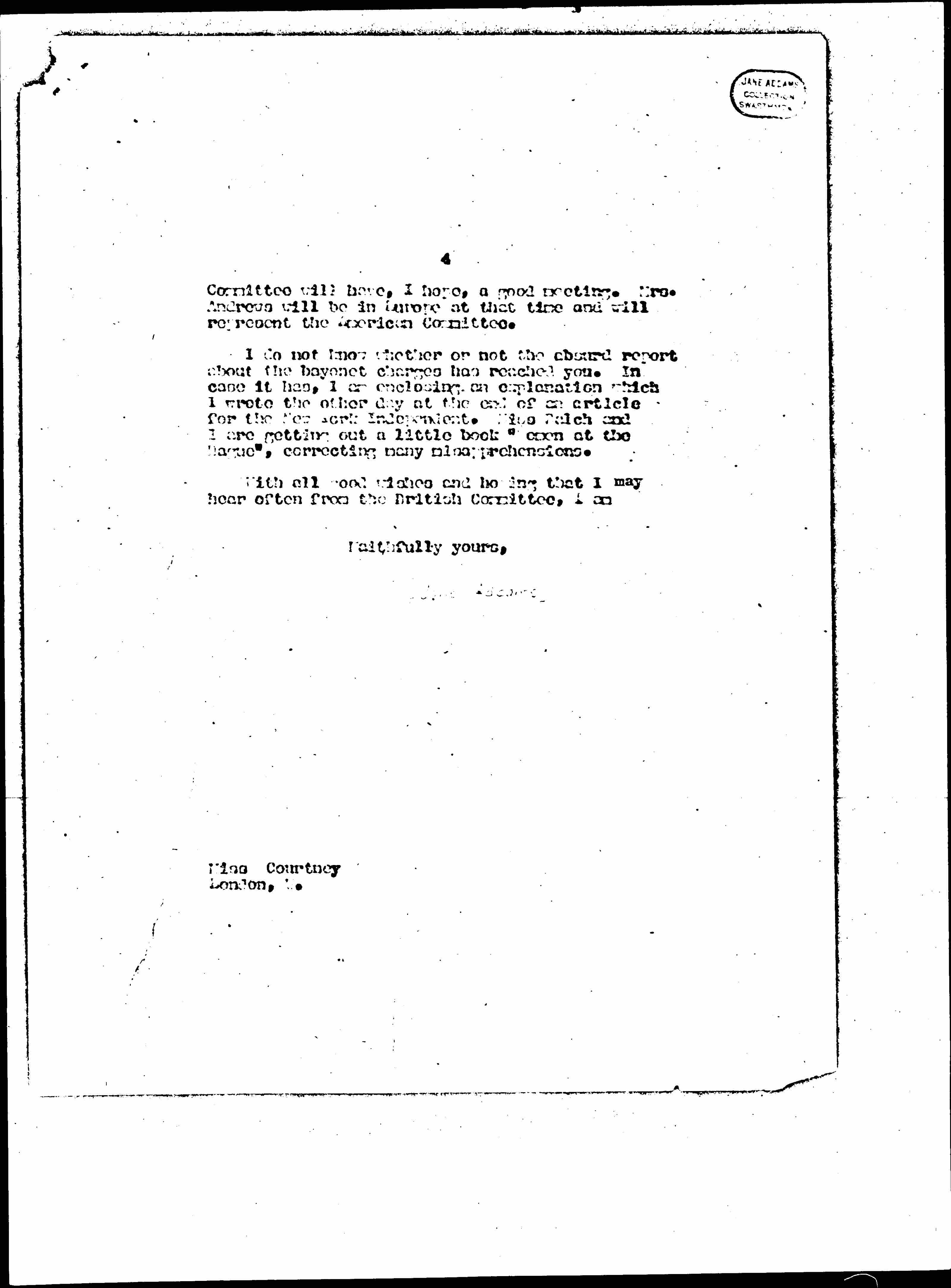I do not know whether or not the absurd report about the bayonet charges has reached you. In case it has, I am enclosing an explanation which I wrote the other day at the end of an article for the New York Independent. Miss Balch and I are getting out a little book "Women at The Hague", correcting many misapprehensions.