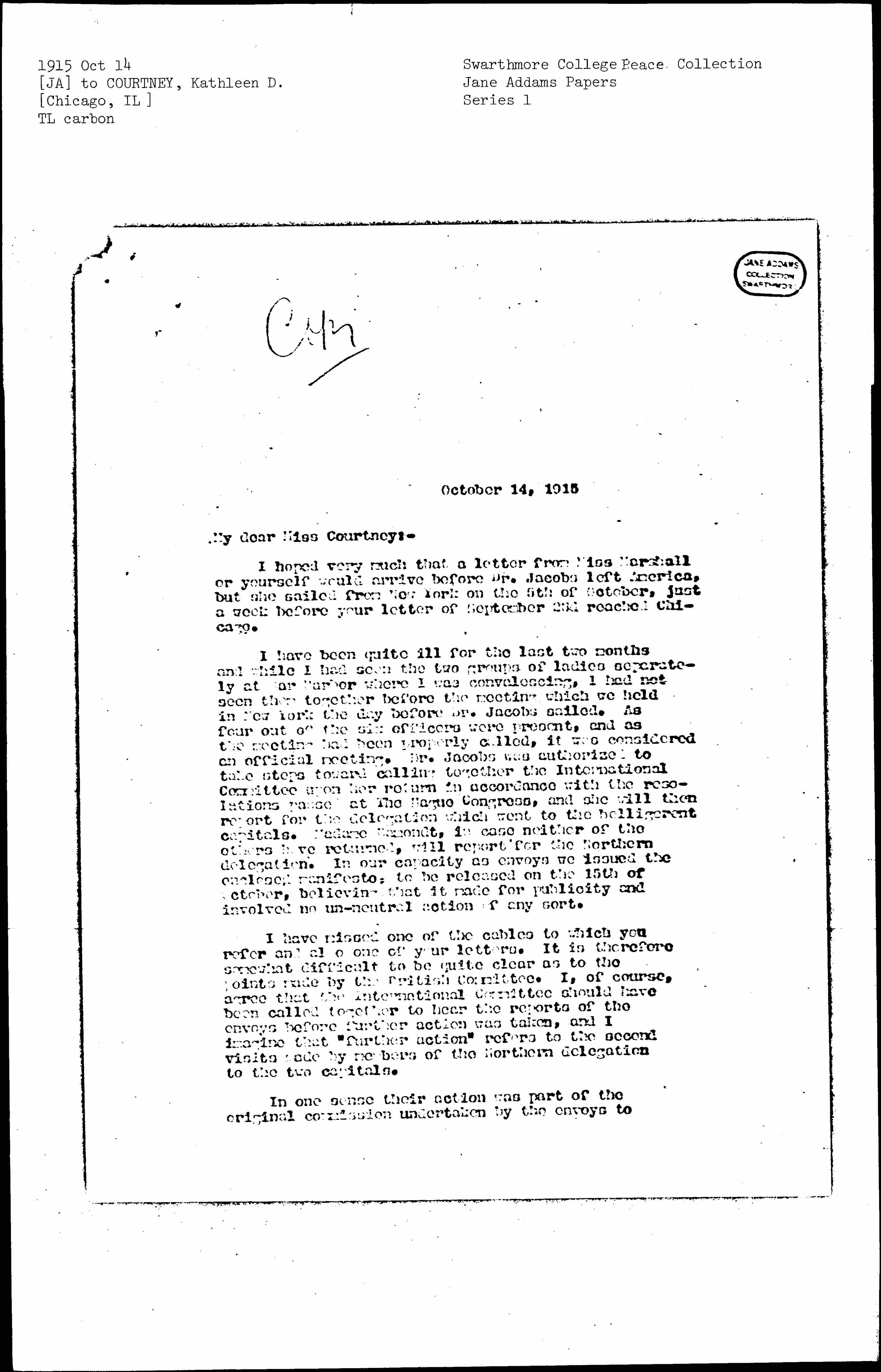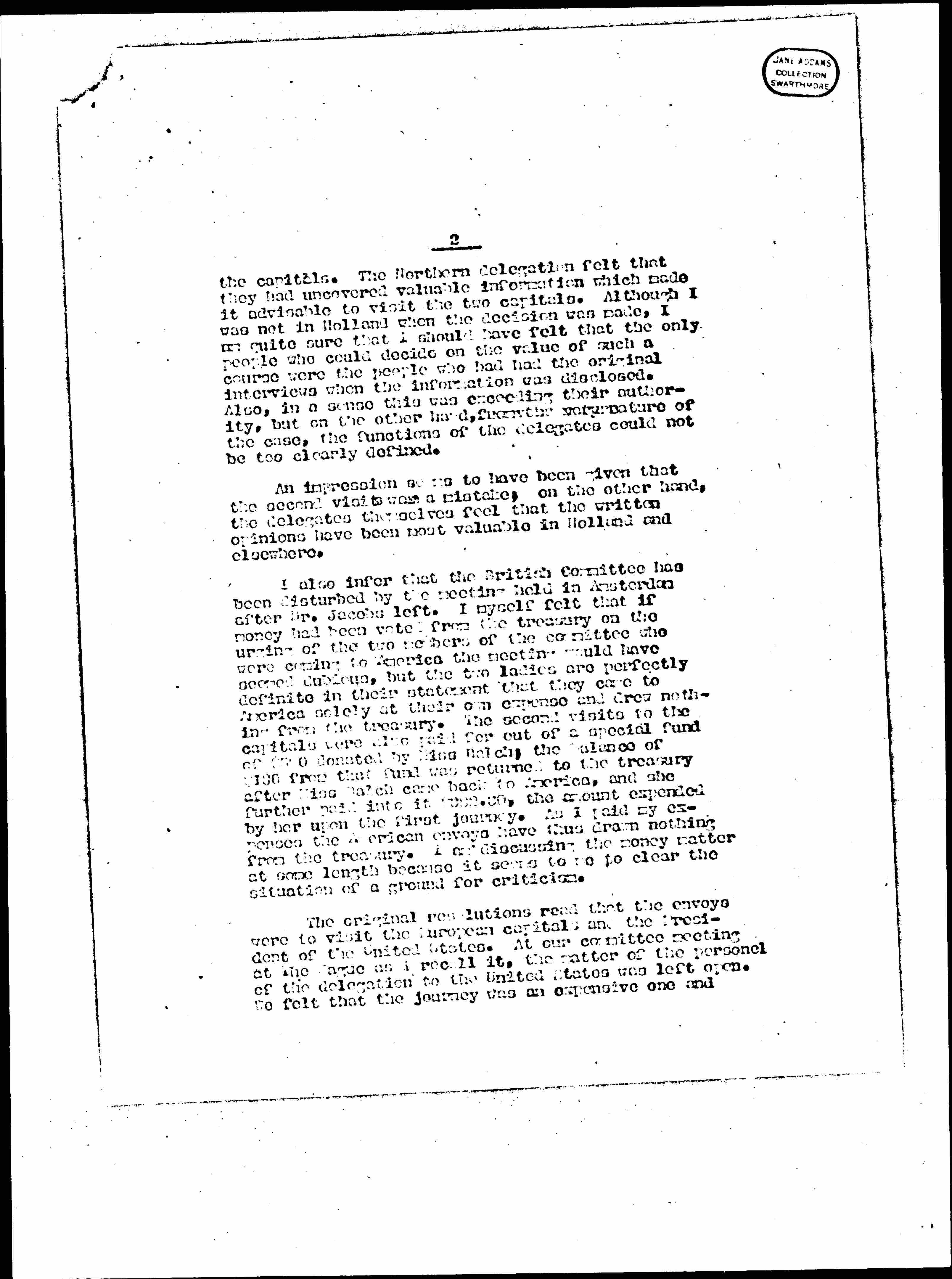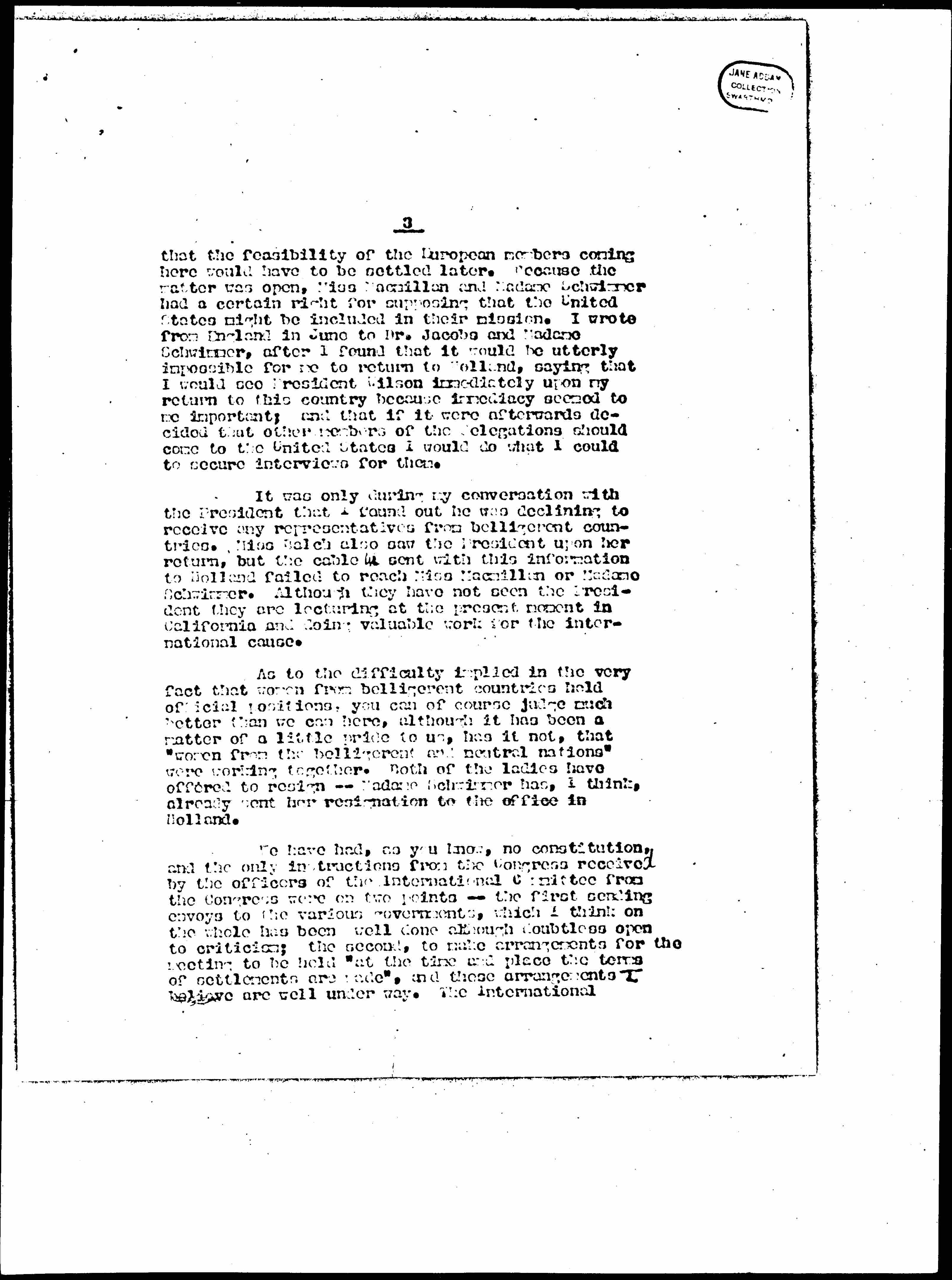The original resolutions read that the envoys were to visit the European capitals and the President of the United States. At our committee meeting at The Hague as I recall it, the matter of the [personnel] of the delegation to the United States was left open. We felt that the journey was an expensive one and [page 3] that the feasibility of the European members coming here would have to be settled later. Because the matter was open, Miss Macmillan and Madame Schwimmer had a certain right for supposing that the United States might be included in their mission. I wrote from England in June to Dr. Jacobs and Madame Schwimmer, after I found that it would be utterly impossible for me to return to Holland, saying that I would see President Wilson immediately upon my return to this country because immediacy seemed to me important; and that if it were afterwards decided that other members of the delegations should come to the United States I would do what I could to secure interviews for them.