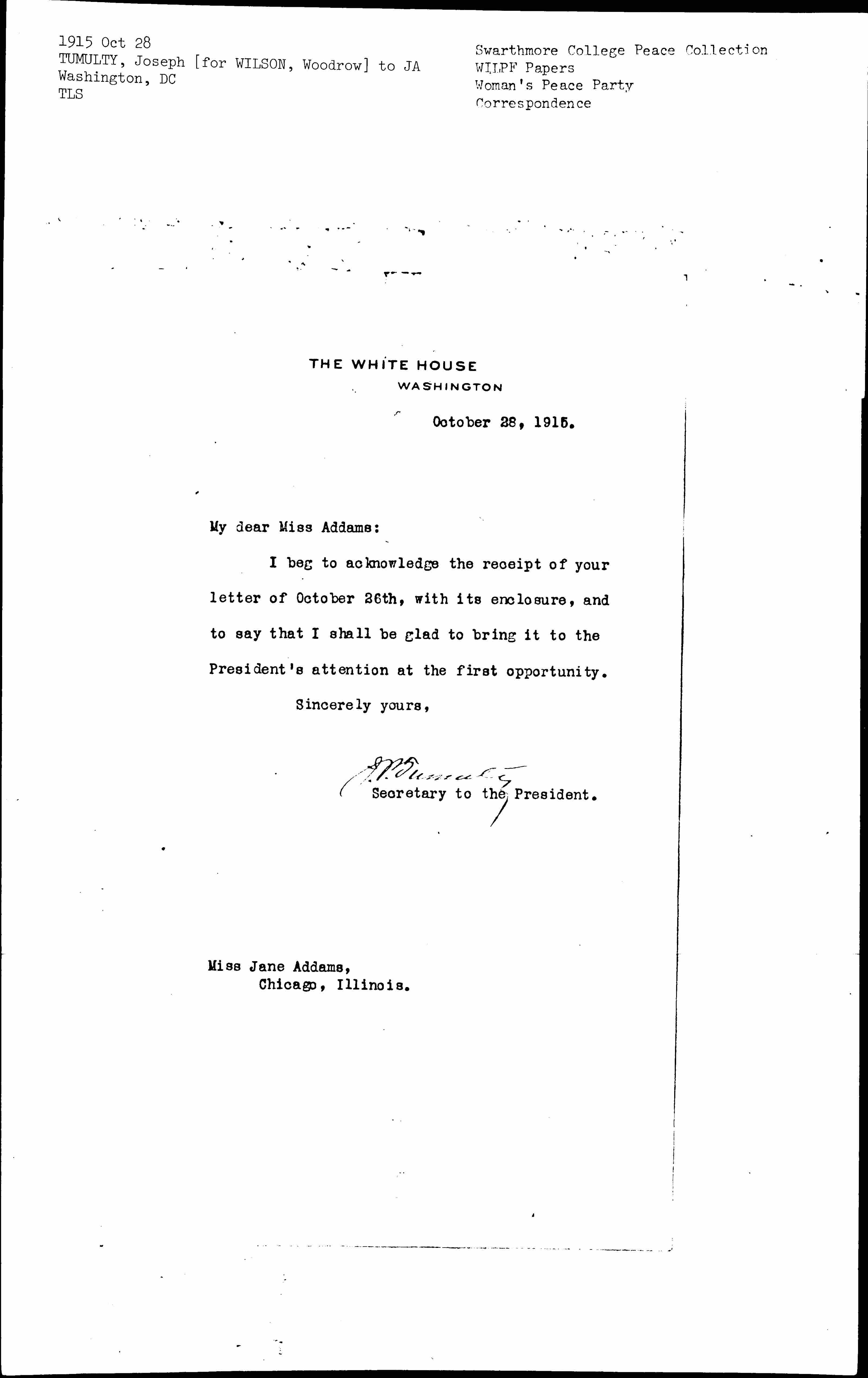 I beg to acknowledge the receipt of your letter of October 26th, with its enclosure, and to say that I shall be glad to bring it to the President’s attention at the first opportunity.