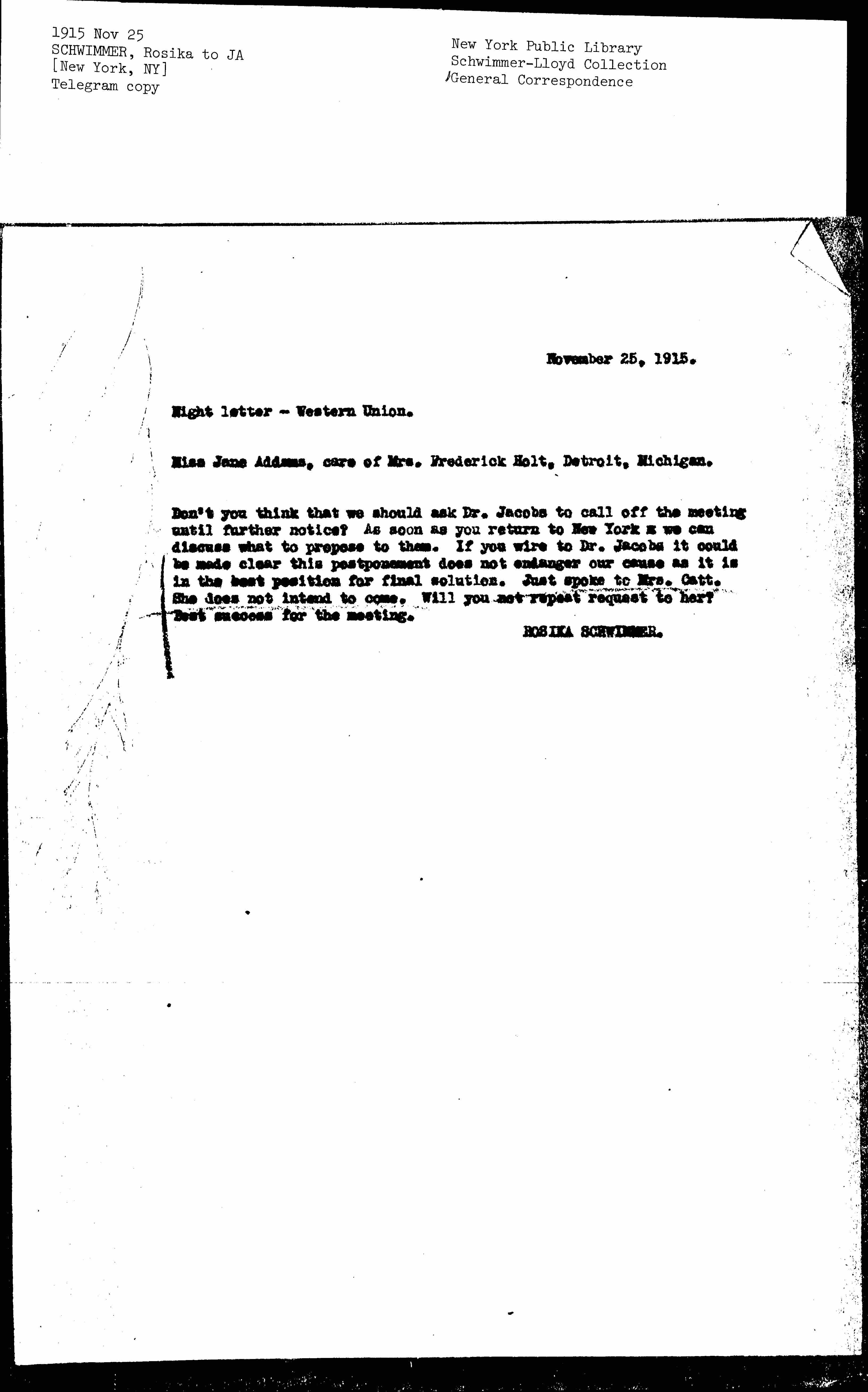 Don't you think that we should ask Dr. Jacobs to call off the meeting until further notice? As soon as you return to New York we can discuss what to propose to them. If you wire to Dr. Jacobs it could be made clear this postponement does not endanger our cause as it is in the best position for final solution. Just spoke to Mrs. Catt. She does not intend to come. Will you not repeat request to her?