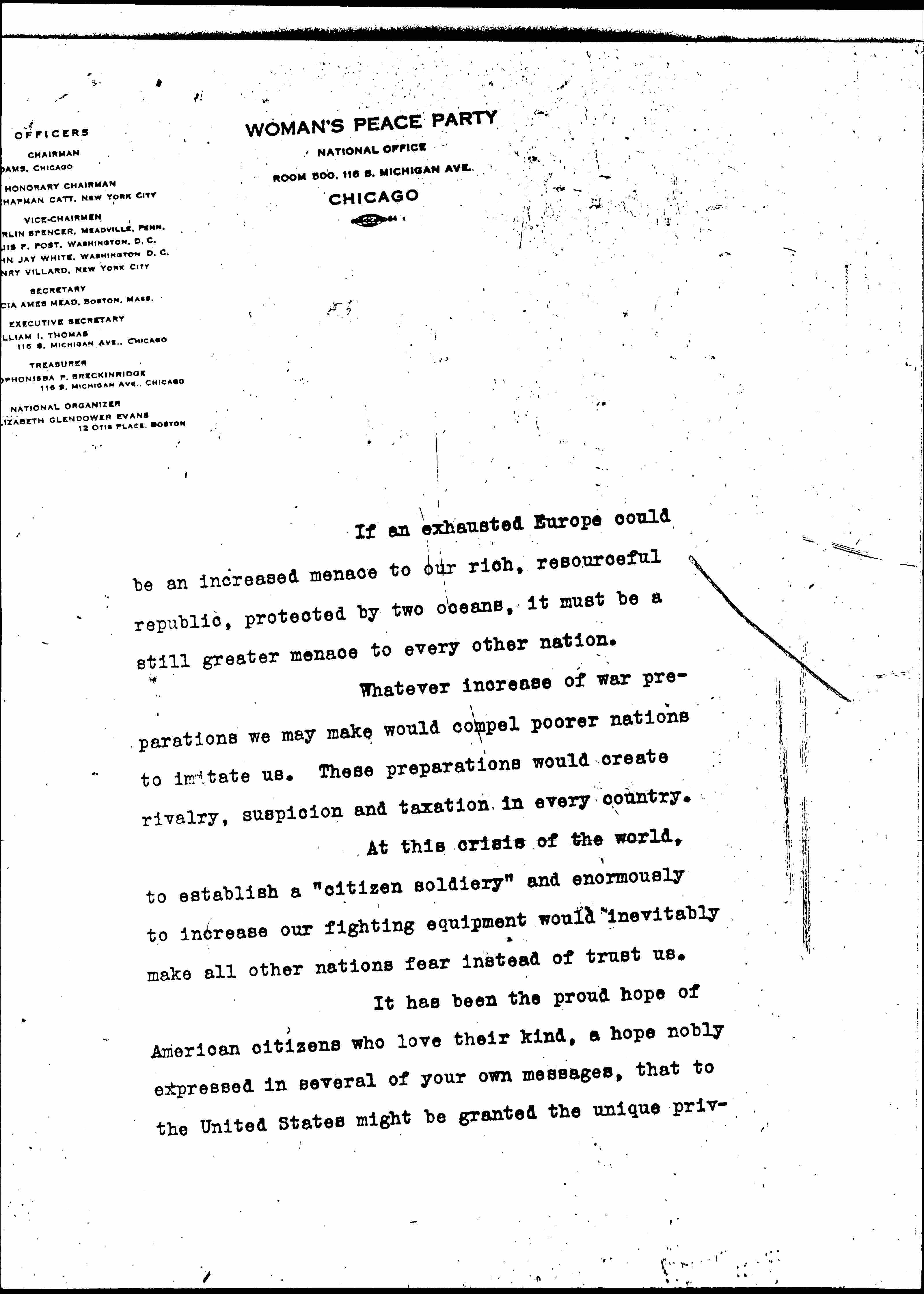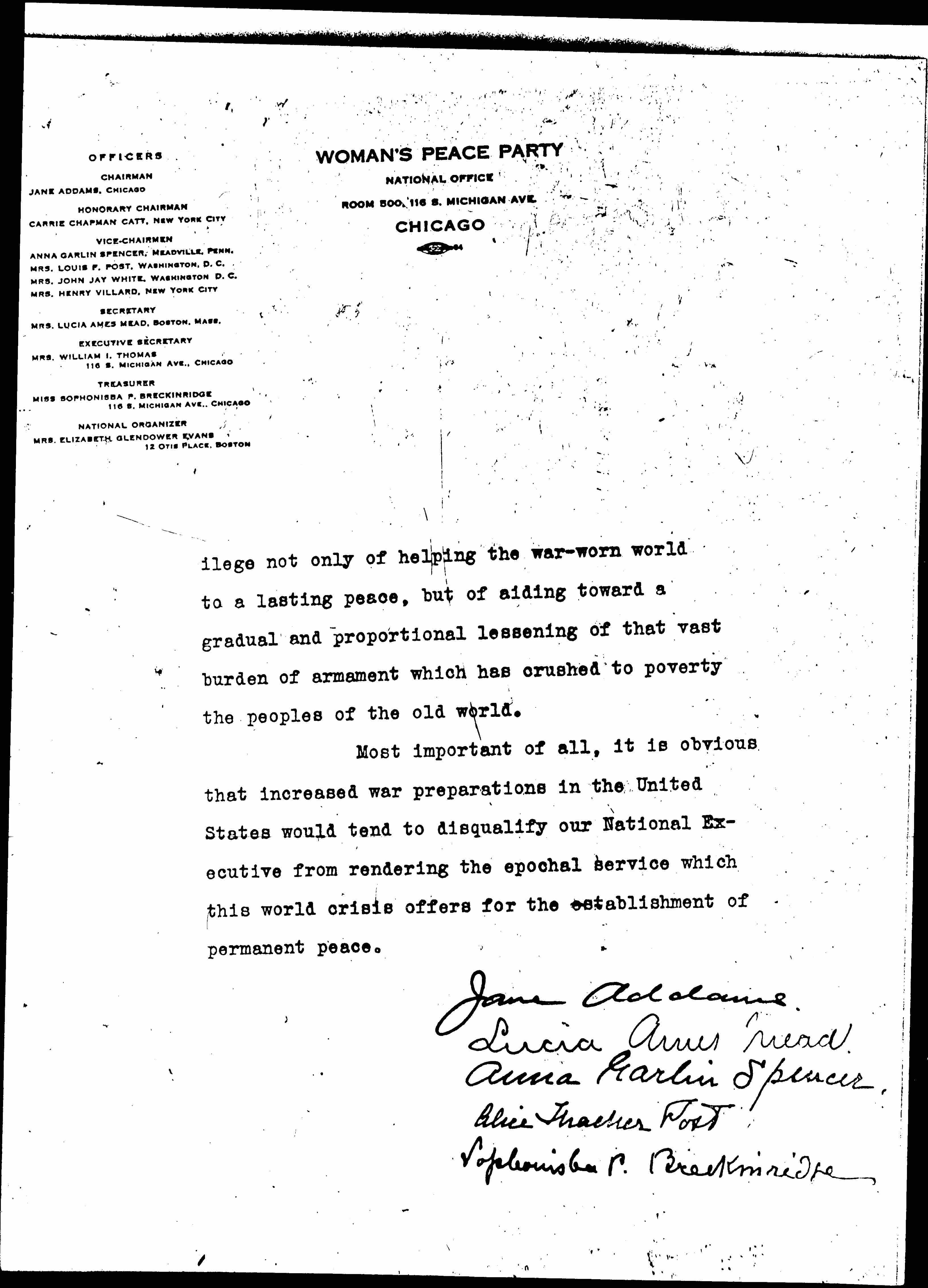 Feeling sure that you wish to get from all sources the sense of the American people in regard to great national questions, officers of the Woman's Peace Party venture to call to your attention certain views which they have reason to believe are widespread, although finding no adequate expression in the press.