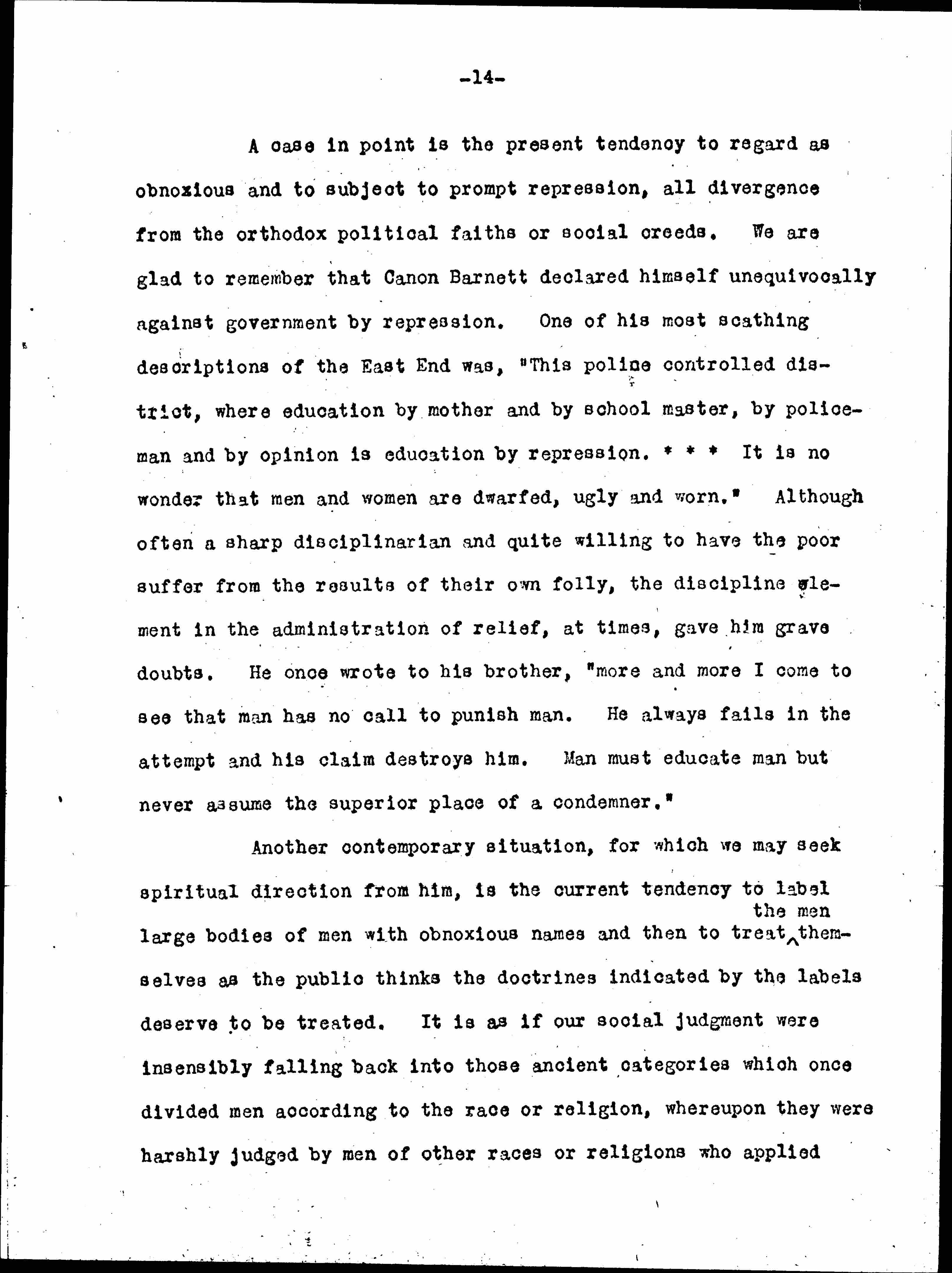 A case in point is the present tendency to regard as obnoxious and to subject to prompt repression, all divergence from the orthodox political faiths or social creeds. We are glad to remember that Canon Barnett declared himself unequivocally against government by repression. One of his most scathing descriptions of the East End was, "This police controlled district, where education by mother and by school master, by policemen and by opinion is education by repression. * * * It is no wonder that men and women are dwarfed, ugly and worn." Although often a sharp disciplinarian and quite willing to have the poor suffer from the results of their own folly, the discipline element in the administration of relief, at times, gave him grave doubts. He once wrote to his brother, "more and more I come to see that man has no call to punish man. He always fails in the attempt and his claim destroys him. Man must educate man but never assume the superior place of a condemner."