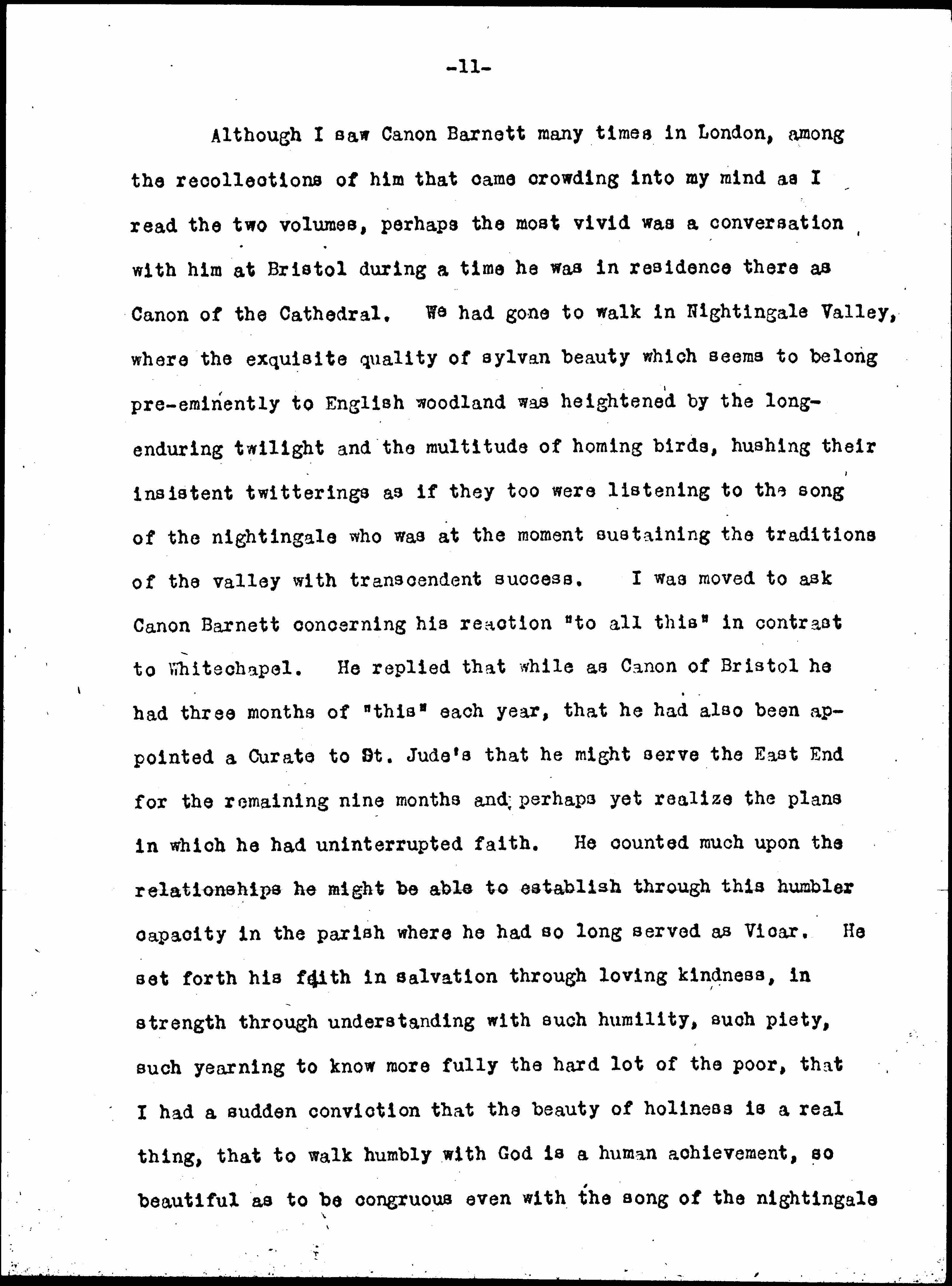 Although I saw Canon Barnett many times in London, among the recollections of him that came crowding into my mind as I read the two volumes, perhaps the most vivid was a conversation with him at Bristol during a time he was in residence there as Canon of the Cathedral. We had gone to walk in Nightingale Valley, where the exquisite quality of sylvan beauty which seems to belong [preeminently] to the English woodland was heightened by the long-enduring twilight and the multitude of homing birds, hushing their insistent twitterings as if they too were listening to the song of the nightingale who was at the moment sustaining the traditions of the valley with transcendent success. I was moved to ask Canon Barnett concerning his reaction "to all this" in contrast to Whitechapel. He replied that while as Canon of Bristol he had three months of "this" a year, that he has also been appointed a Curate to St. Jude's that he might serve the East End for the remaining nine months and perhaps even yet realize the plans in which he had uninterrupted faith. He counted much upon the relationship he might be able to establish through this humbler capacity in the parish where he had so long served as Vicar. He set forth his faith in salvation through loving kindness, in strength through understanding with such humility, such piety, such yearning to know more fully the hard lot of the poor, that I had a sudden conviction that the beauty of holiness is a real thing, that to walk humbly with God is a human achievement, so beautiful as to be congruous even with the song of the nightingale [page 12] and with evening light shining through the boles of trees. I was further convinced that it was not inevitable that we should always experience a peculiar disappointment, a sense of conspicuous failure when human nature inadvertently measured itself by a moment of poignant beauty in the outer world.