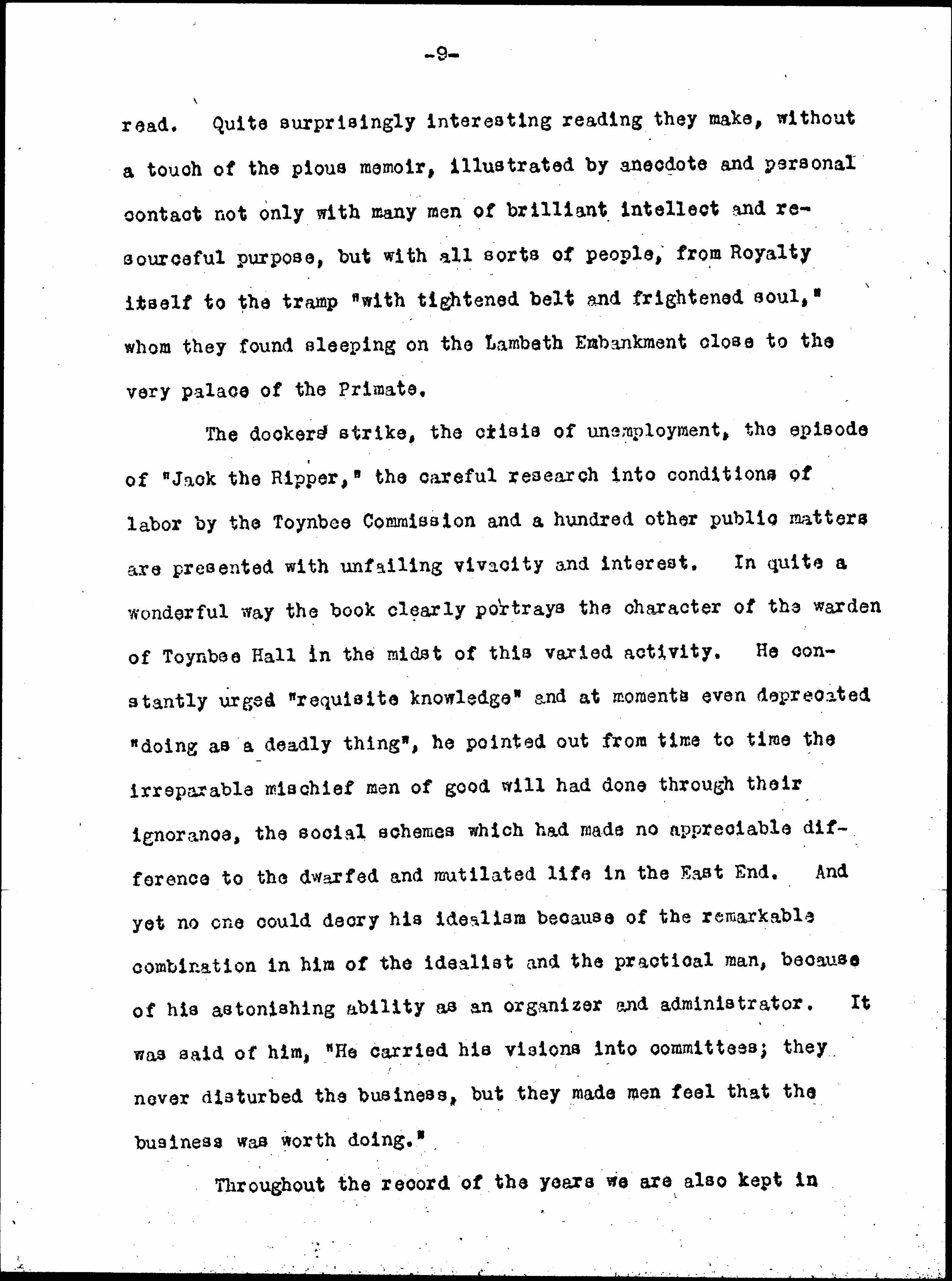 The dockers' strike, the crisis of unemployment, the episode of "Jack the Ripper," the careful research into conditions of labor by the Toynbee Commission and a hundred other public matters are presented with unfailing vivacity and interest. In quite a wonderful way the book clearly portrays the character of the warden of Toynbee Hall in the midst of this varied activity. He constantly urged "requisite knowledge" and at moments even deprecated "doing as a deadly thing", he pointed out from time to time the irreparable mischief men of good will had done through their ignorance, the social schemes which had made no appreciable difference to the dwarfed and mutilated life in the East End. And yet no one could decry his idealism because of the remarkable combination in him of the idealist and the practical man, because of his astonishing ability as an organizer and administrator. It was said of him, "He carried his visions into committees; they never disturbed the business, but they made men feel that the business was worth doing."