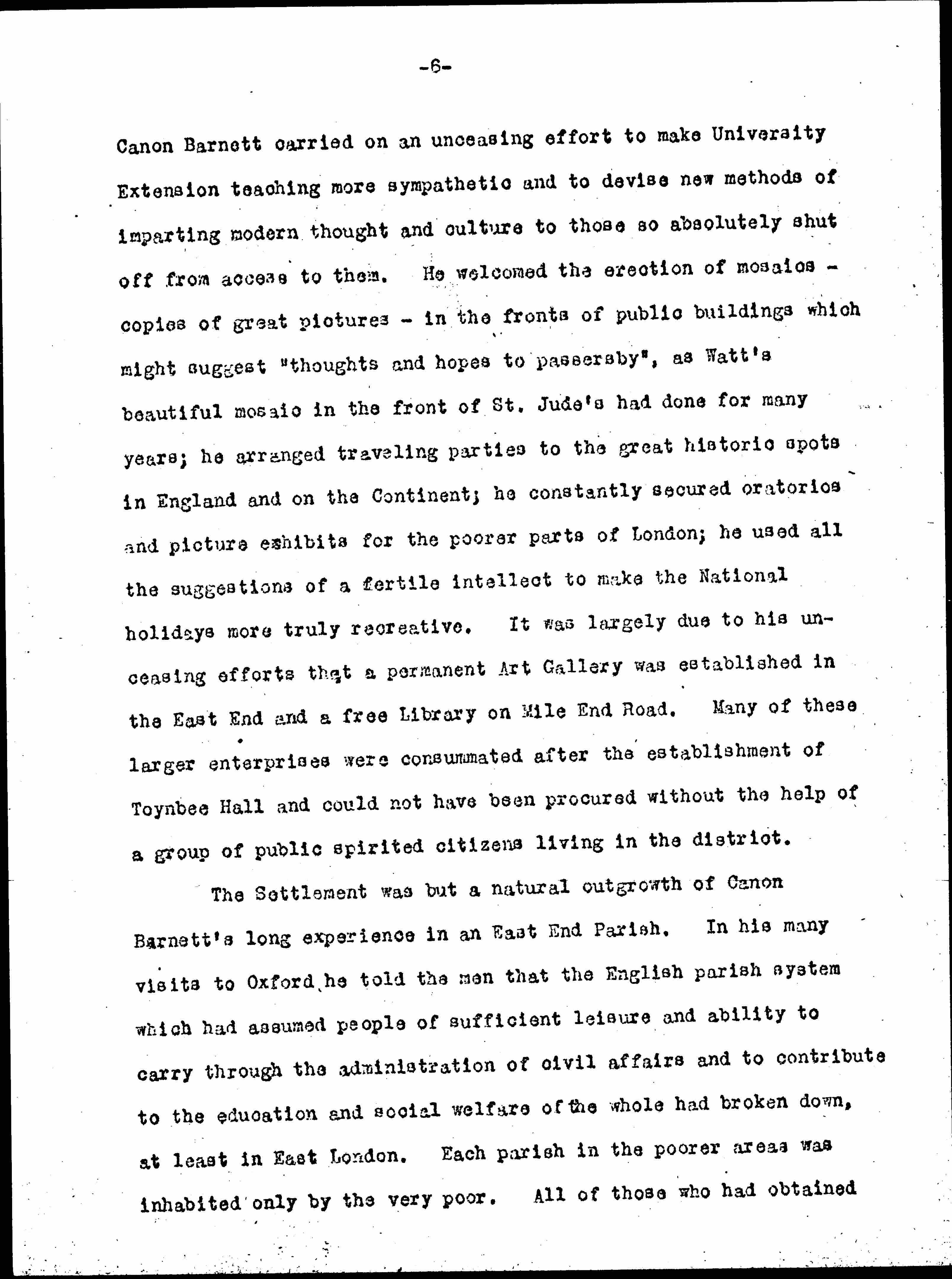 ↑But↓ For it was, after all, the daily life of the sodden hopeless adults which they found most heartbreaking. Because of his passionate devotion to education and to the affairs of the mind [page 6] Canon Barnett carried on an unceasing effort to make University Extension teaching more sympathetic and to devise new methods of imparting modern thought and culture to those so absolutely shut off from access to them. He welcomed the erection of mosaics -- copies of great pictures -- in the fronts of public buildings which might suggest "thoughts and hopes to passersby", as Watt's beautiful mosaic in the front of St. Jude's had done for many years; he arranged traveling parties to the great historic spots in England and on the Continent; he constantly secured oratorios and picture exhibits for the poorer parts of London; he used all the suggestions of a fertile intellect to make the National holidays more truly recreative. It was largely due to his unceasing efforts that a permanent Art Gallery was established in the East End and a free library on Mile End Road. Many of these larger enterprises were consummated after the establishment of Toynbee Hall and could not have been procured without the help of a group of public spirited citizens living in the district.